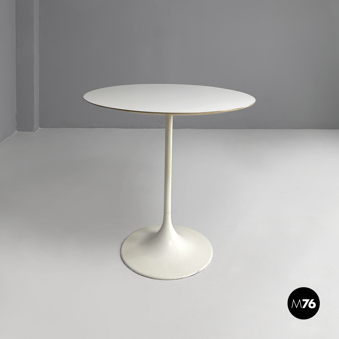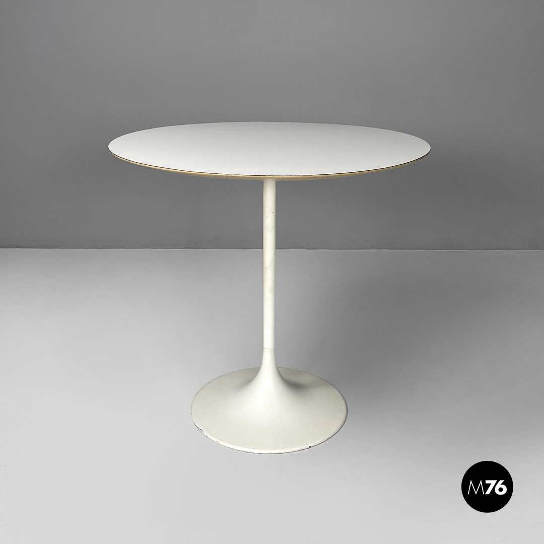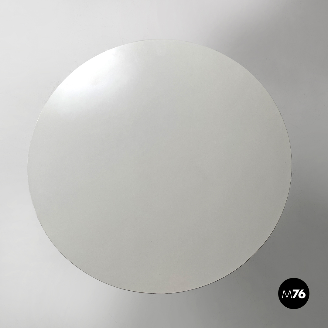 Tavolo da caffè con piano tondo è in legno bianco. Lo stelo centrale è in metallo verniciato bianco con finitura opaca ed ha una forma curar che si allarga all’appoggio a terra.
