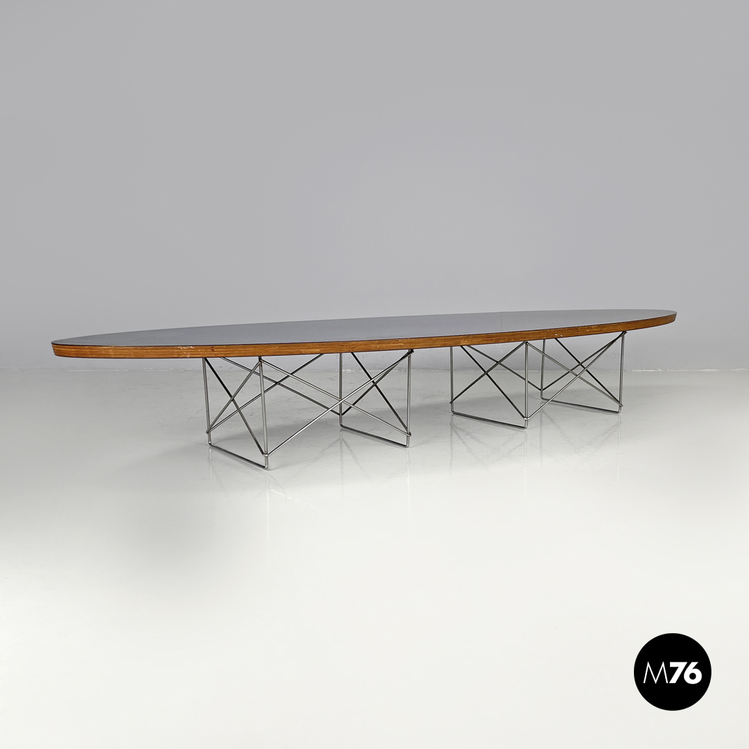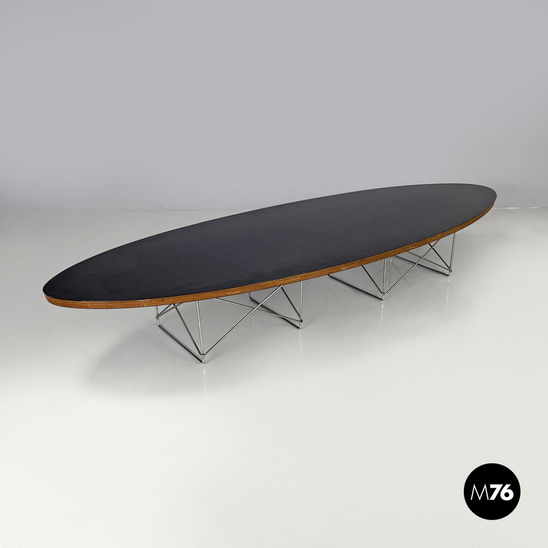 Tavolo da caffè modello ETR con piano ovale in legno rivestito di laminato nero. Il piano allungato ricorda la formati una tavola da surf. La struttura portante è composta da due elementi in tondino di metallo cromato che si incrociano seguendo linee geometriche.
