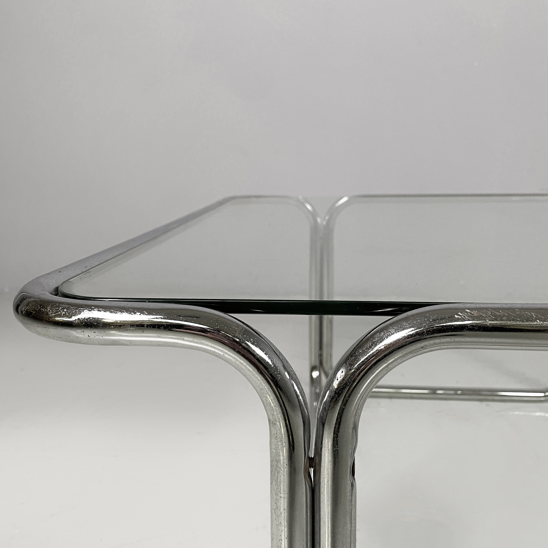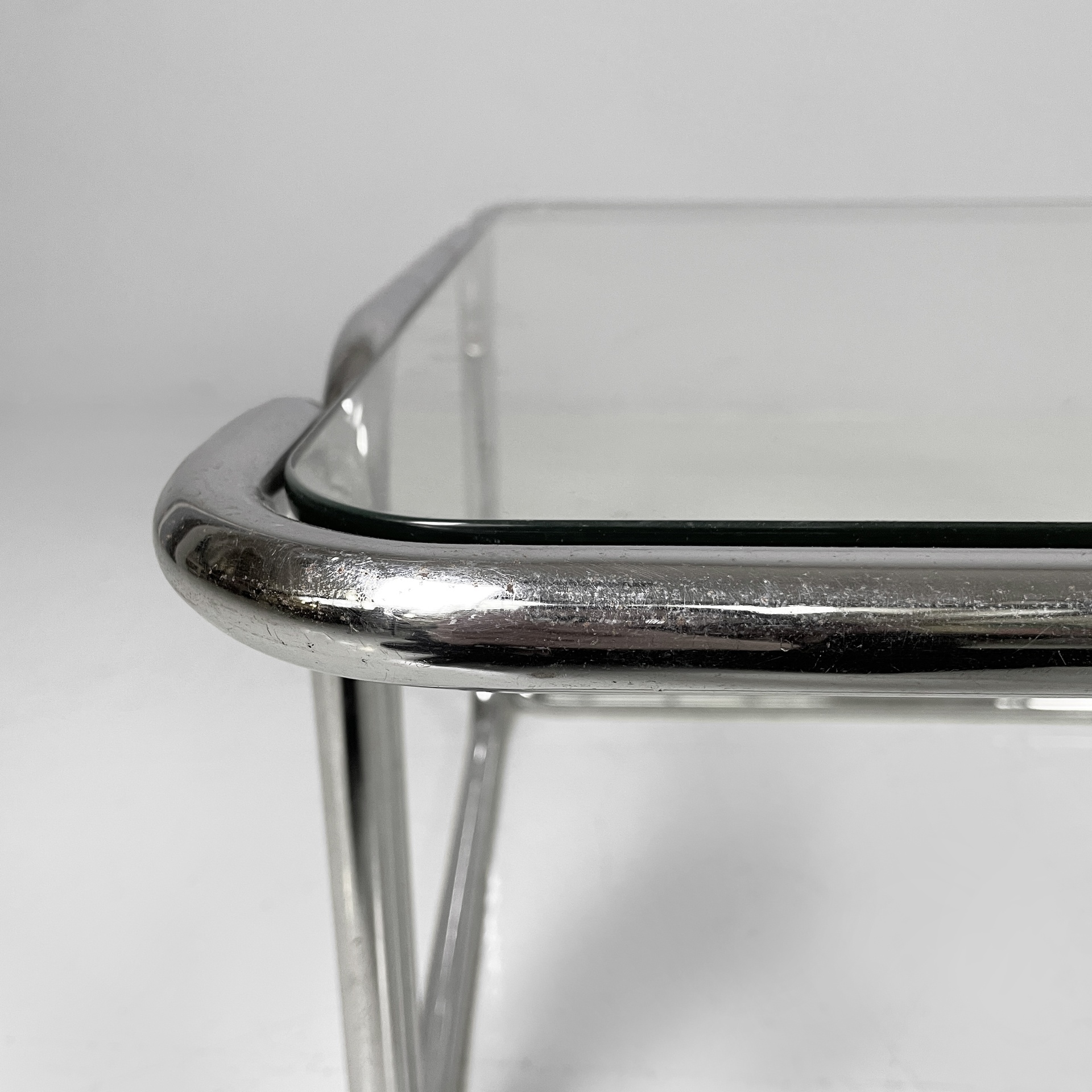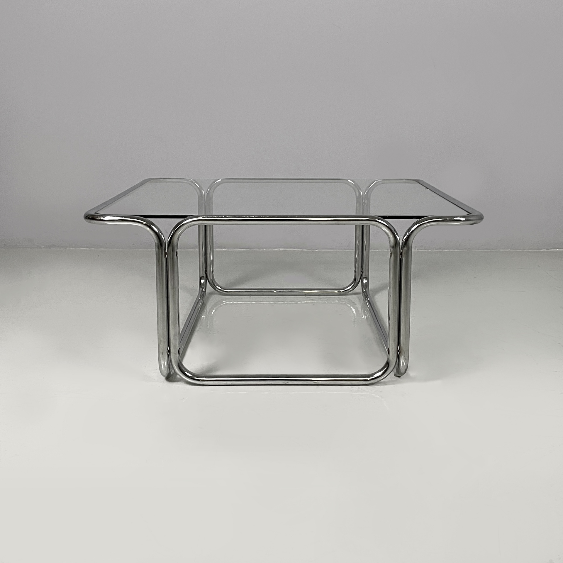 Tavolo da caffè con piano quadrato in vetro. La struttura è interamente in tubolare di acciaio cromato.