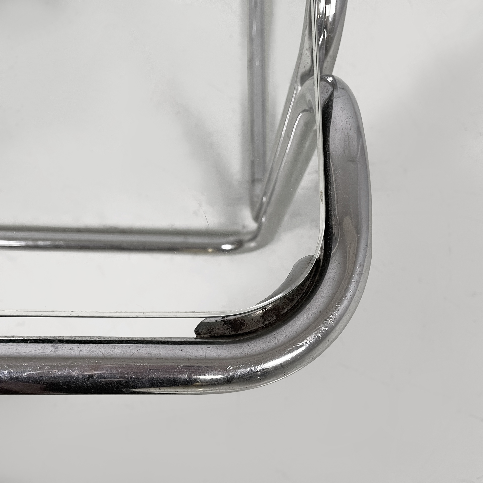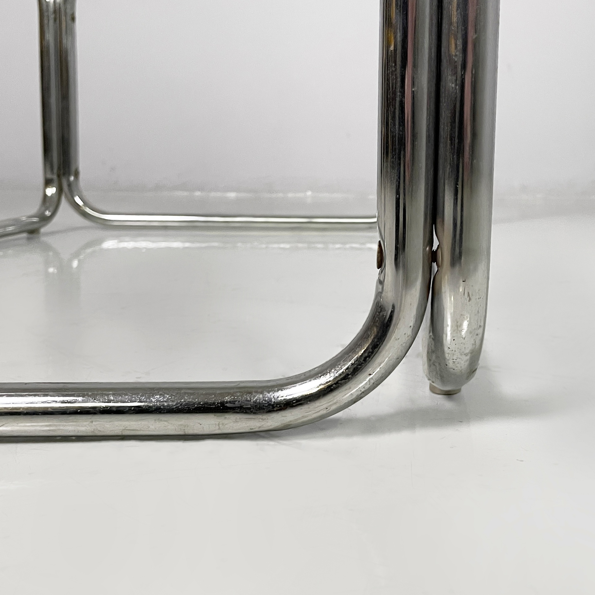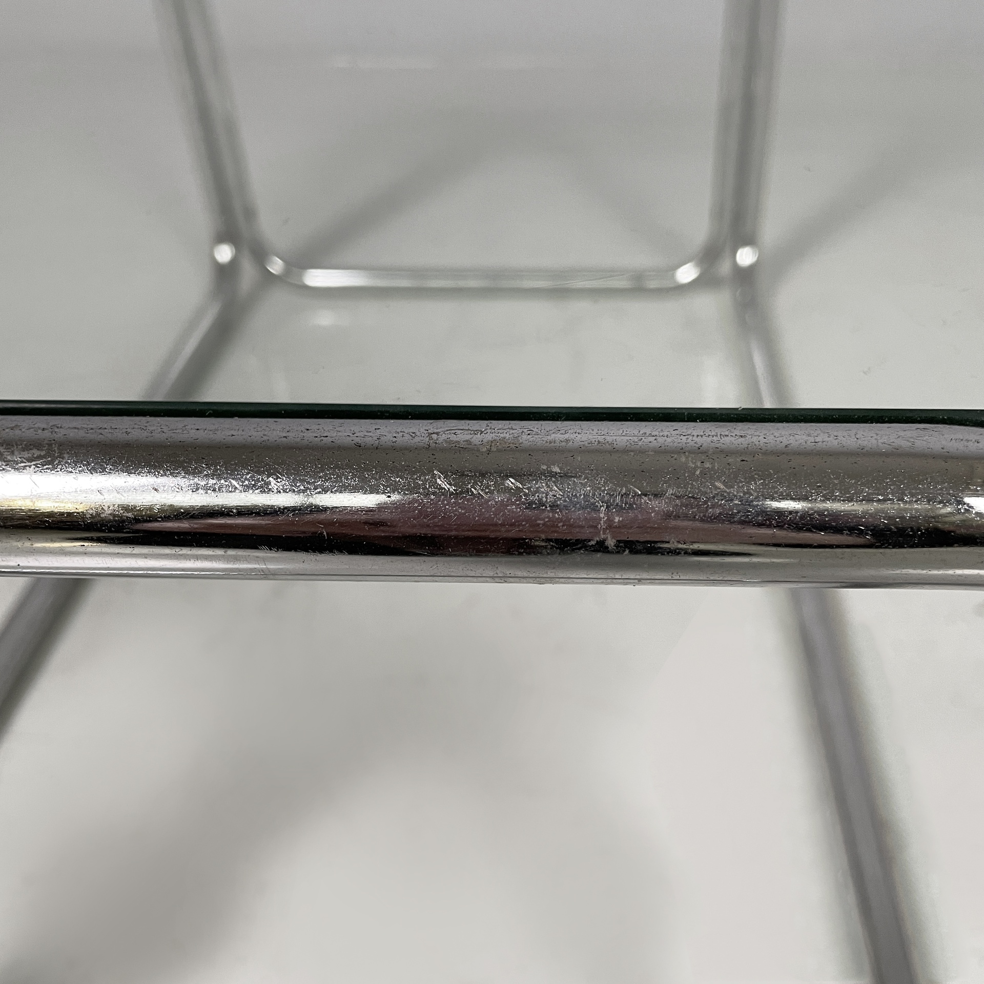 Tavolo da caffè con piano quadrato in vetro. La struttura è interamente in tubolare di acciaio cromato.