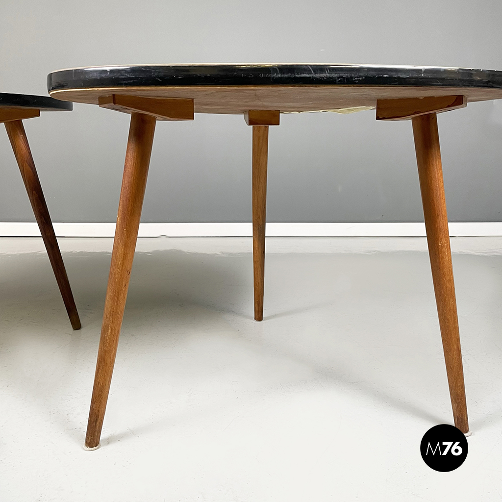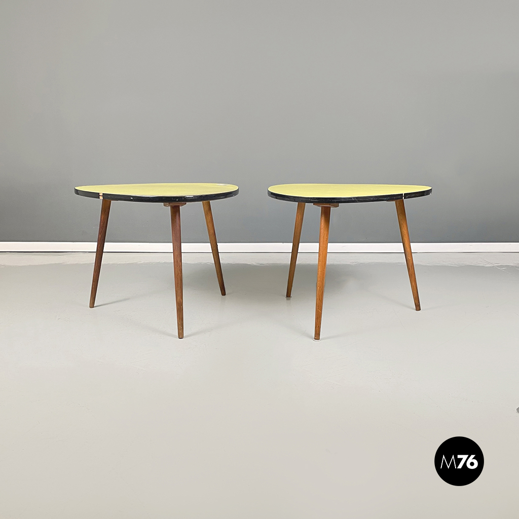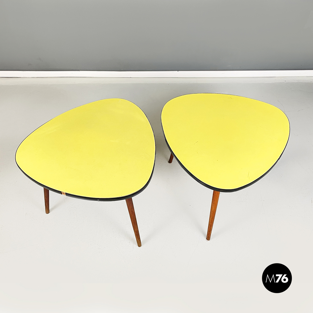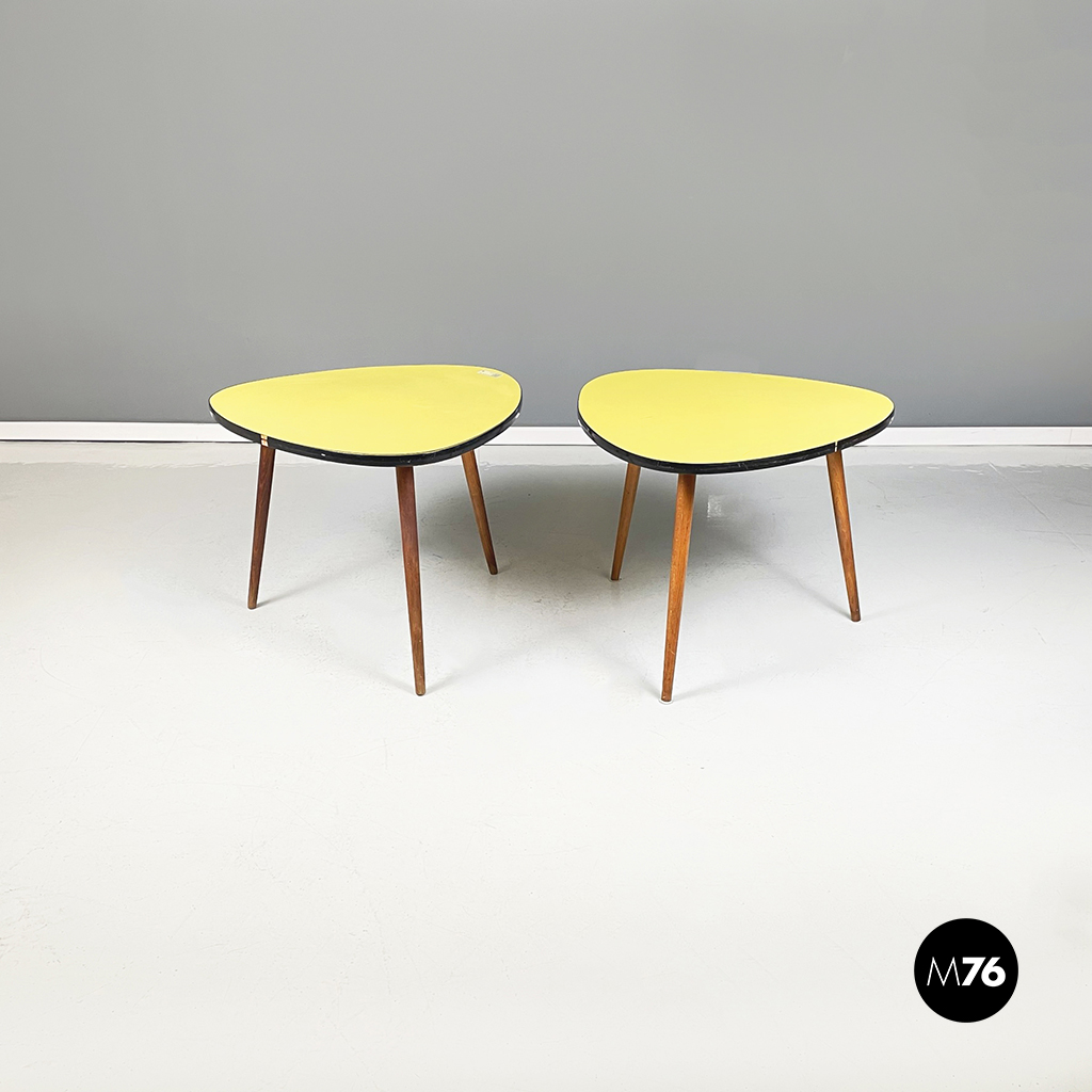 Coppia di tavoli da caffè con piano triangolare ad angoli arrotondati in formica gialla con profilo nero. Le zampe del tavolo sono a sezione tonda in legno massello di faggio.
