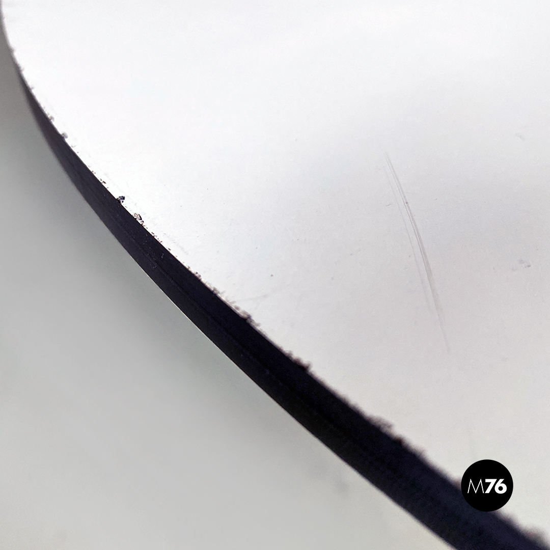 Tavolo da caffè con piano tondo in laminato bianco con bordo nero. Base a tre zampe con triplo tondino di metallo nero e puntali in gomma. Proveniente dal nord europa