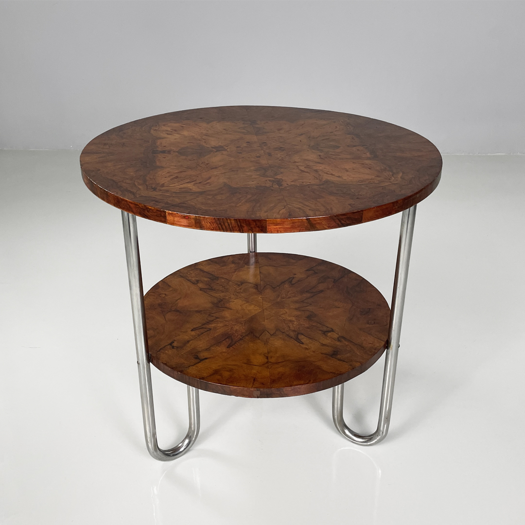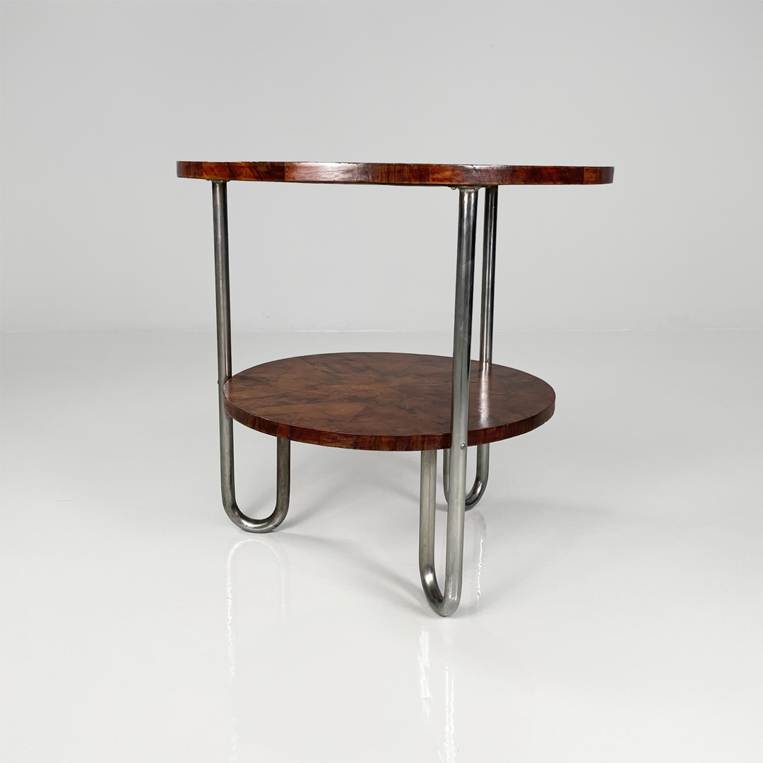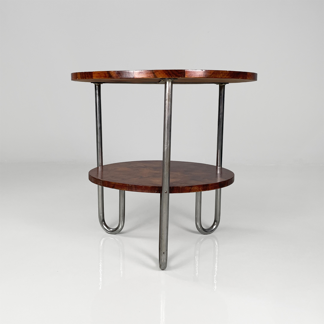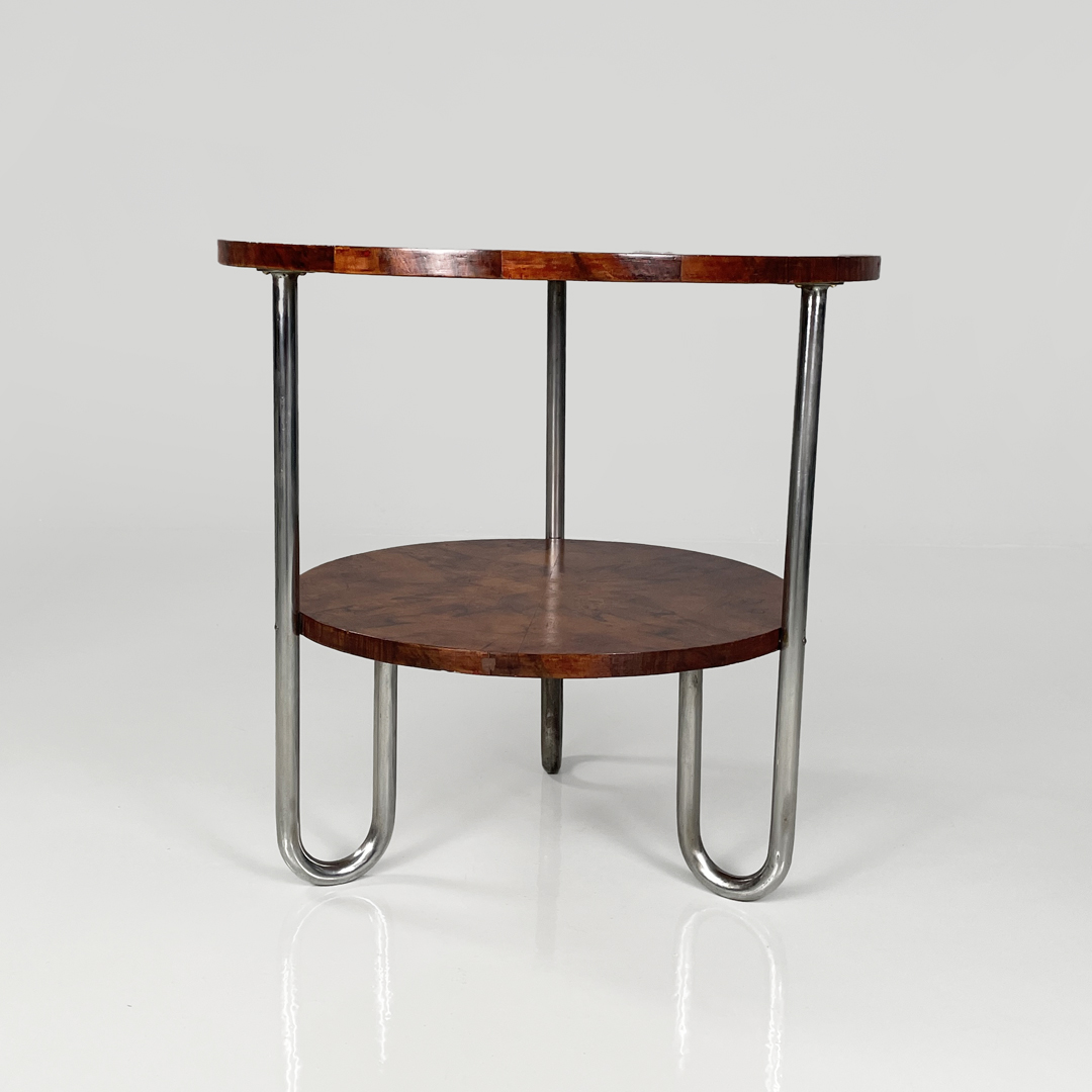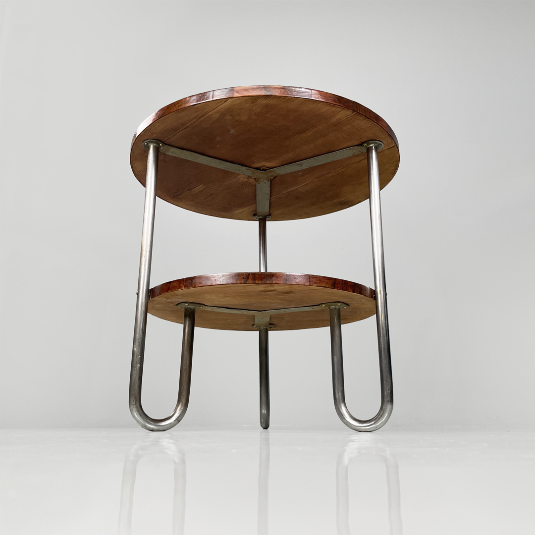 Tavolo da caffè tondo in legno. La struttura è composta da due piani, le tre gambe curve sono in metallo.