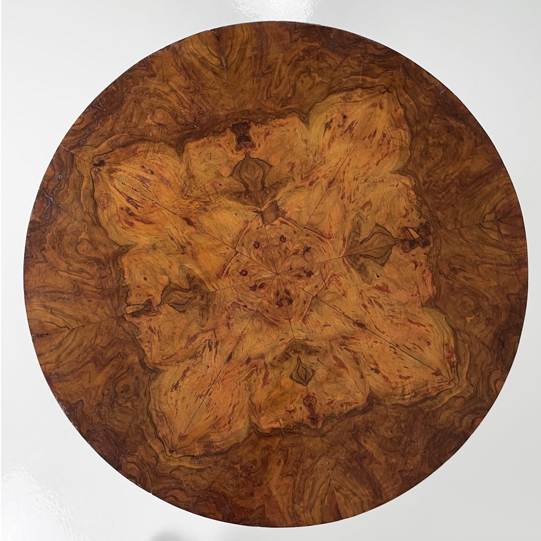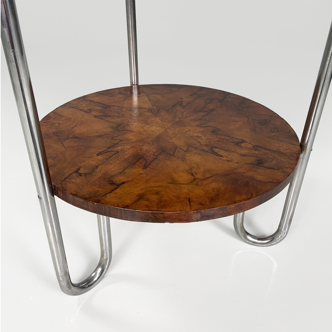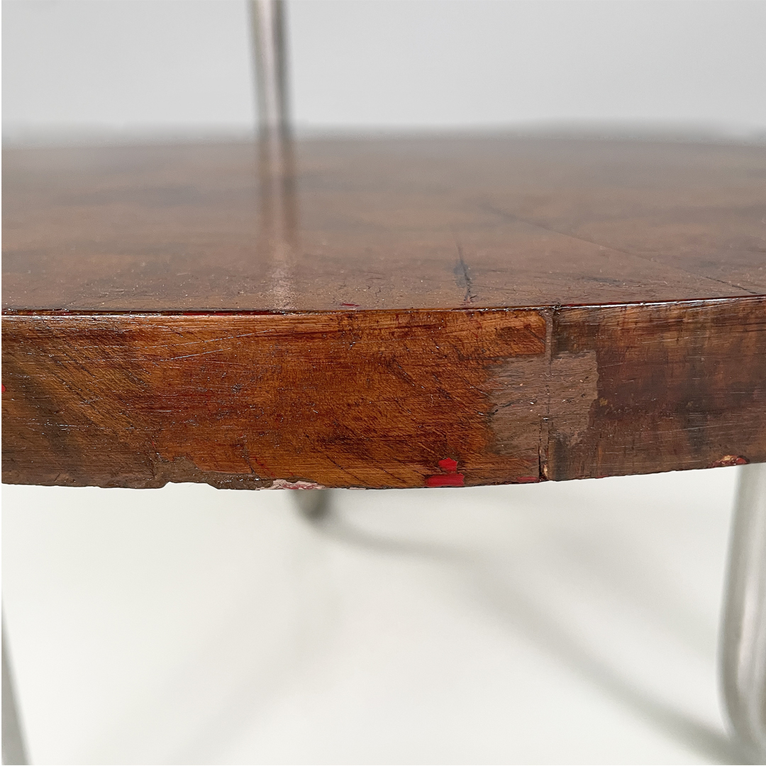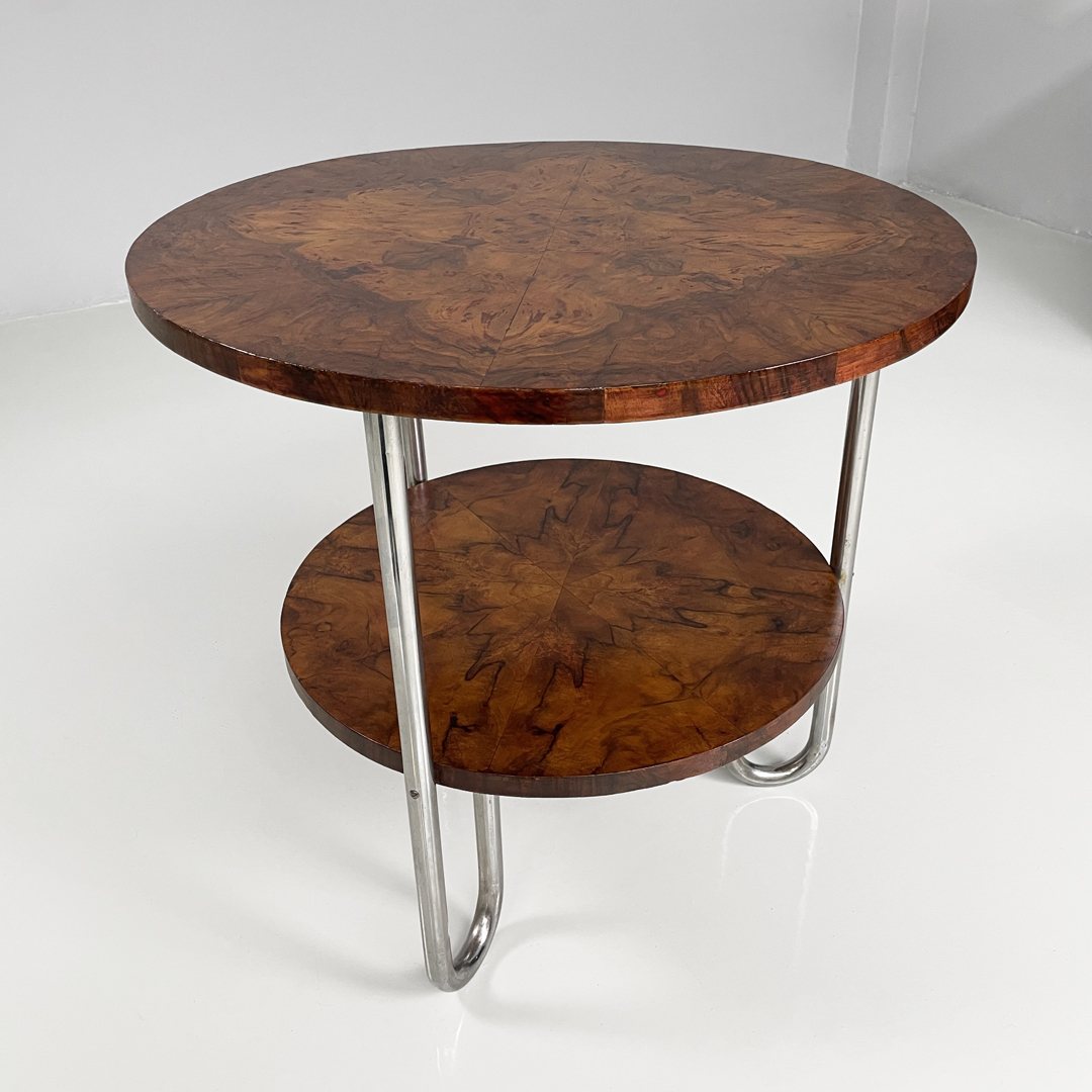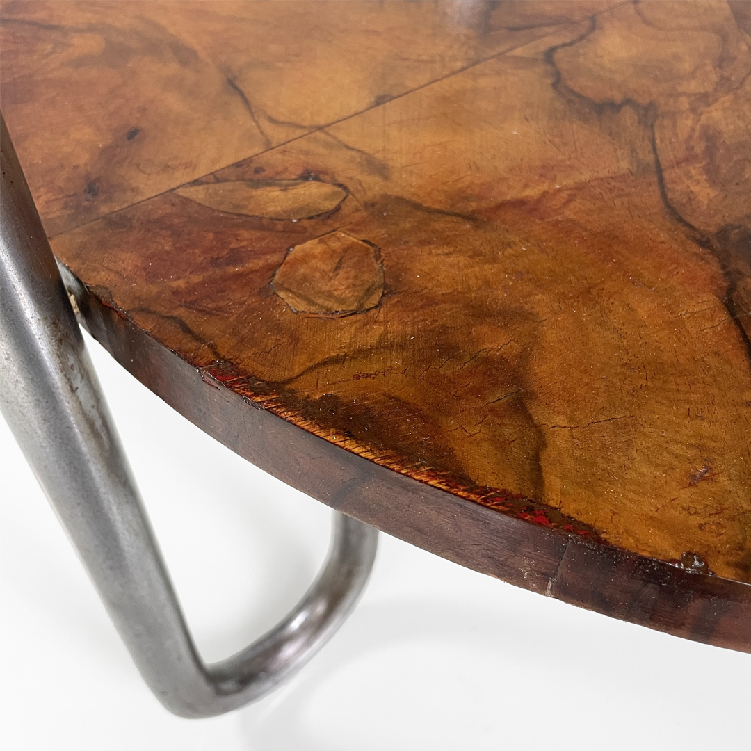 Tavolo da caffè tondo in legno. La struttura è composta da due piani, le tre gambe curve sono in metallo.