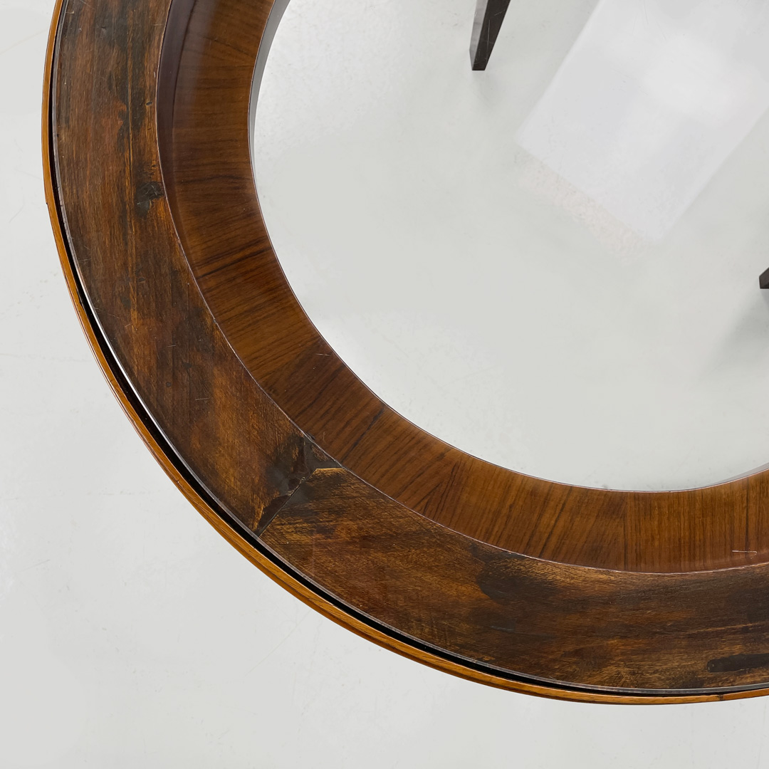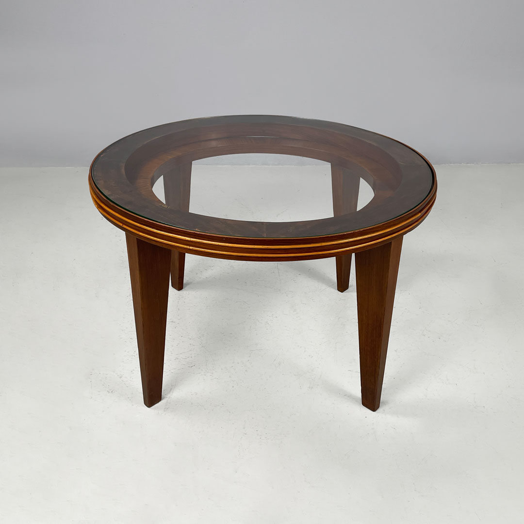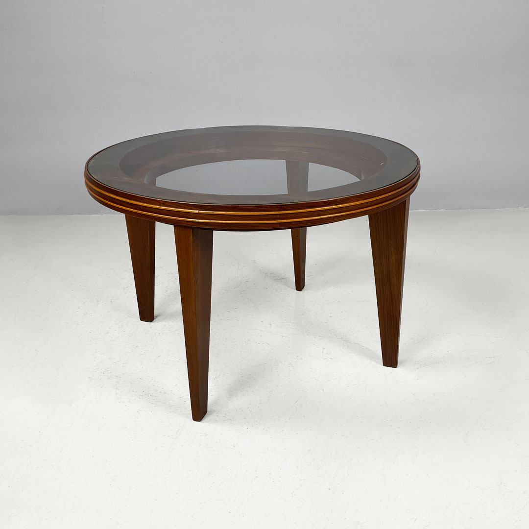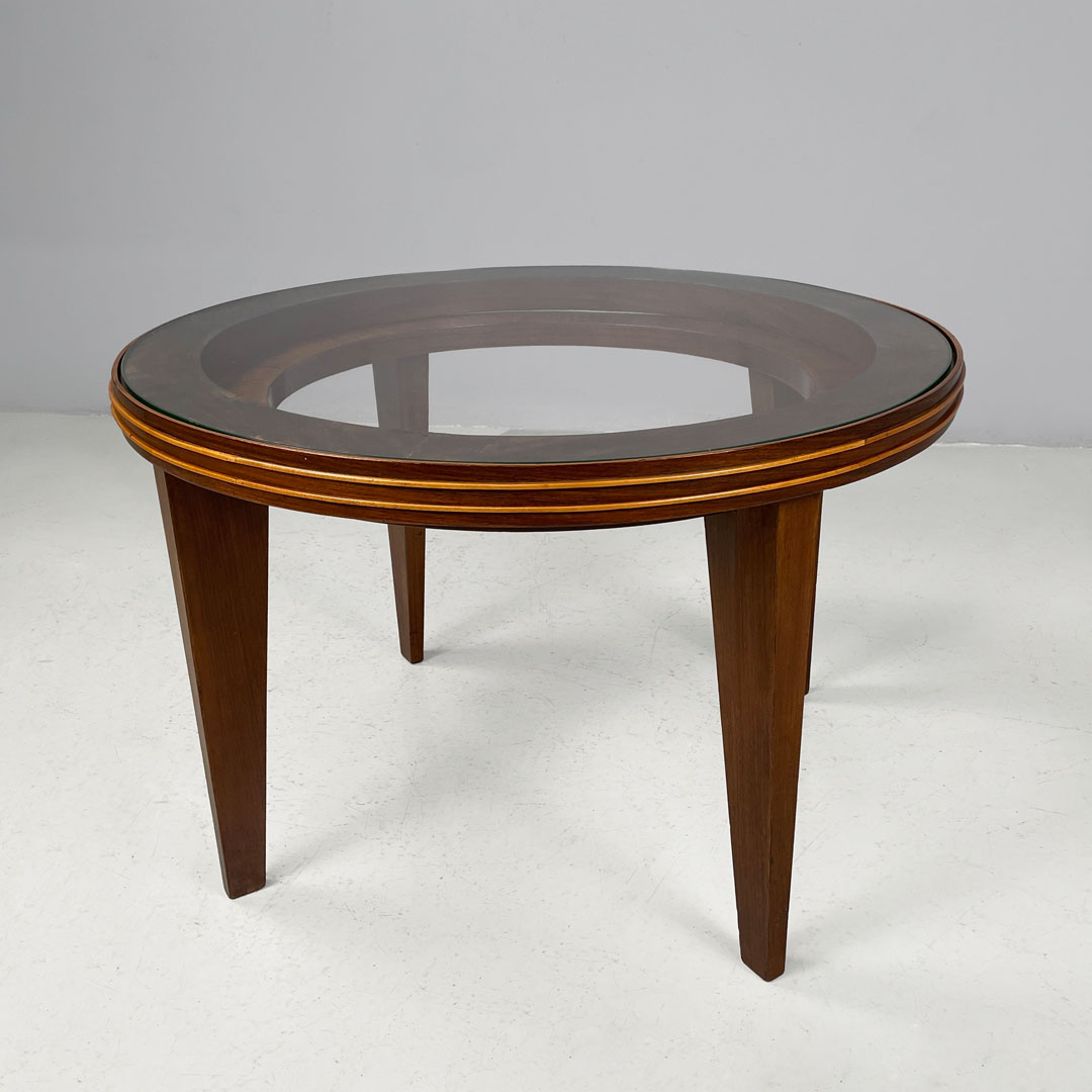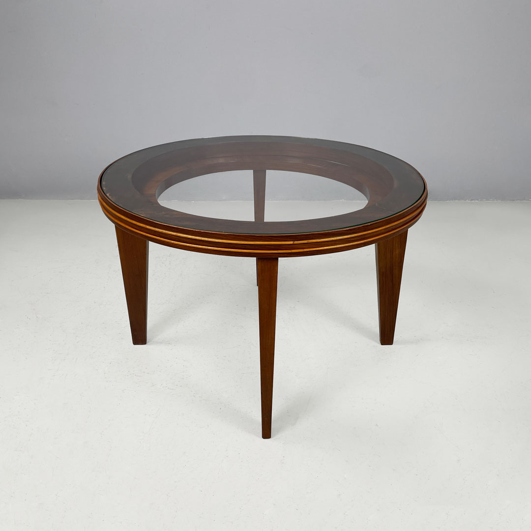 Tavolo da caffè con piano tondo in vetro che poggia su una struttura in legno scuro. Presenta quattro gambe di base rettangolare che si stringono verso il basso. Il bordo è decorato con dettagli in rilievo in legno chiaro che seguono tutta la circonferenza.