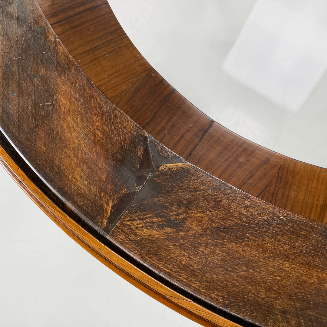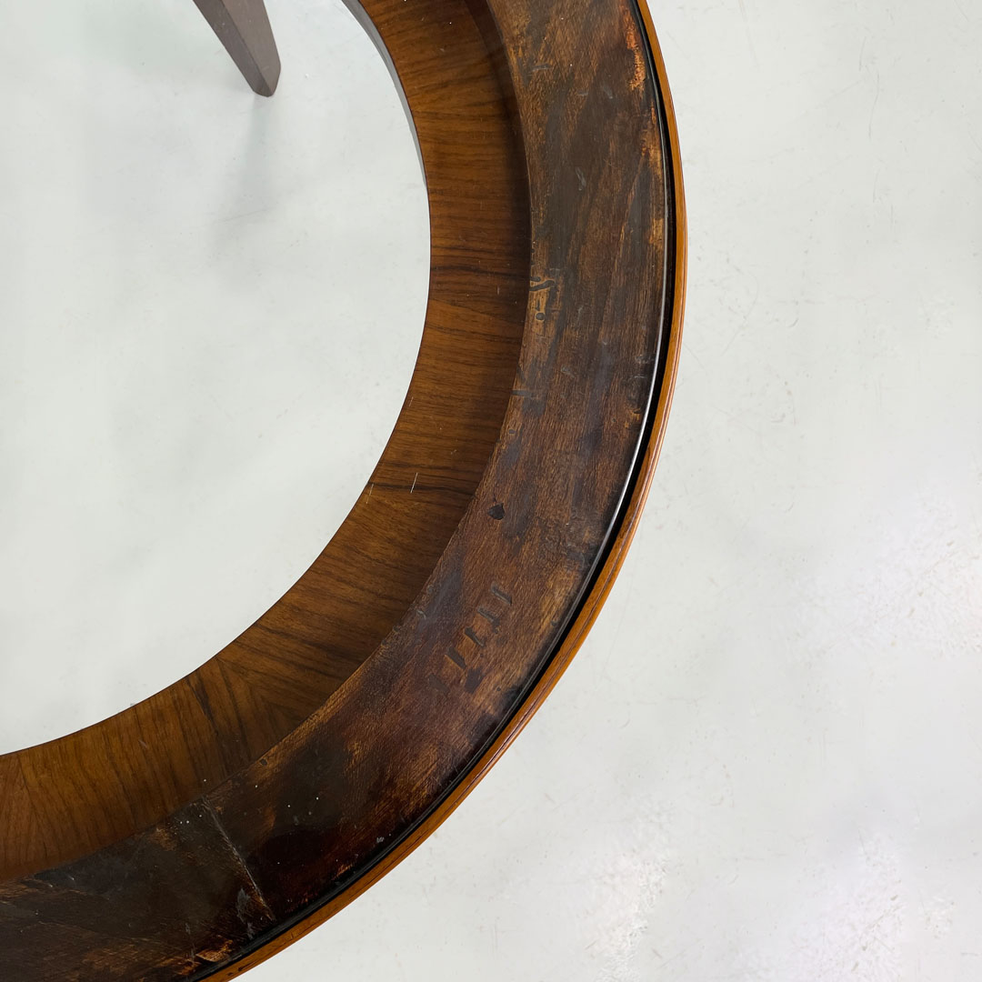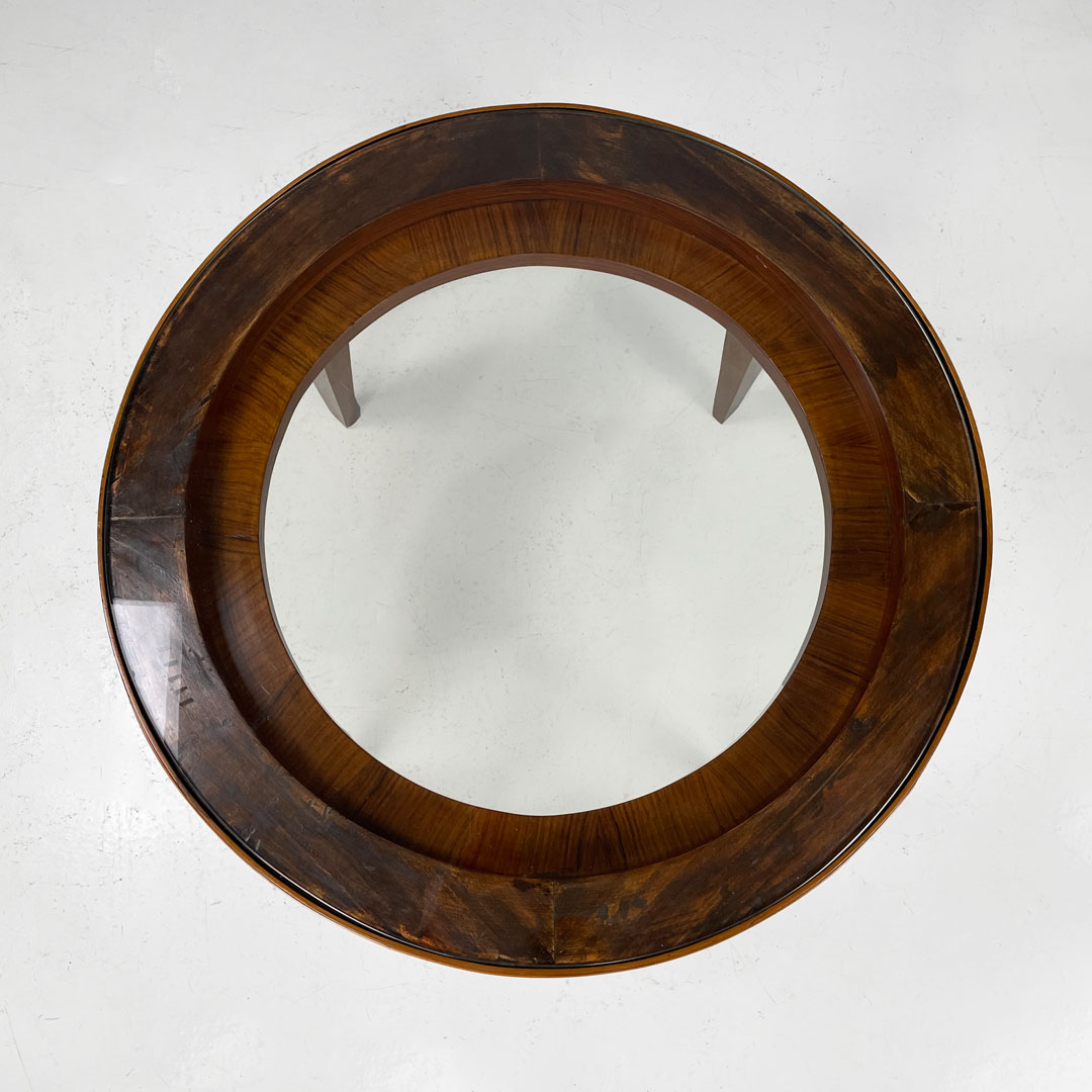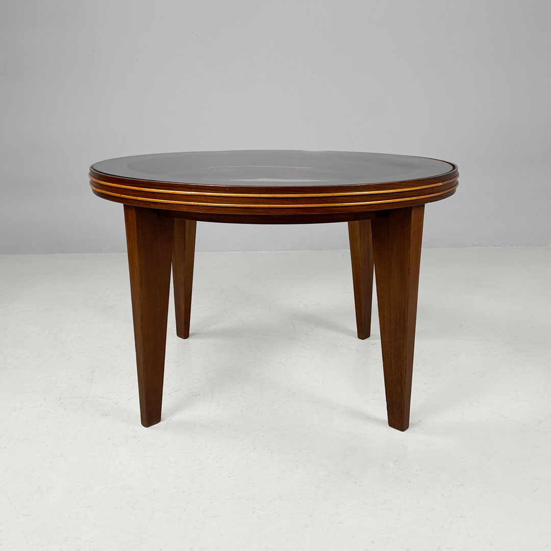 Tavolo da caffè con piano tondo in vetro che poggia su una struttura in legno scuro. Presenta quattro gambe di base rettangolare che si stringono verso il basso. Il bordo è decorato con dettagli in rilievo in legno chiaro che seguono tutta la circonferenza.