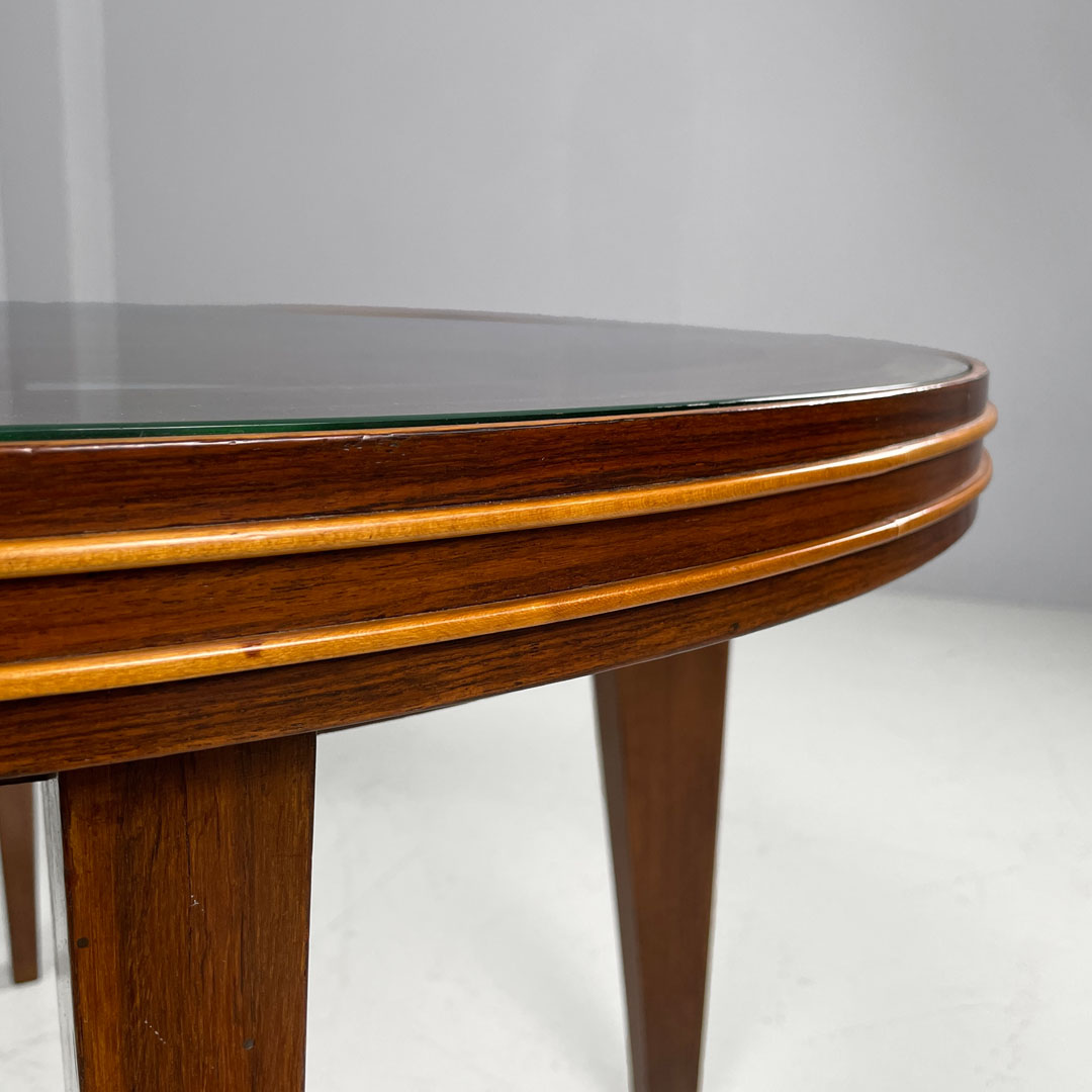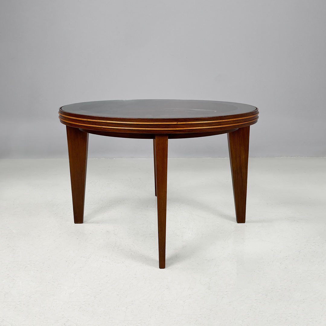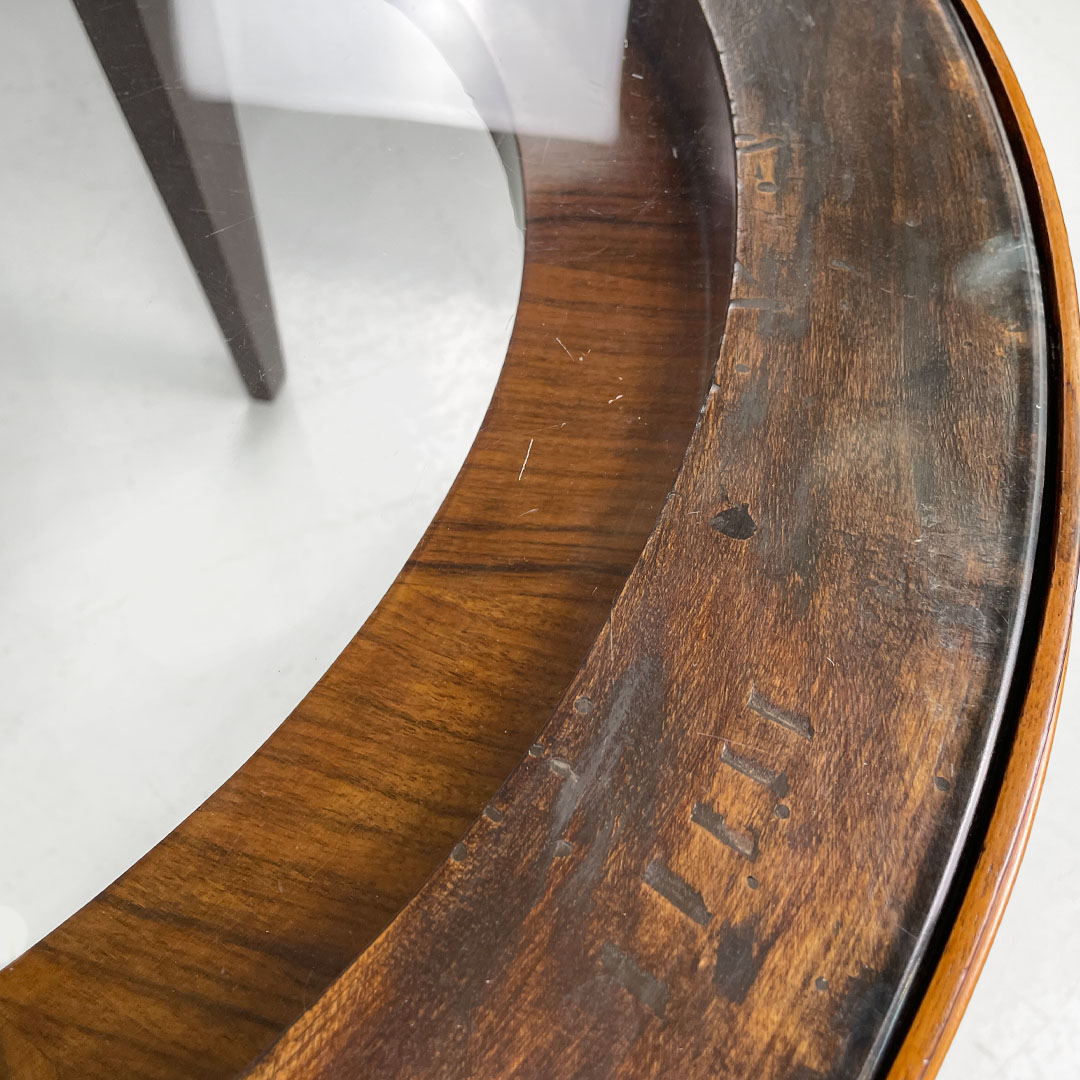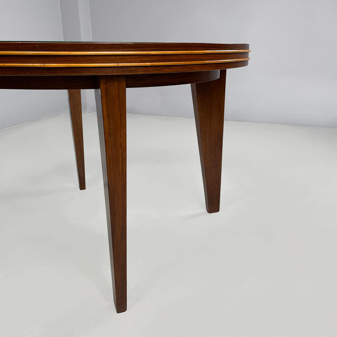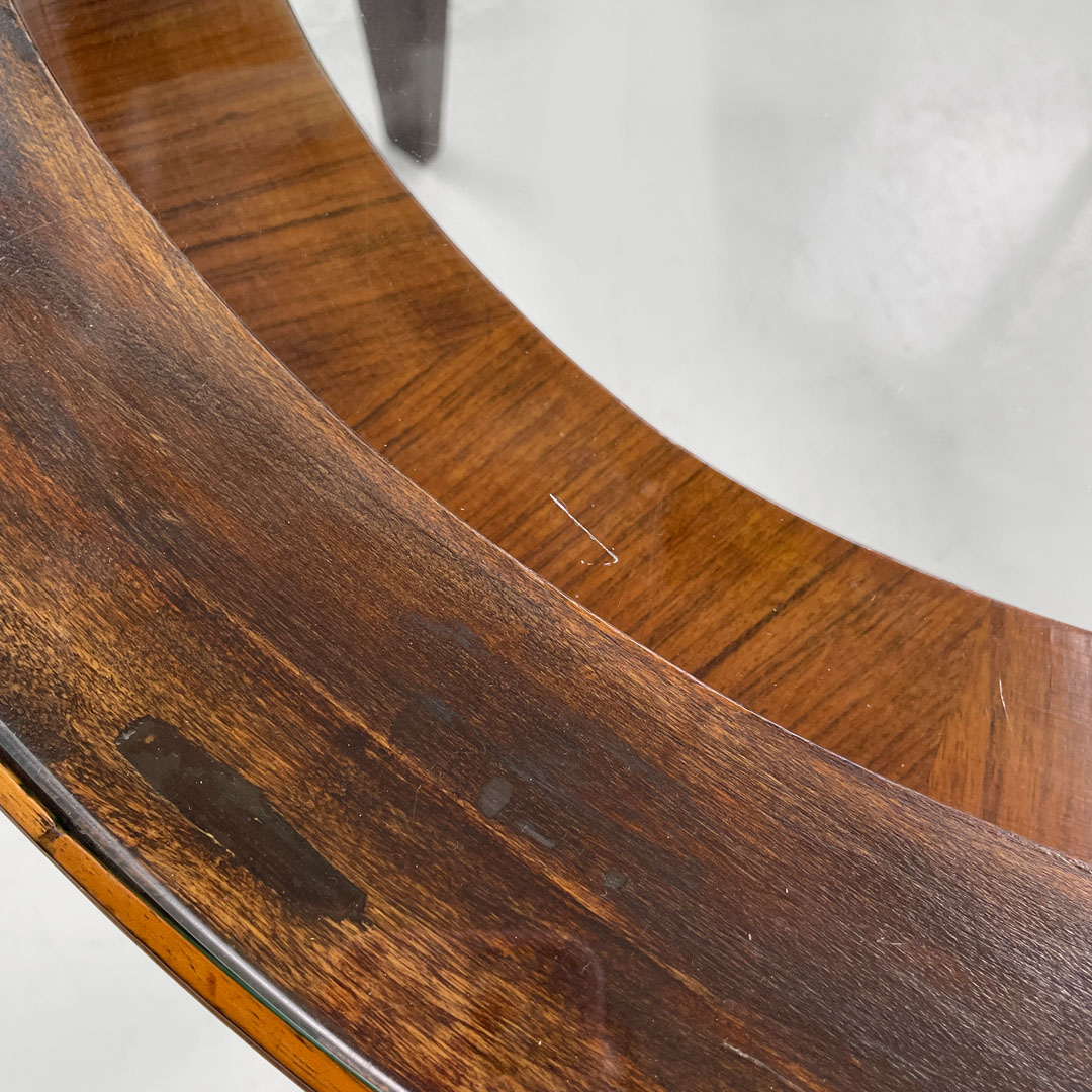 Tavolo da caffè con piano tondo in vetro che poggia su una struttura in legno scuro. Presenta quattro gambe di base rettangolare che si stringono verso il basso. Il bordo è decorato con dettagli in rilievo in legno chiaro che seguono tutta la circonferenza.