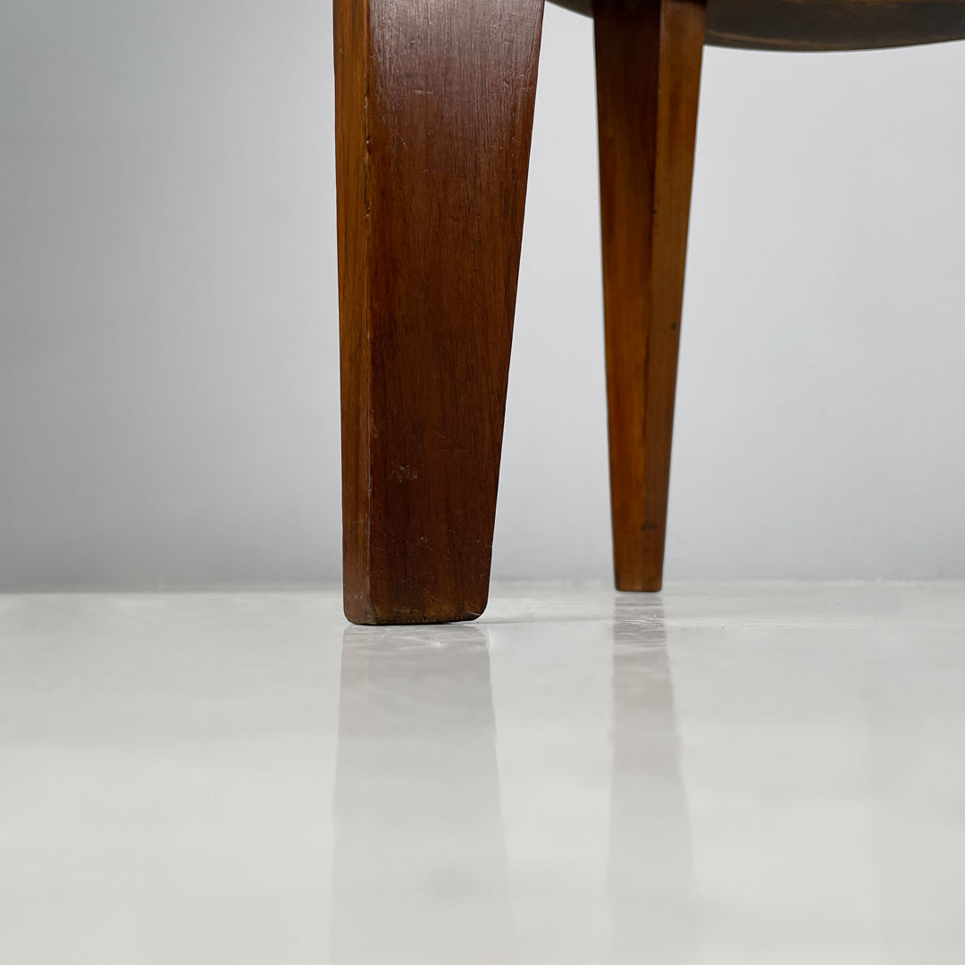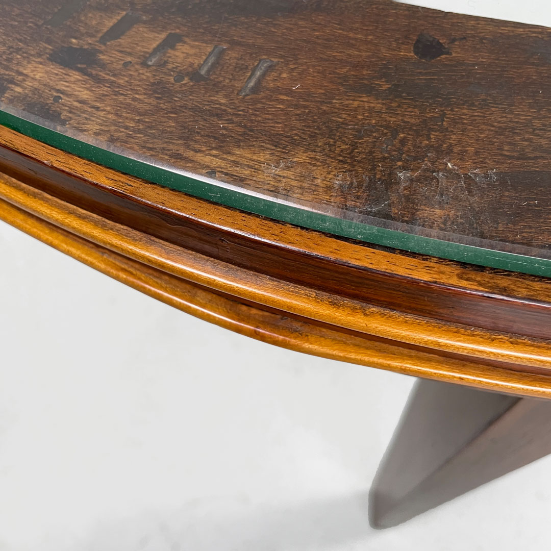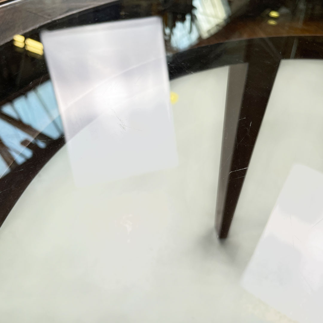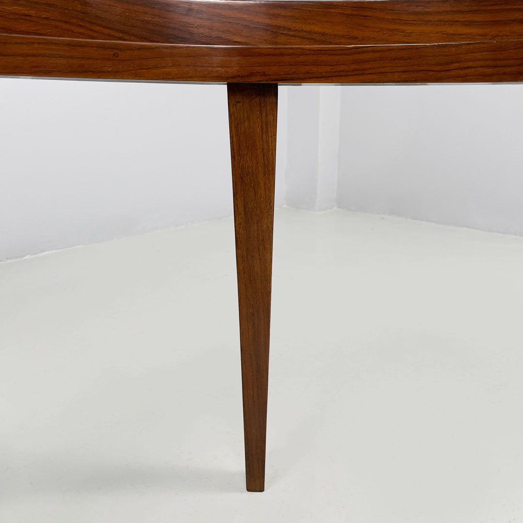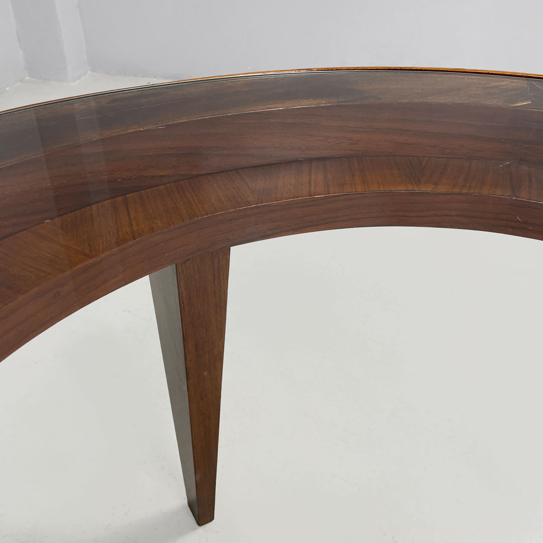 Tavolo da caffè con piano tondo in vetro che poggia su una struttura in legno scuro. Presenta quattro gambe di base rettangolare che si stringono verso il basso. Il bordo è decorato con dettagli in rilievo in legno chiaro che seguono tutta la circonferenza.