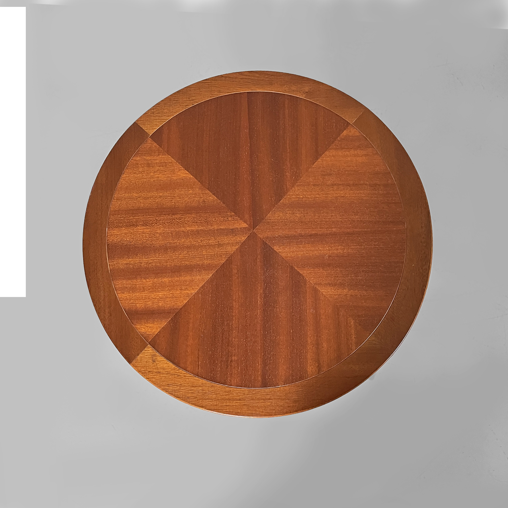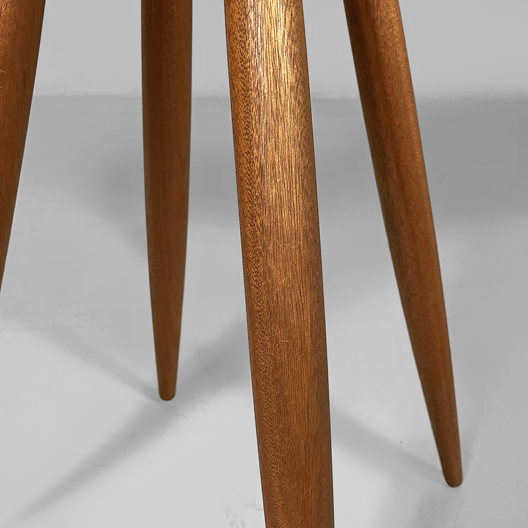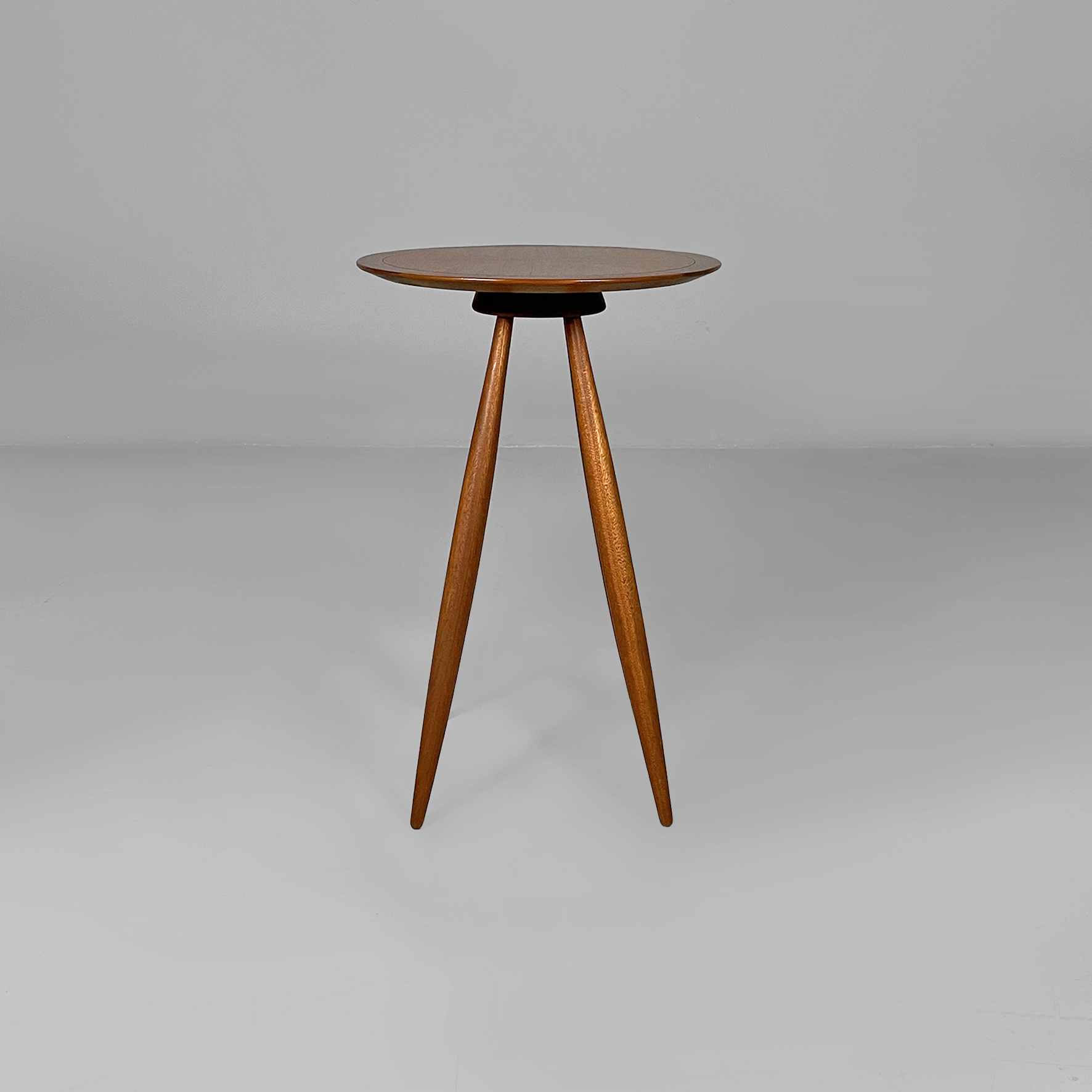Tavolo da caffè con piano tondo in legno. Le zampe a sezione tonda sono anche esse in legno.