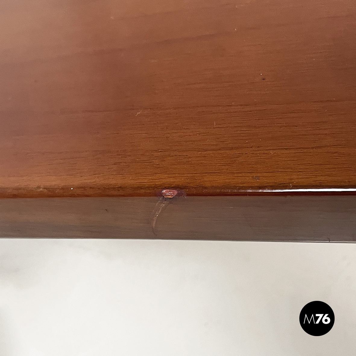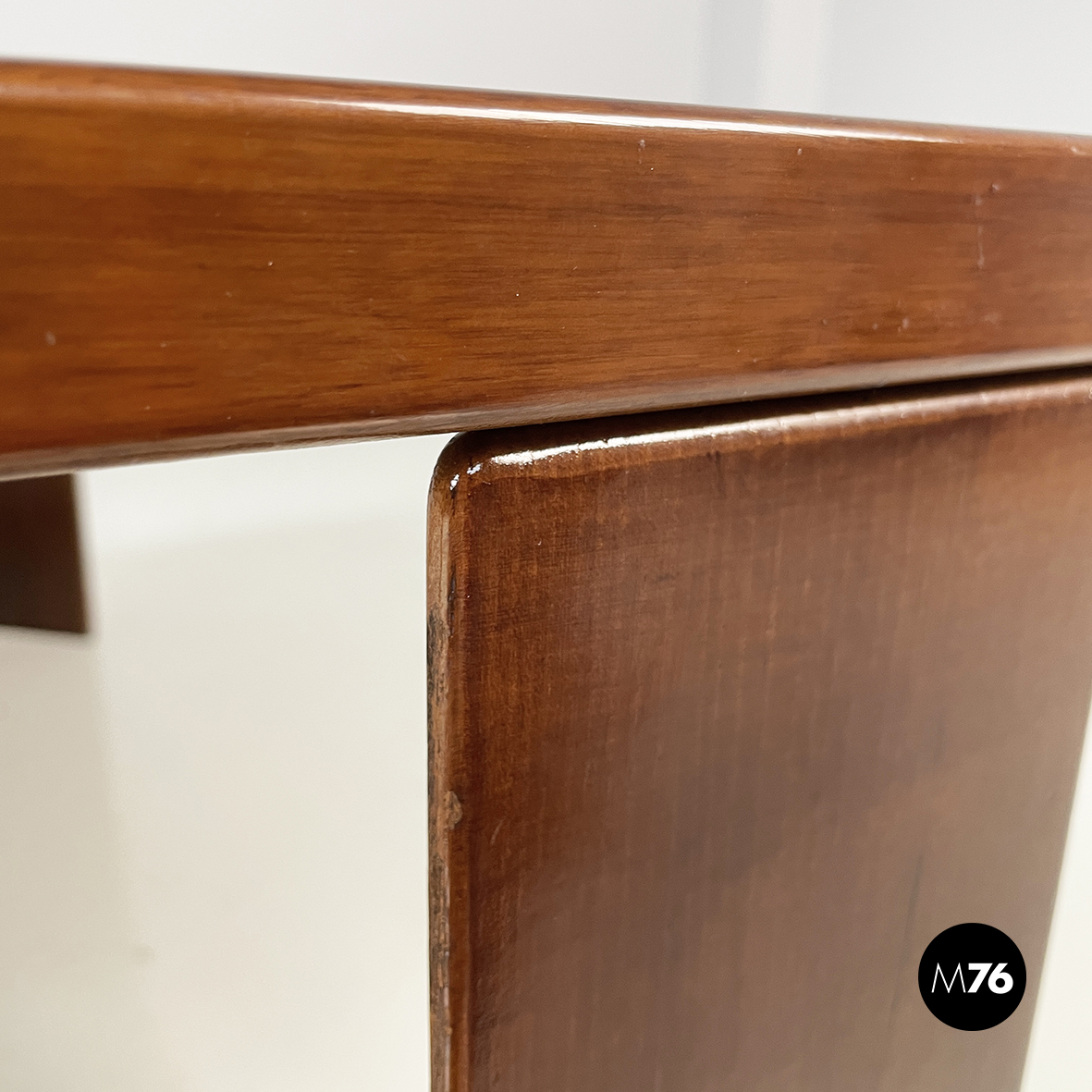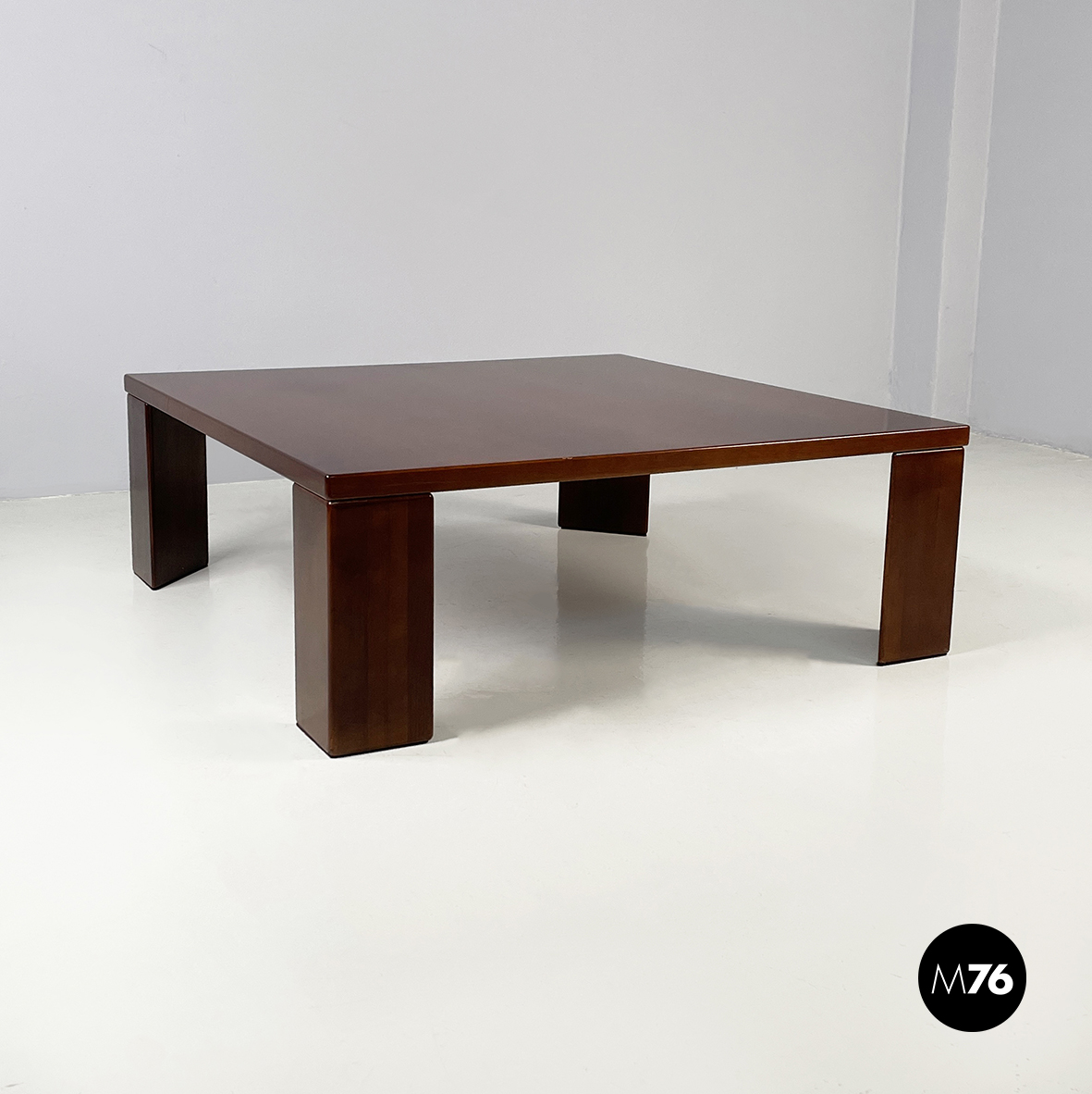 Tavolo da caffè con pianto quadrato in legno scuro. Le quattro zampe che sorreggono il piano sono a sezione triangolare, anche esse in legno scuro.