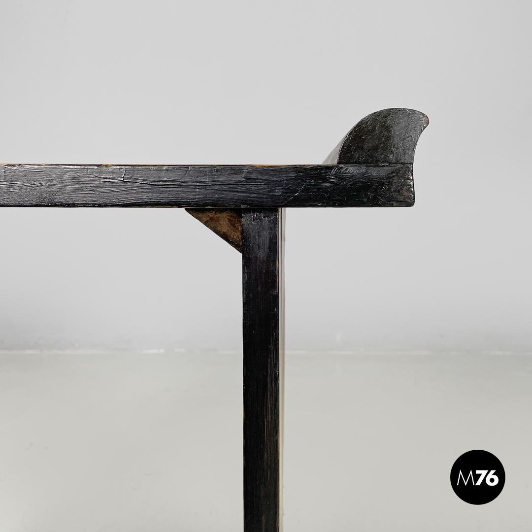 Tavolo da caffè interamente in legno a base rettangolare con profili verniciati di nero. Ai lati del piano si trovano due listelli decorativi curvi, il piano inferiore curva ai lati all’appoggio a terra.