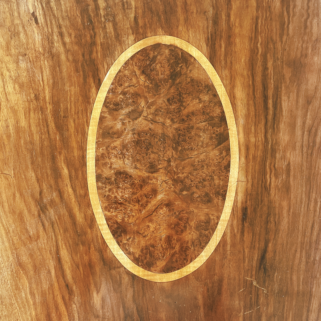 Tavolo da caffè di forma rettangolare interamente in legno finemente lavorato. Il piano presenta una decorazione centrale ovale. Le gambe con profili decorati seguono linee tondeggianti e curve, le gambe sono unite da tre travi, anch’esse decorate con lo stesso motivo. I piedini sono dotati di ruote.