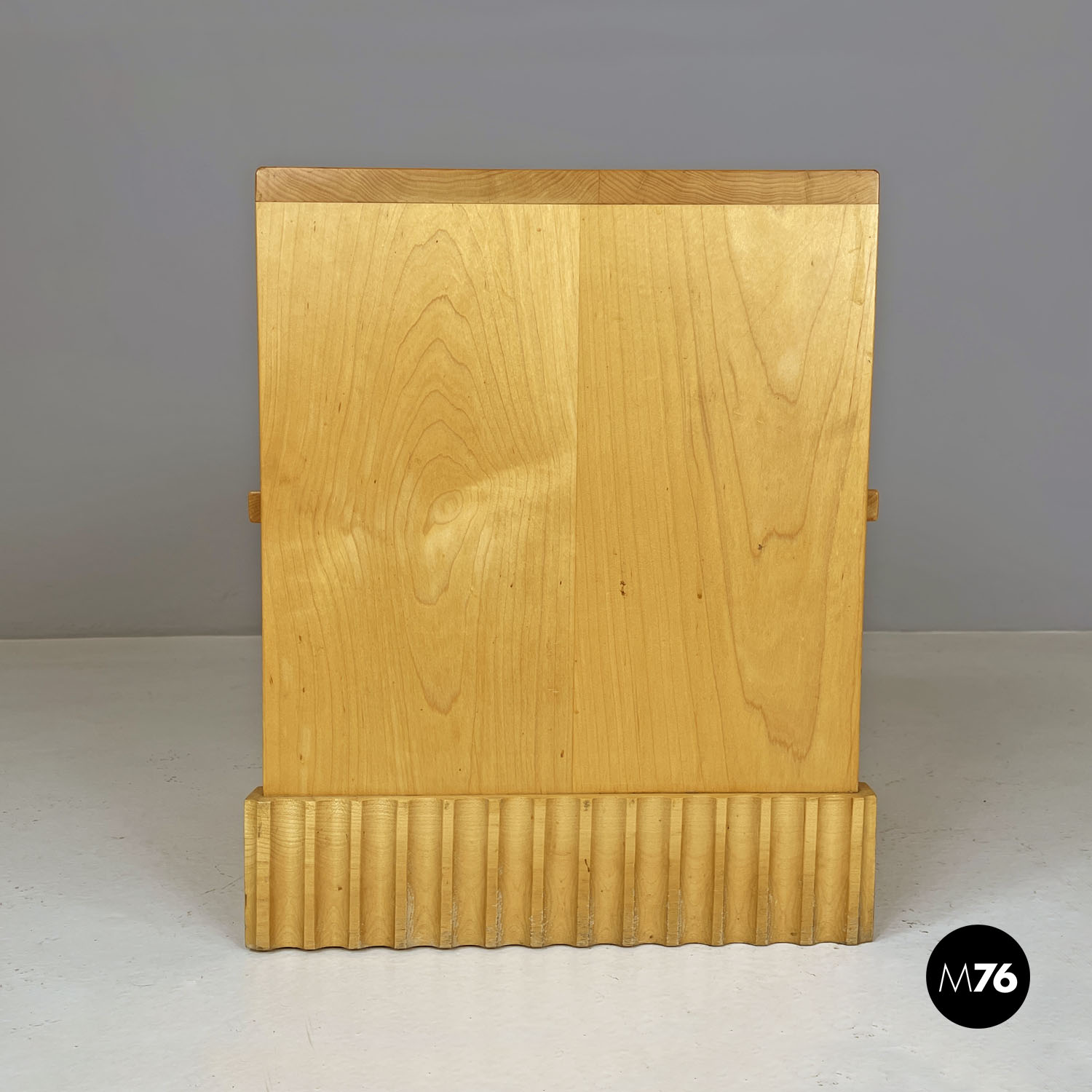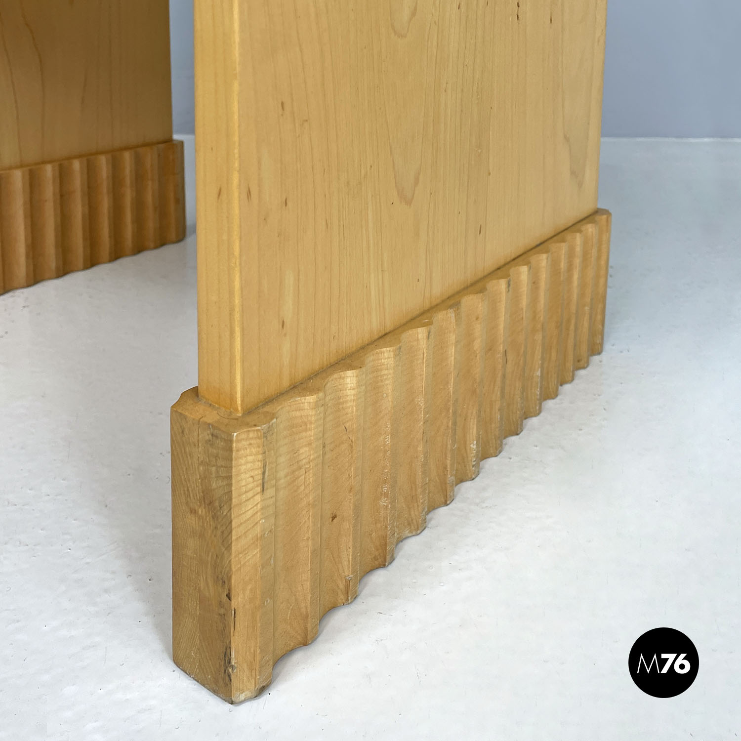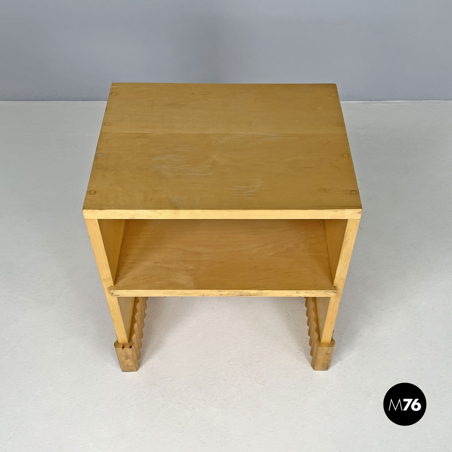 Tavolo da caffè con piano rettangolare in legno. Presenta una mensola nella parte centrale della struttura. Le due gambe, della stessa lunghezza del piano e della struttura, terminano all’appoggio a terra con una decorazione geometrica tondeggiante. Utilizzabile anche come comodino.