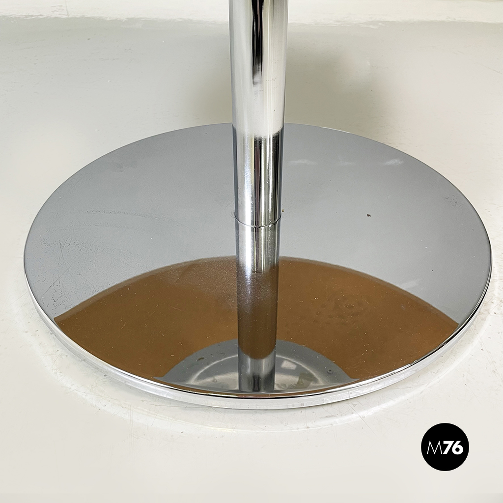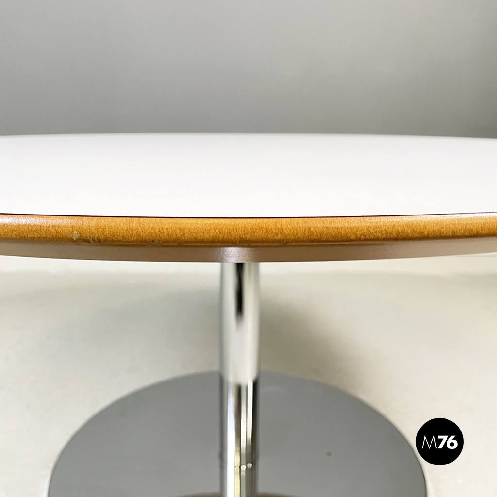 Tavolo da caffè con piano tondo in legno con superficie in legno mdf bianco. La struttura a sezione tonda è in metallo. Base tonda in metallo.
