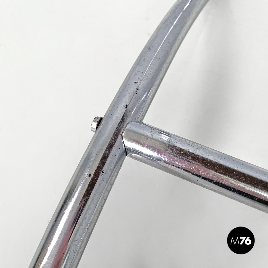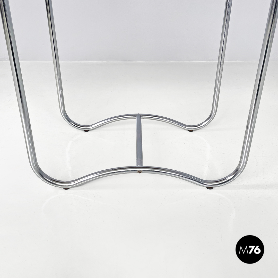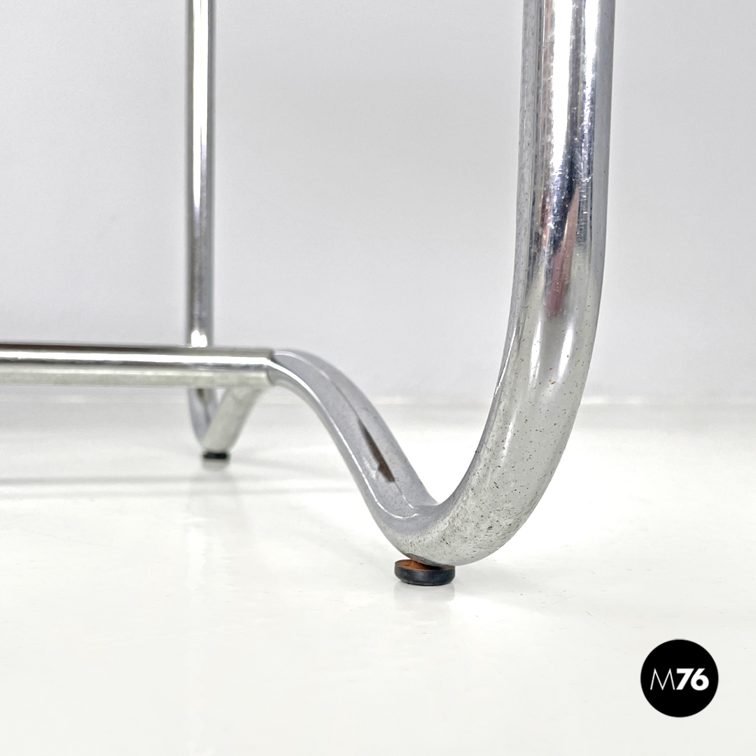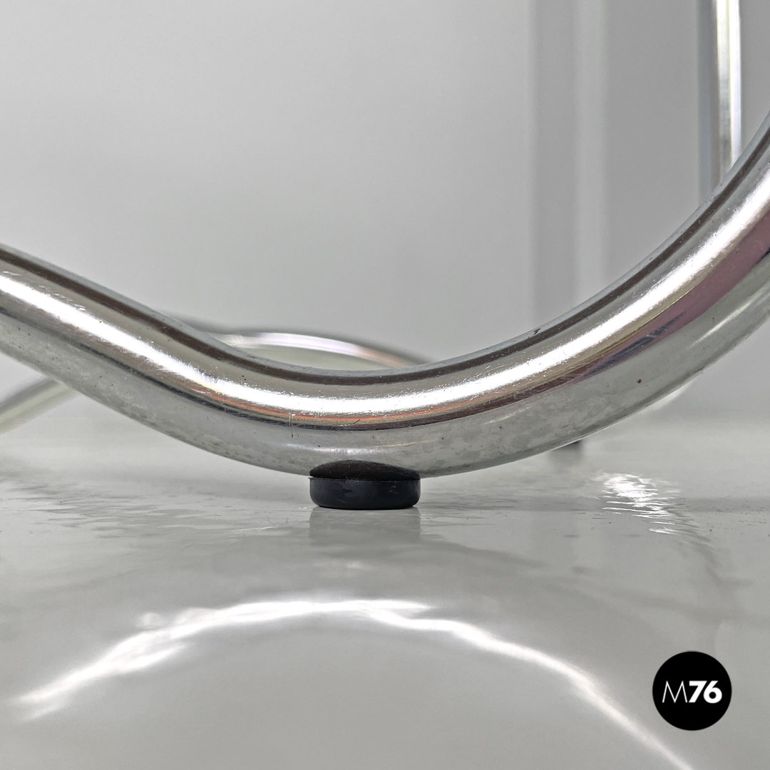 Tavolo da caffè con piano in legno rettangolare. La struttura è in tondino di metallo cromato, le quattro zampe si estendono fino a terra per poi creare due archi uniti da una trave centrale. Con quattro piedini in plastica nera. Sotto al piano è presente un “gancio” sempre in tondino di metallo che ha la funzione di porta giornali o porta riviste.
