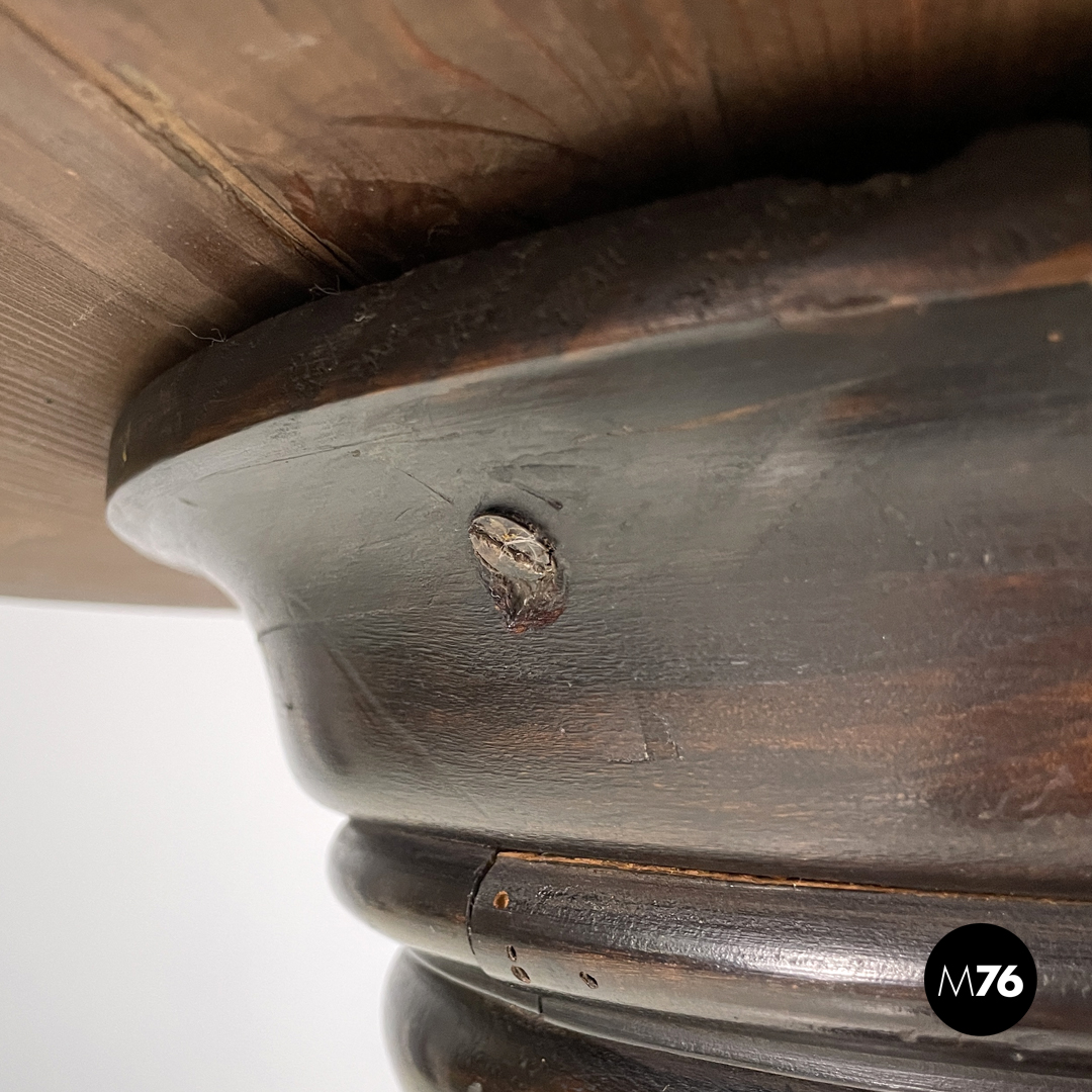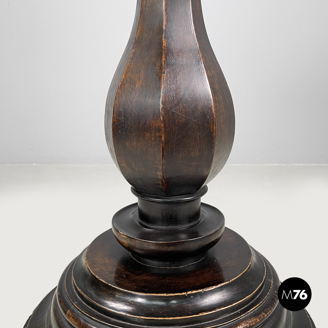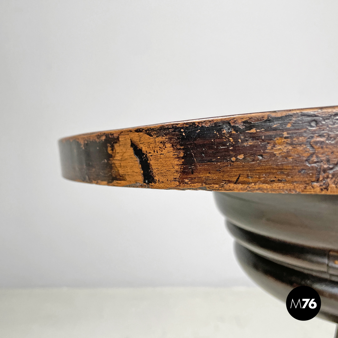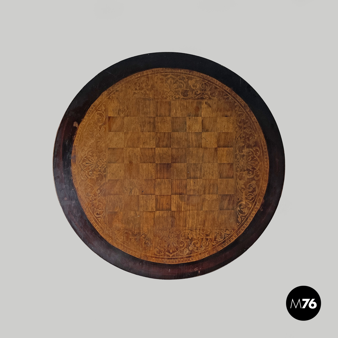 Tavolo da caffè o da servizio tondo in legno. Il piano è decorato con una scacchiera, ai quattro lati invece con ghirigori floreali. Lo stelo centrale è a sezione tonda e segue linee curve, nella parte bassa si allarga a formare una base tonda tornita. I quattro piedini sono a forma di zampa di leone.