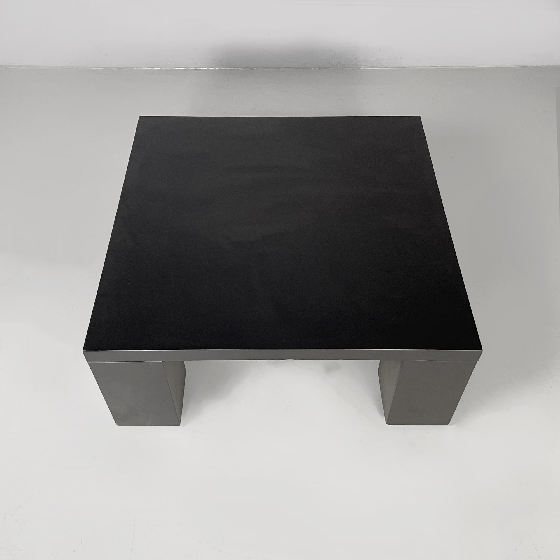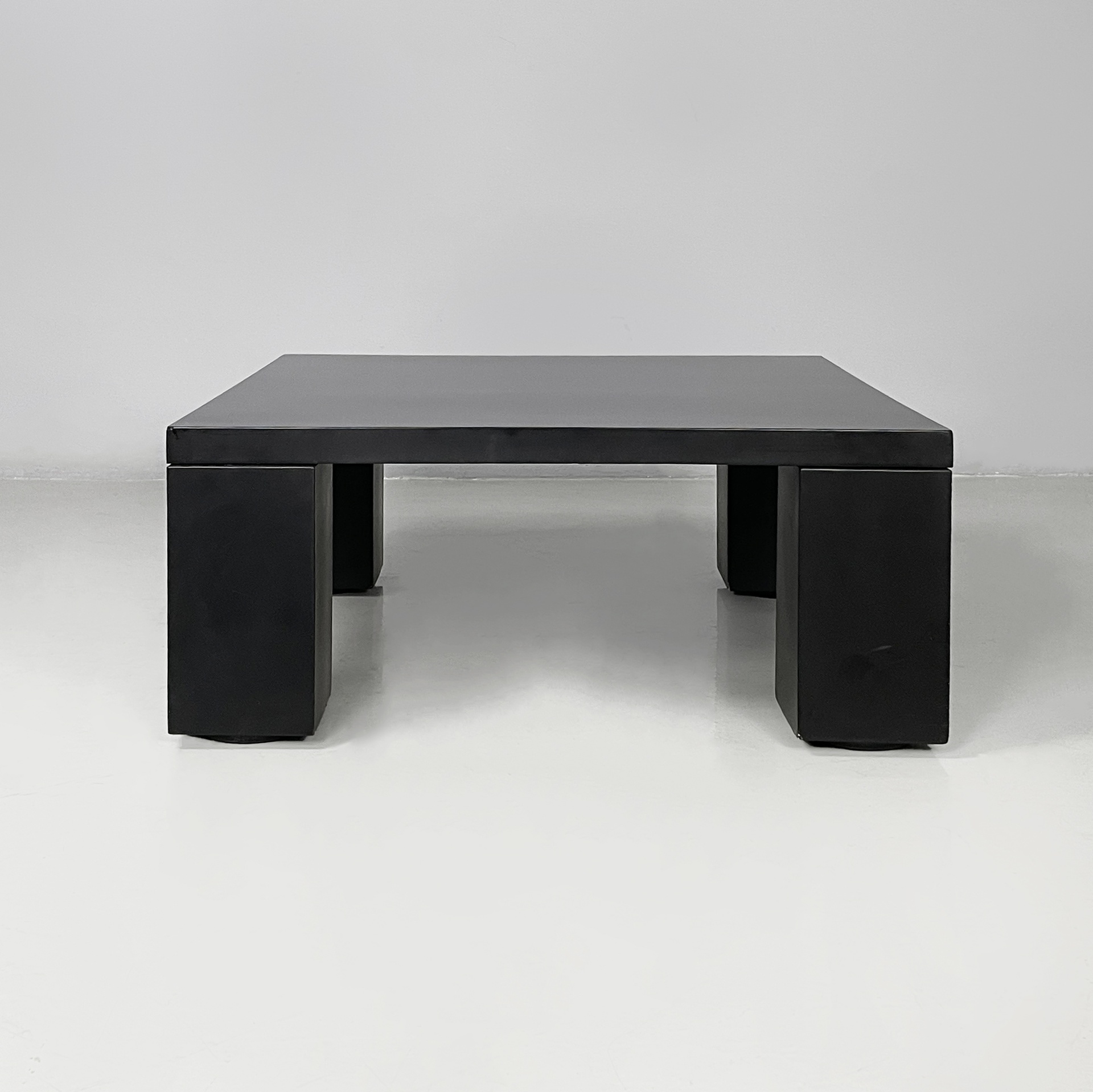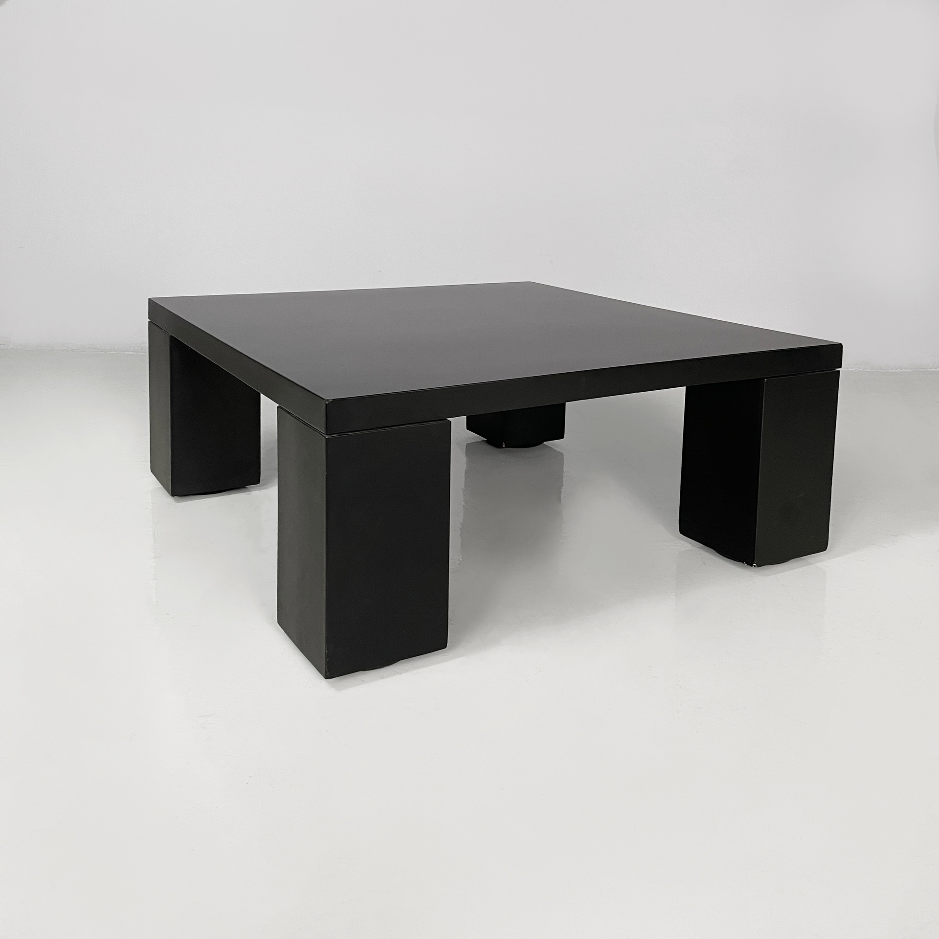 Tavolo da caffè con piano quadrato, interamente in legno verniciato nero con finitura opaca. Le zampe sono squadrate.