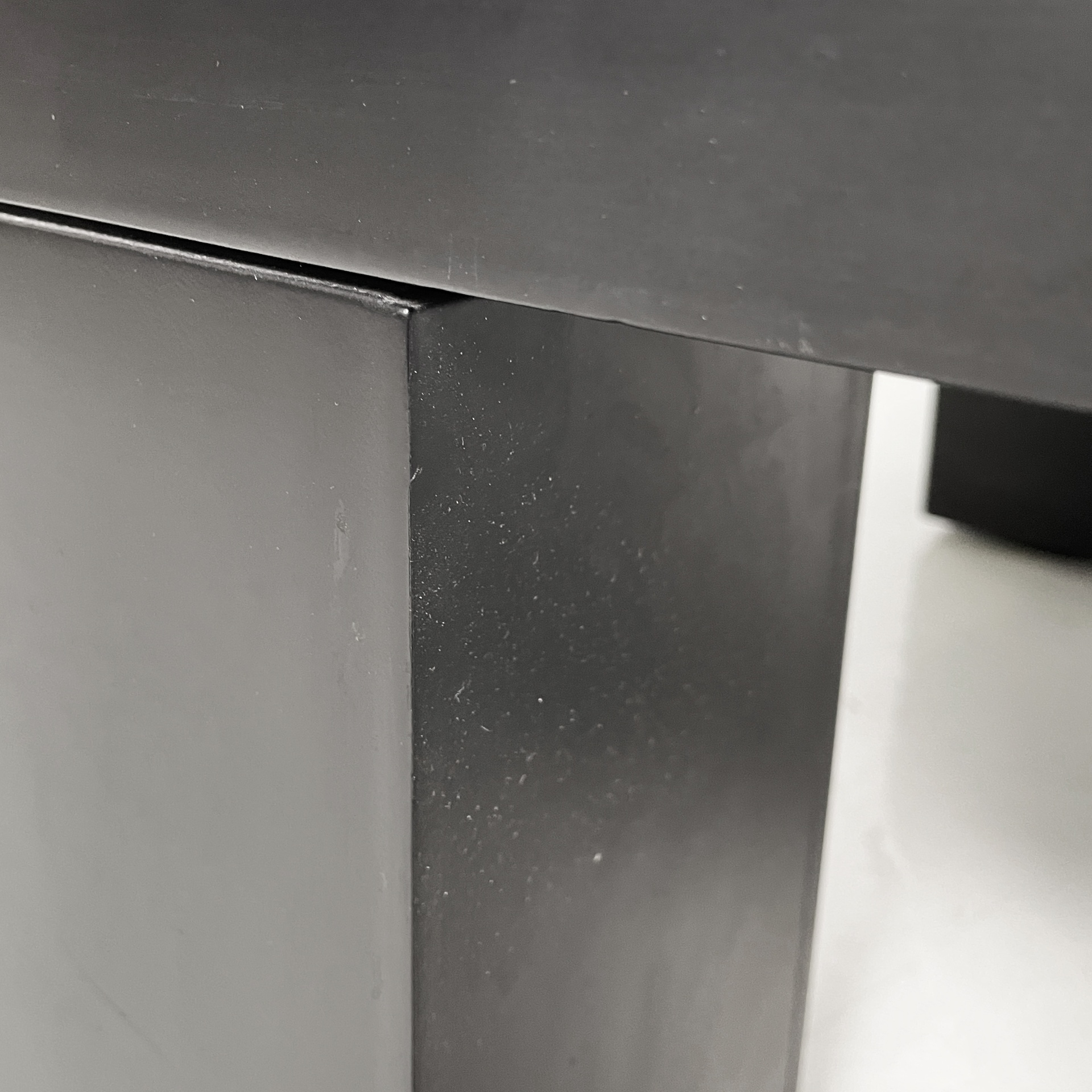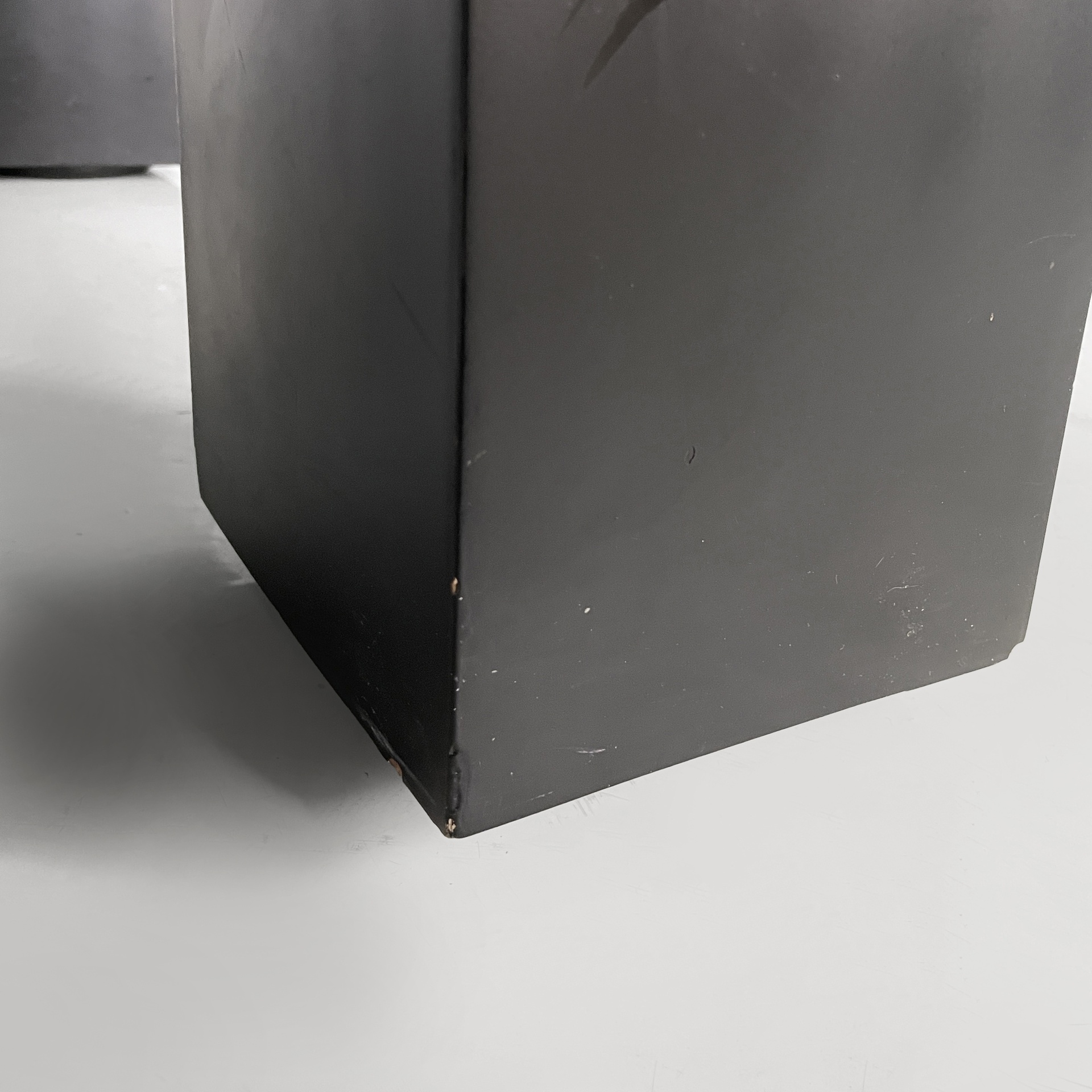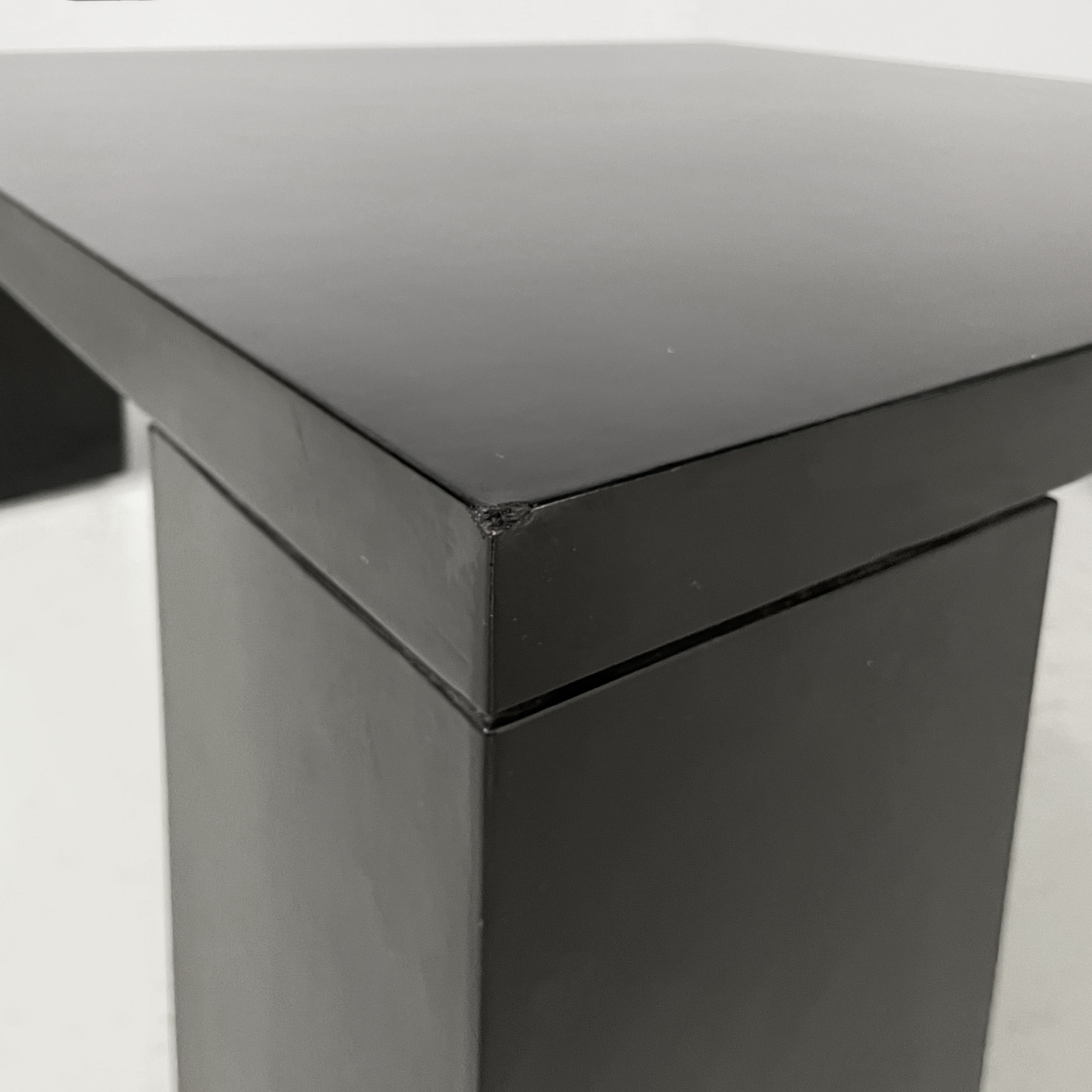 Tavolo da caffè con piano quadrato, interamente in legno verniciato nero con finitura opaca. Le zampe sono squadrate.