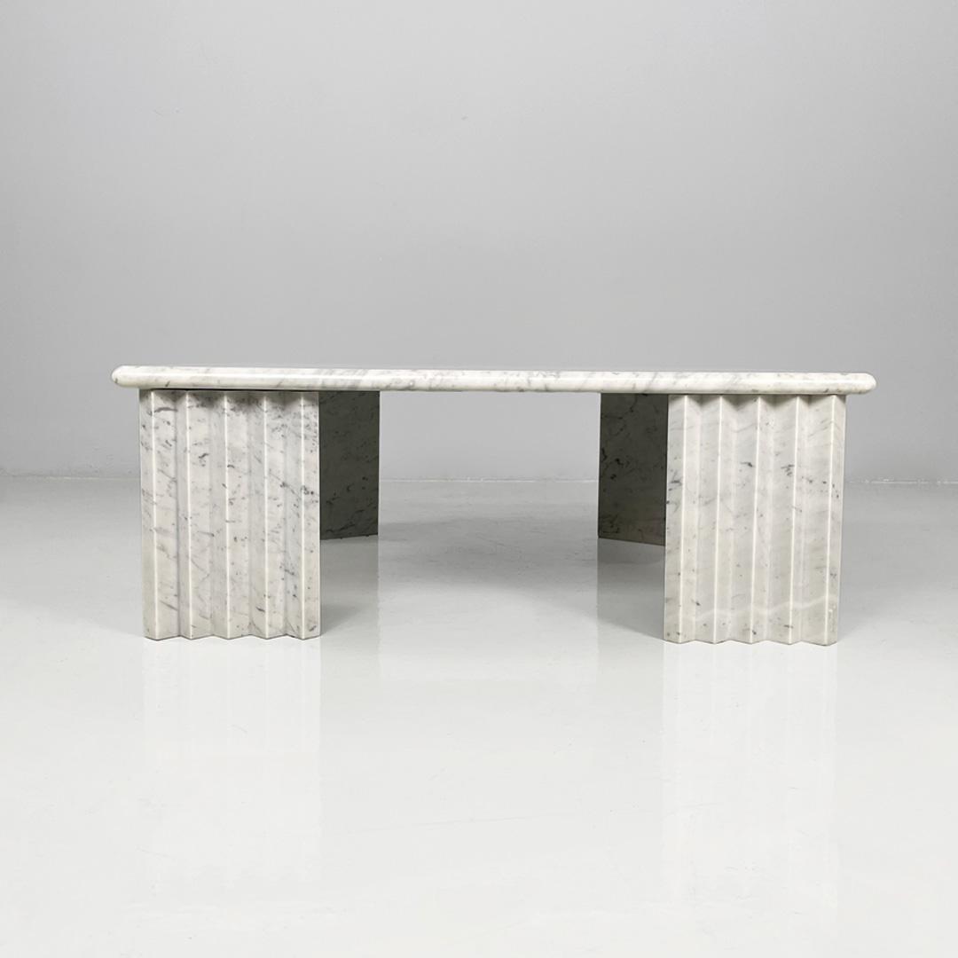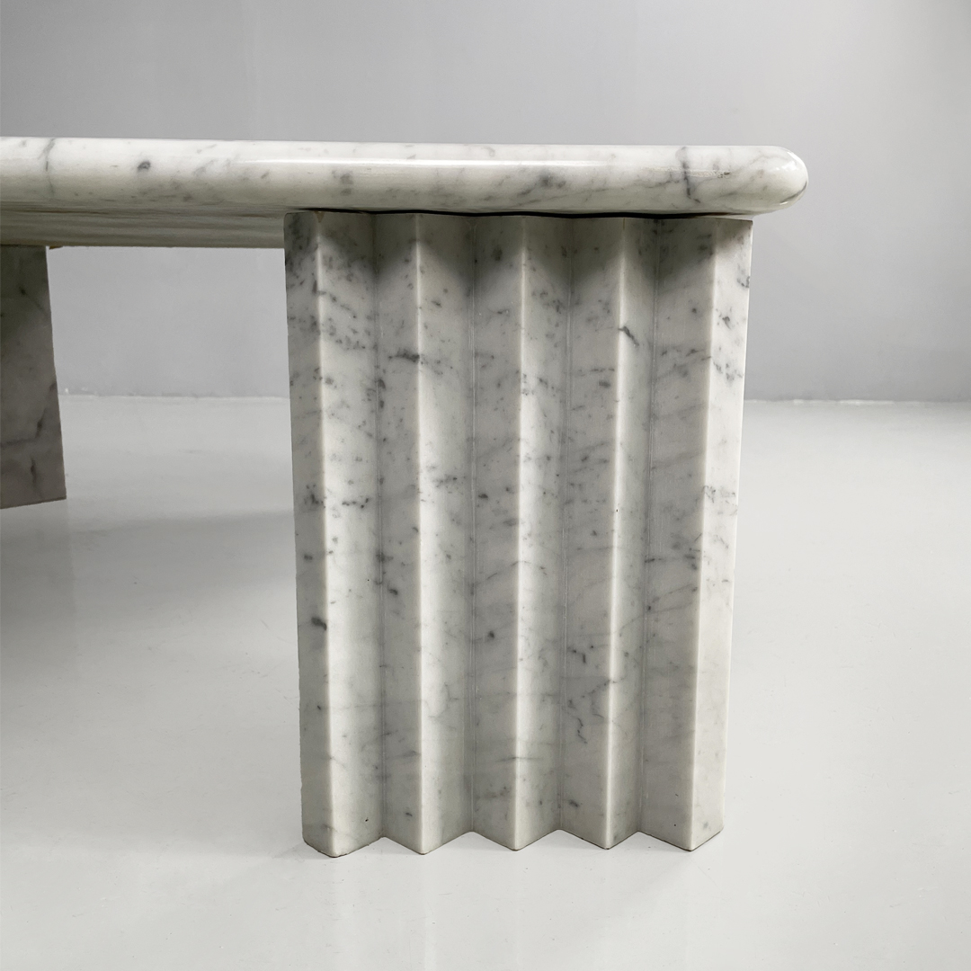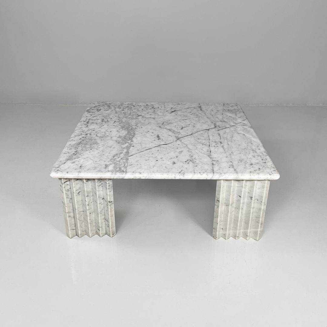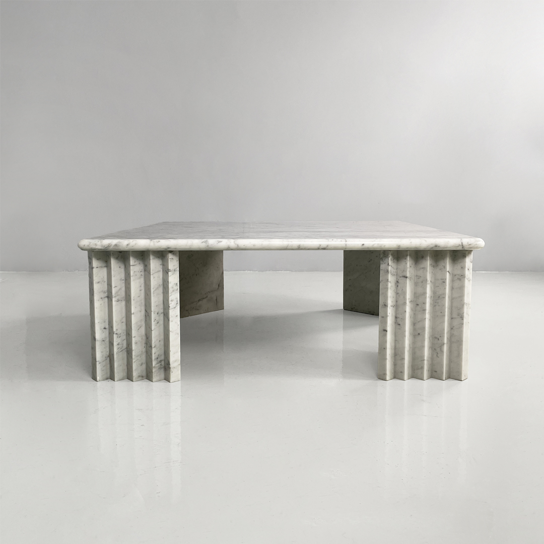 Tavolo da caffè interamente in marmo bianco. Il piano quadrato con bordi arrotondati è poggiato su quattro gambe le quali presentano delle scanalature geometriche decorative.