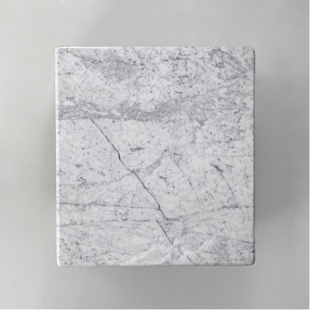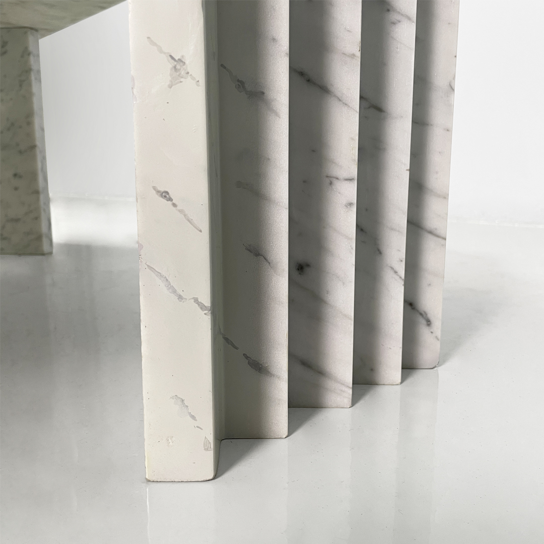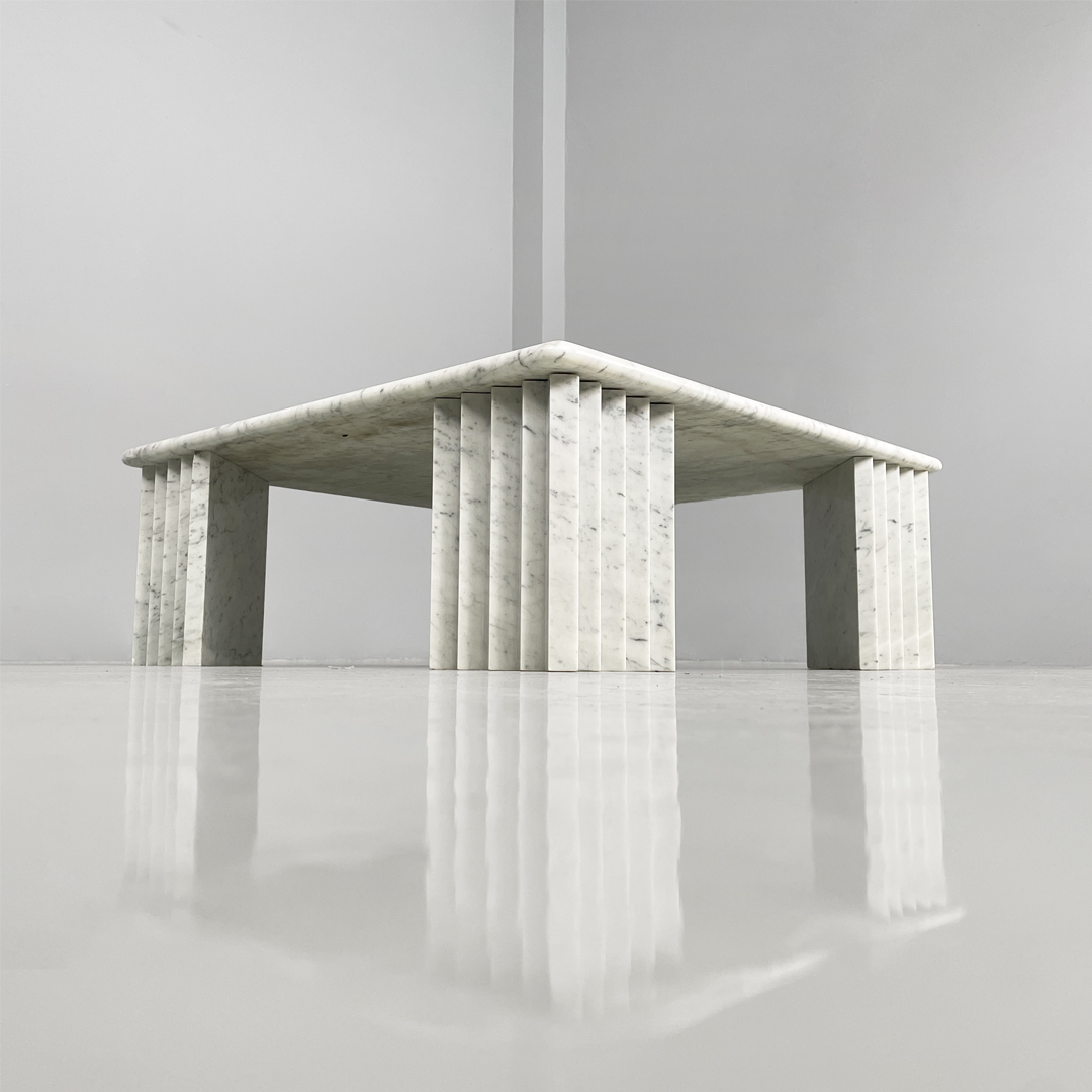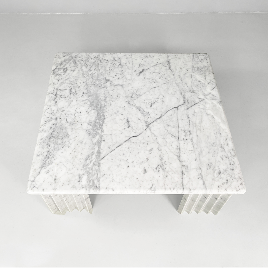 Tavolo da caffè interamente in marmo bianco. Il piano quadrato con bordi arrotondati è poggiato su quattro gambe le quali presentano delle scanalature geometriche decorative.