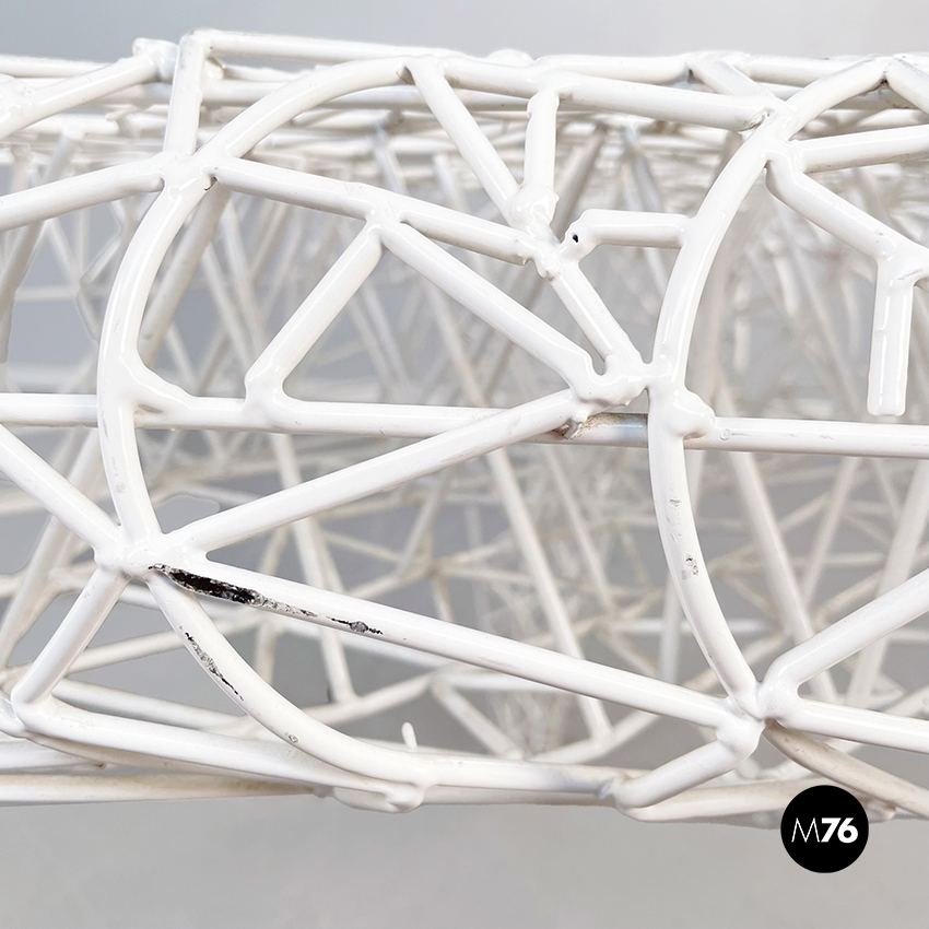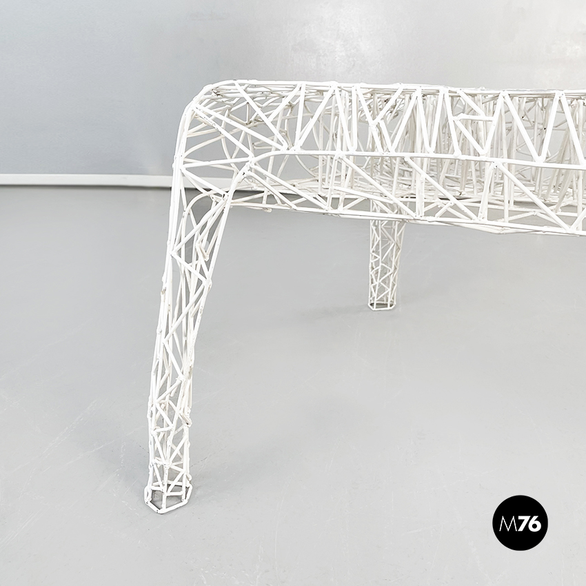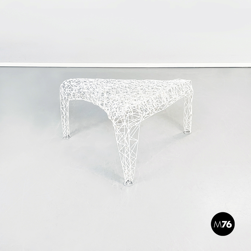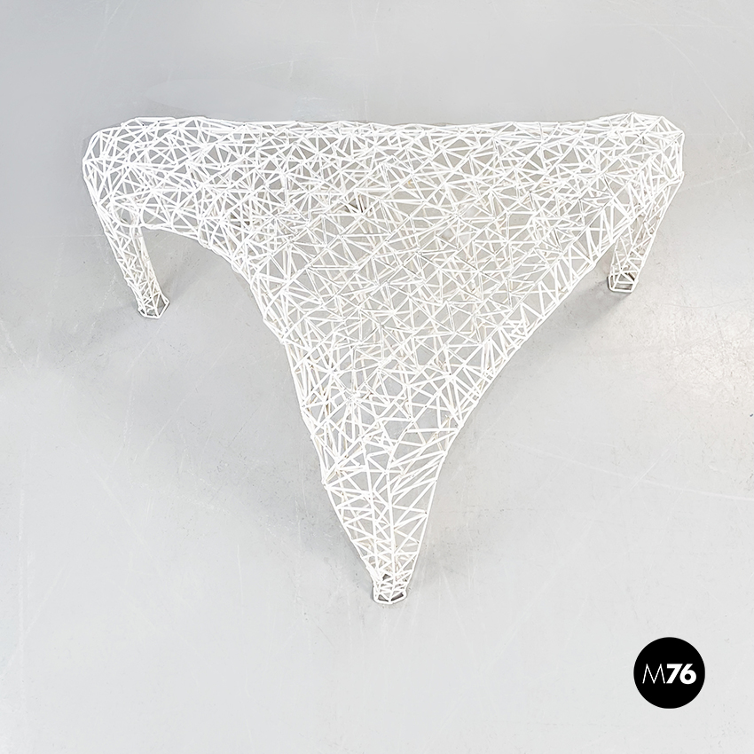 Tavolo da caffè di forma irregolare in metallo verniciato bianco. L’intero tavolo è composto da un fitto intreccio di sottili tubolari di metallo. Il piano è riconducibile alla forma del triangolo ed è sostenuto da tre gambe. Adatto per uso esterno, in giardino o in veranda.