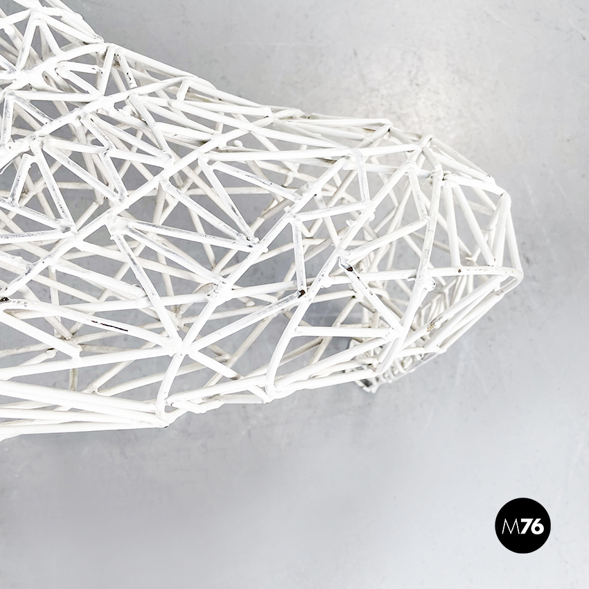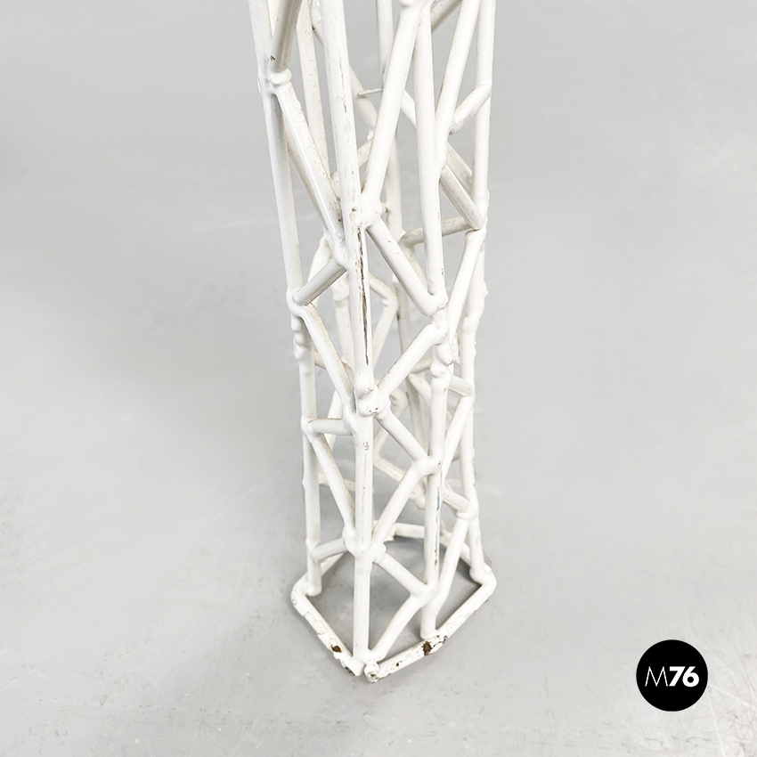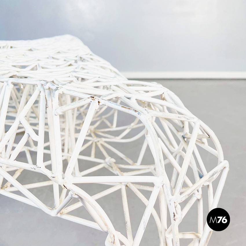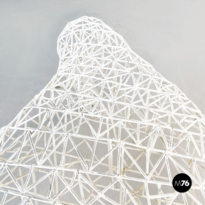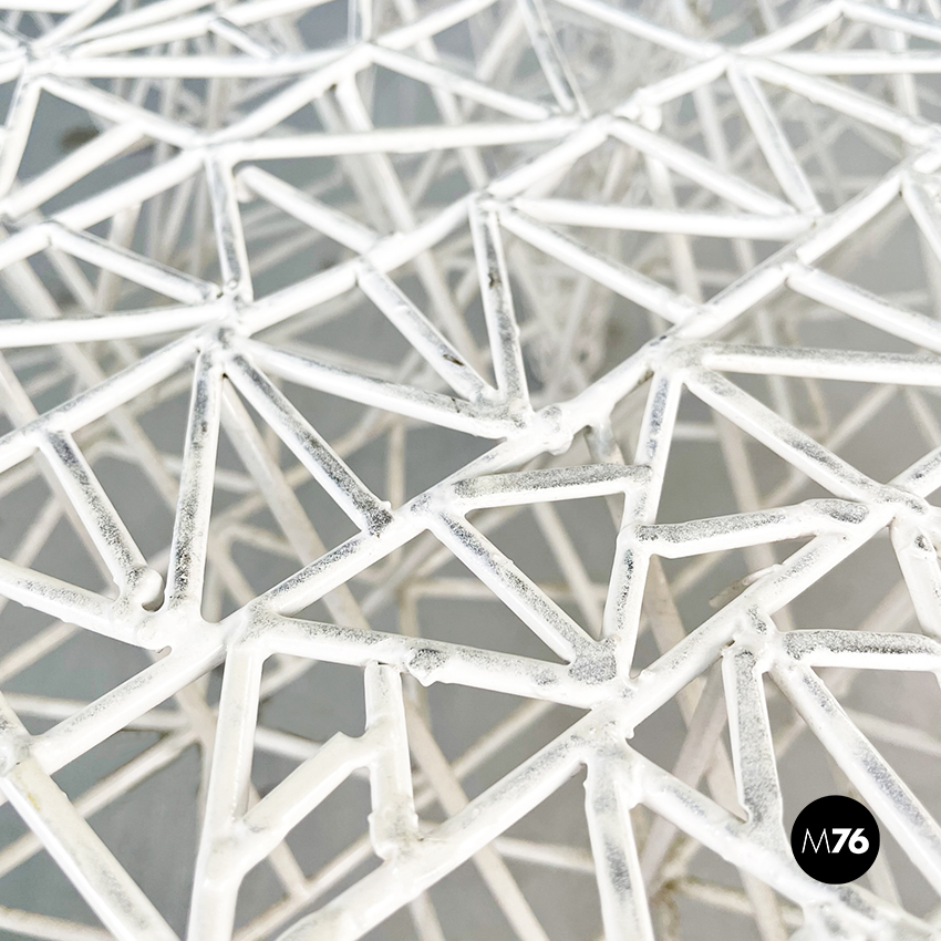 Tavolo da caffè di forma irregolare in metallo verniciato bianco. L’intero tavolo è composto da un fitto intreccio di sottili tubolari di metallo. Il piano è riconducibile alla forma del triangolo ed è sostenuto da tre gambe. Adatto per uso esterno, in giardino o in veranda.