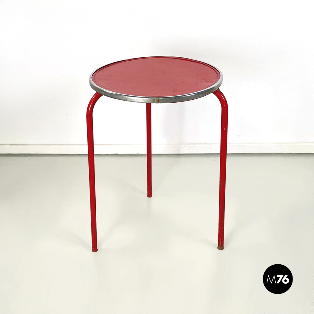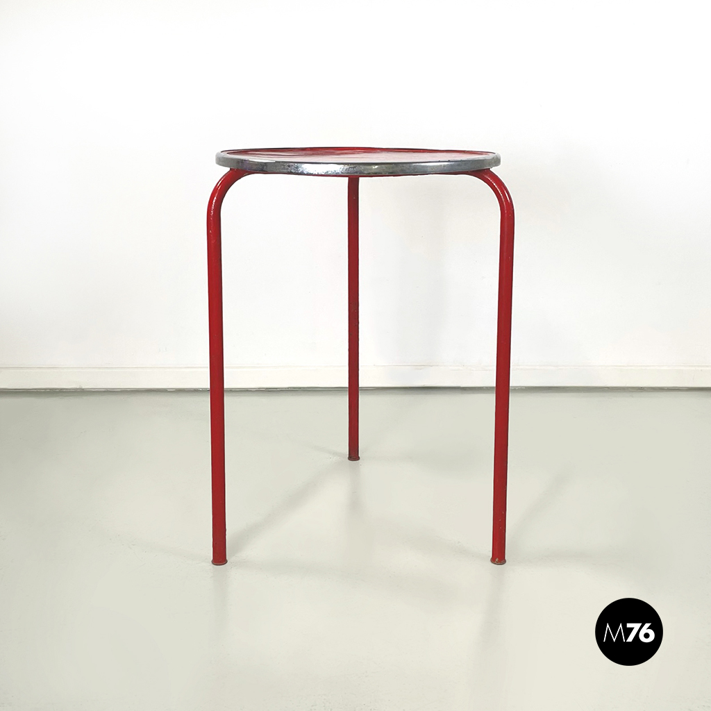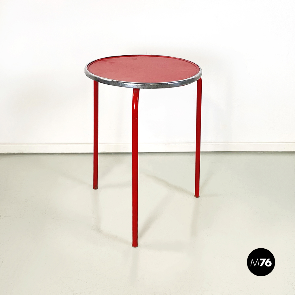 Tavolo da caffè con piano tondo in metallo verniciato rosso e profilo in metallo curvato. Le 3 zampe sono in tondino di metallo verniciato rosso. Il tavolino è adatto ad uso esterno com giardino o terrazza.