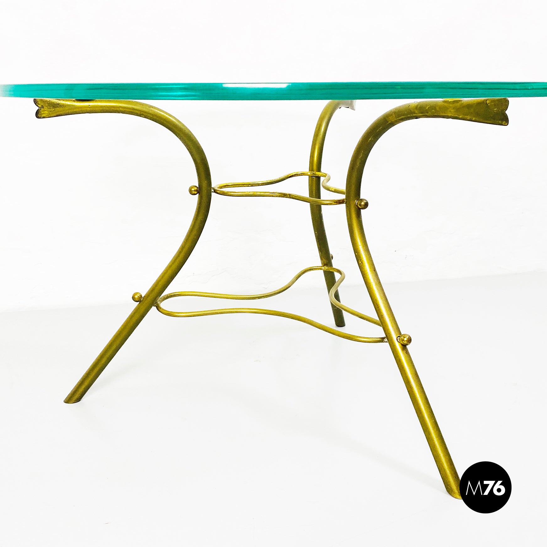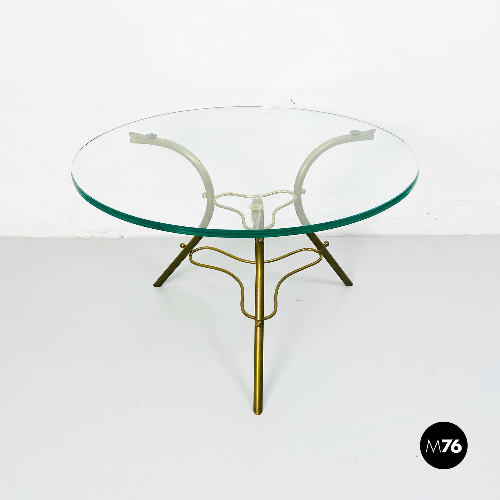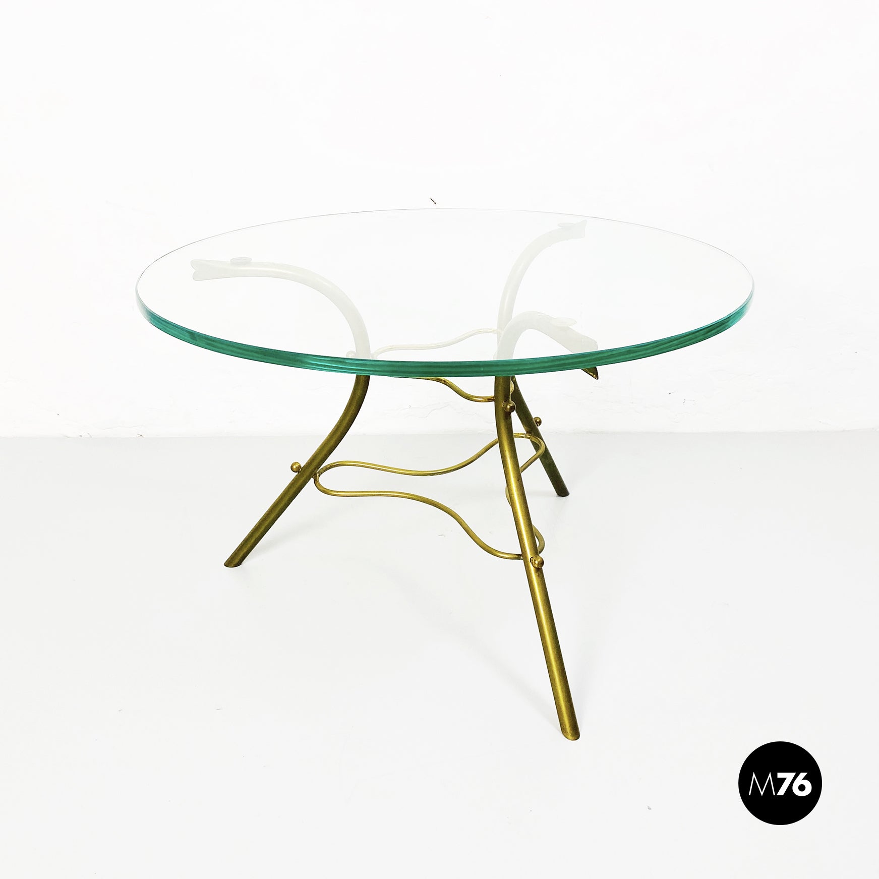 Tavolo da caffè con piano tondo in vetro trasparente e base irregolare in tondino di ottone.