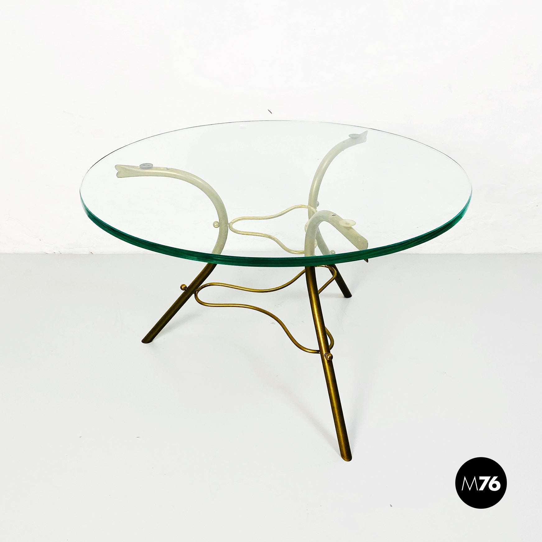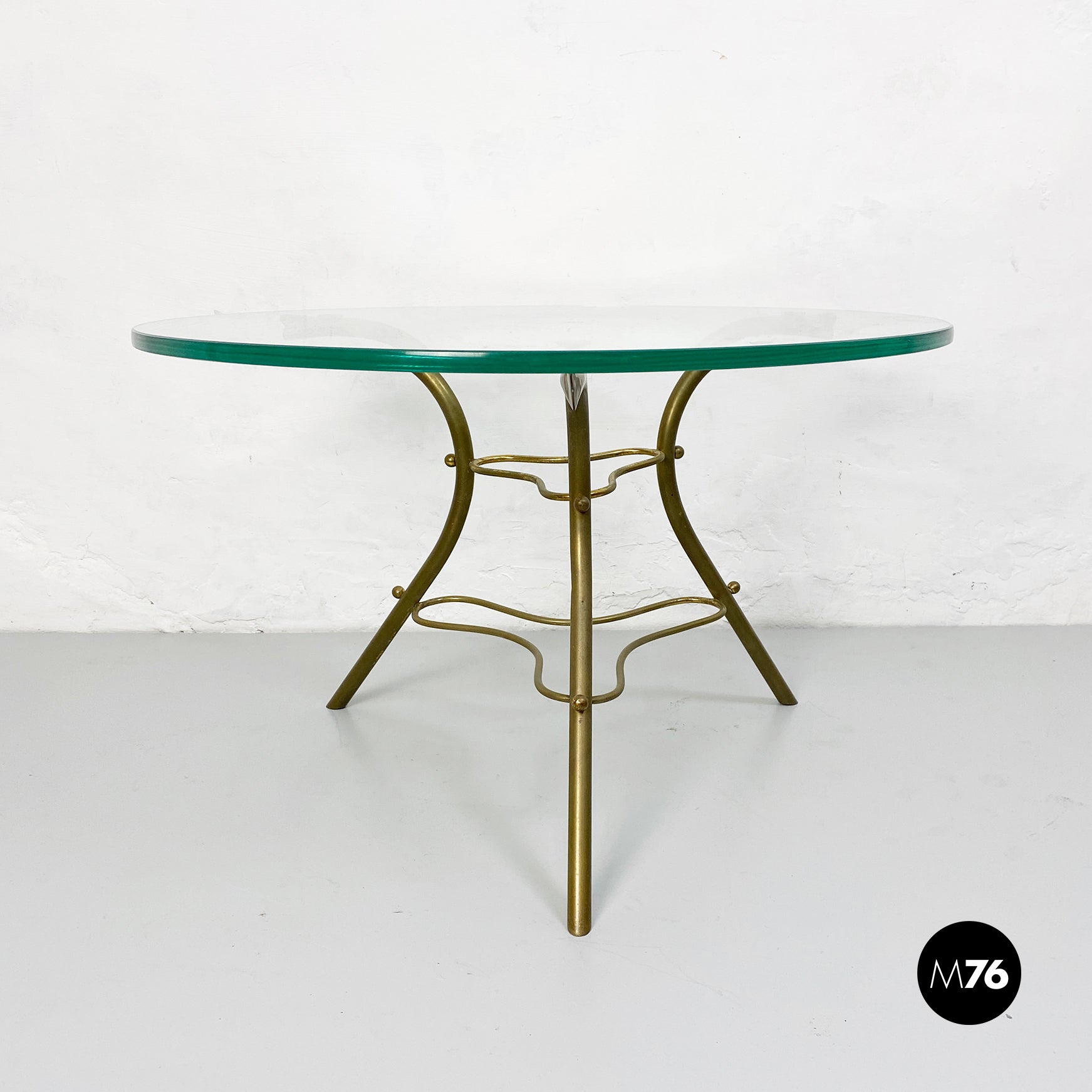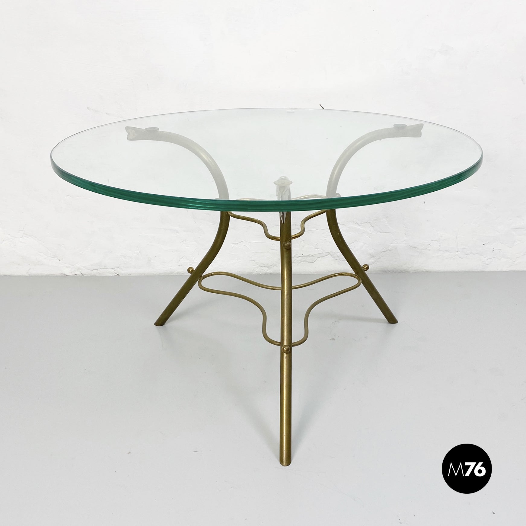 Tavolo da caffè con piano tondo in vetro trasparente e base irregolare in tondino di ottone.
