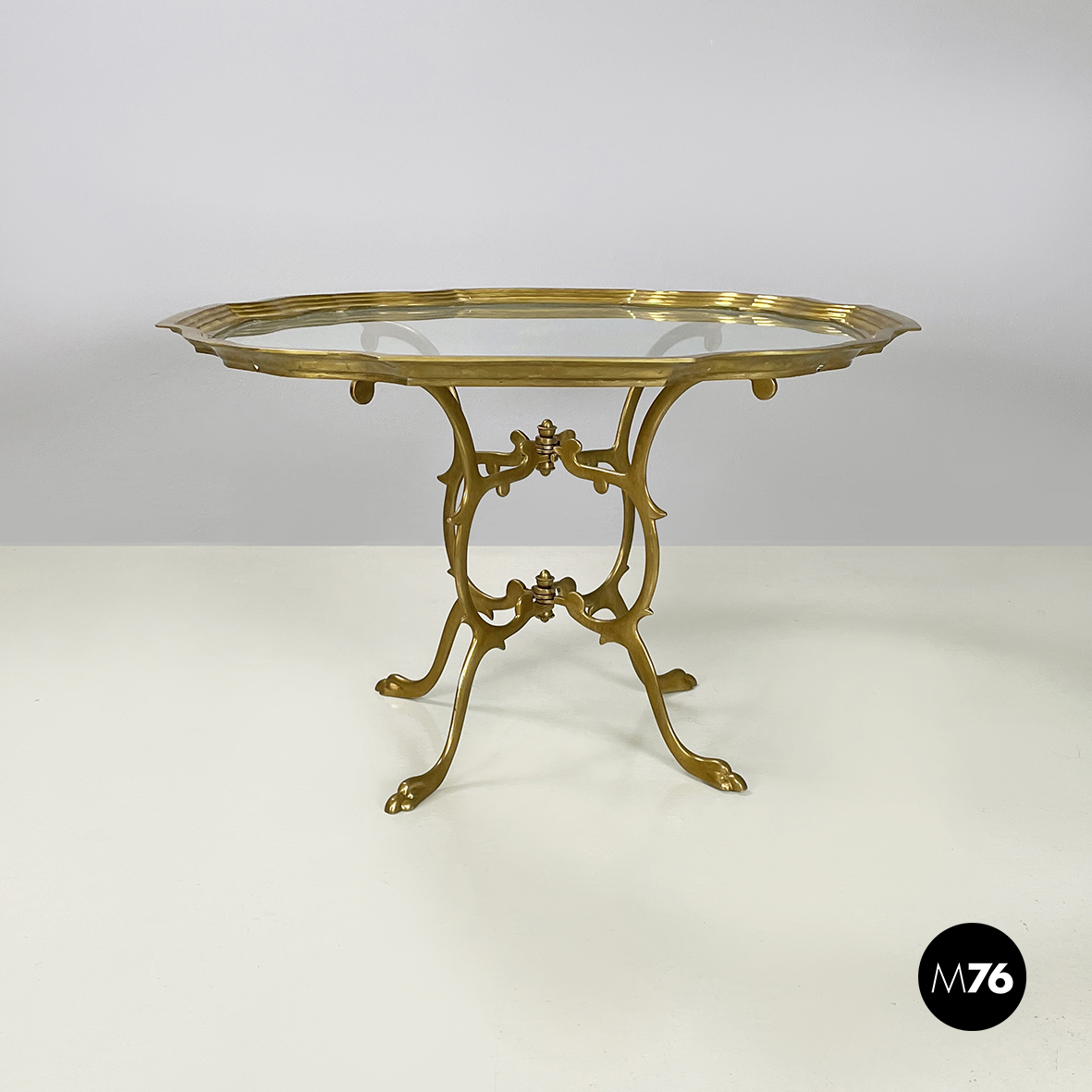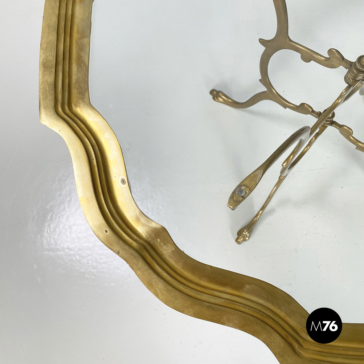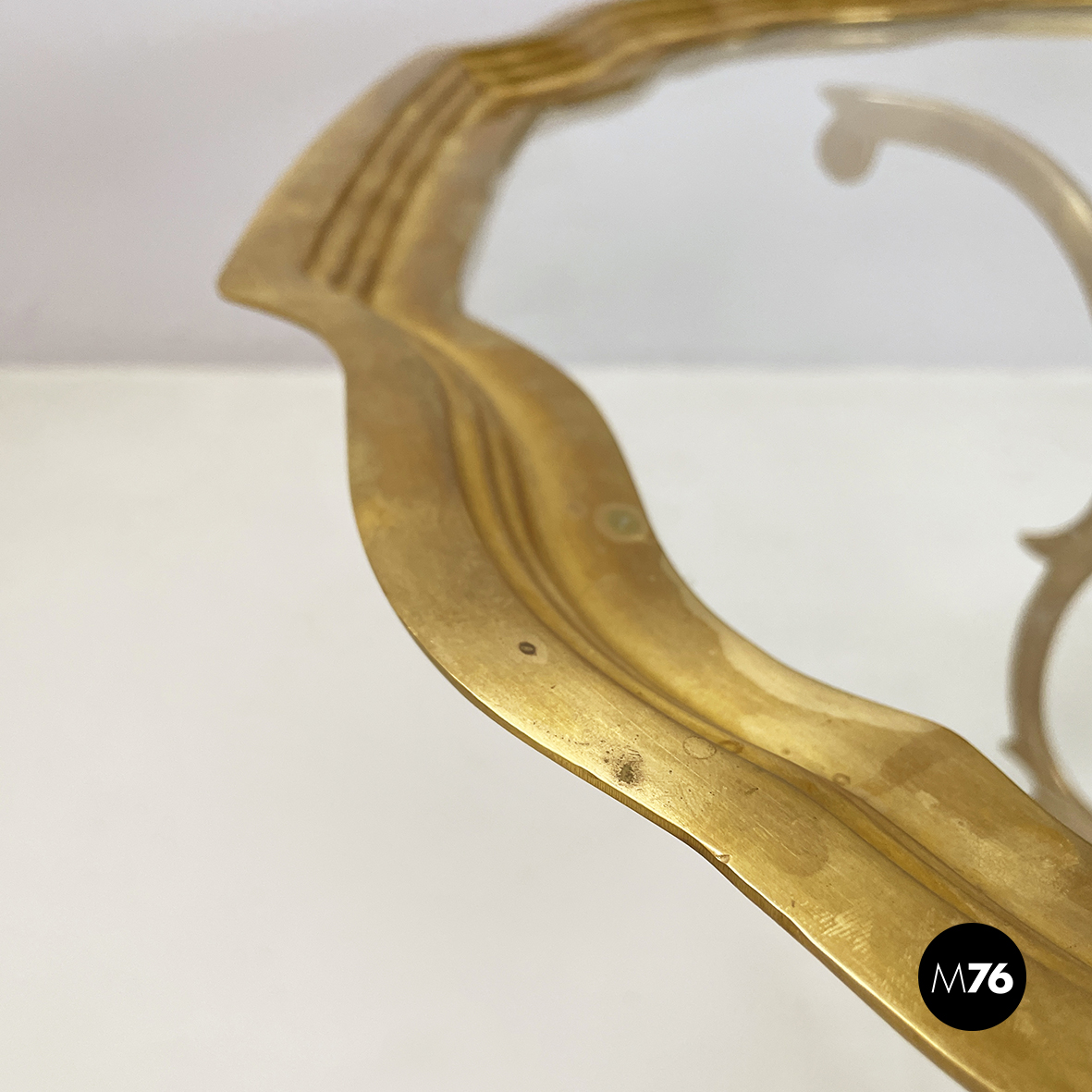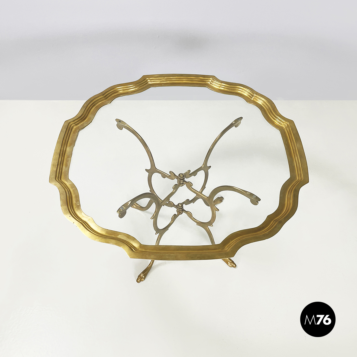 Tavolo da caffè con piano sagomato geometrico in vetro con profilo a sbalzo in ottone. La base su cui poggia il piano è composta da quattro zampe sagomate in ottone. Piedini lavorati.