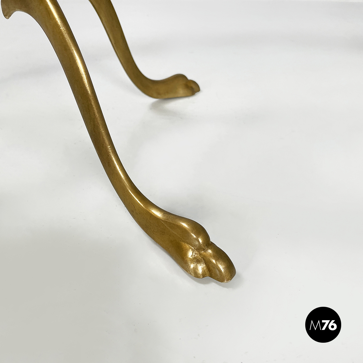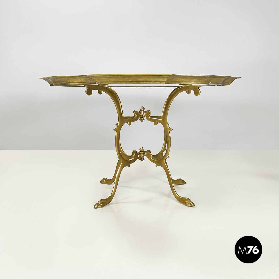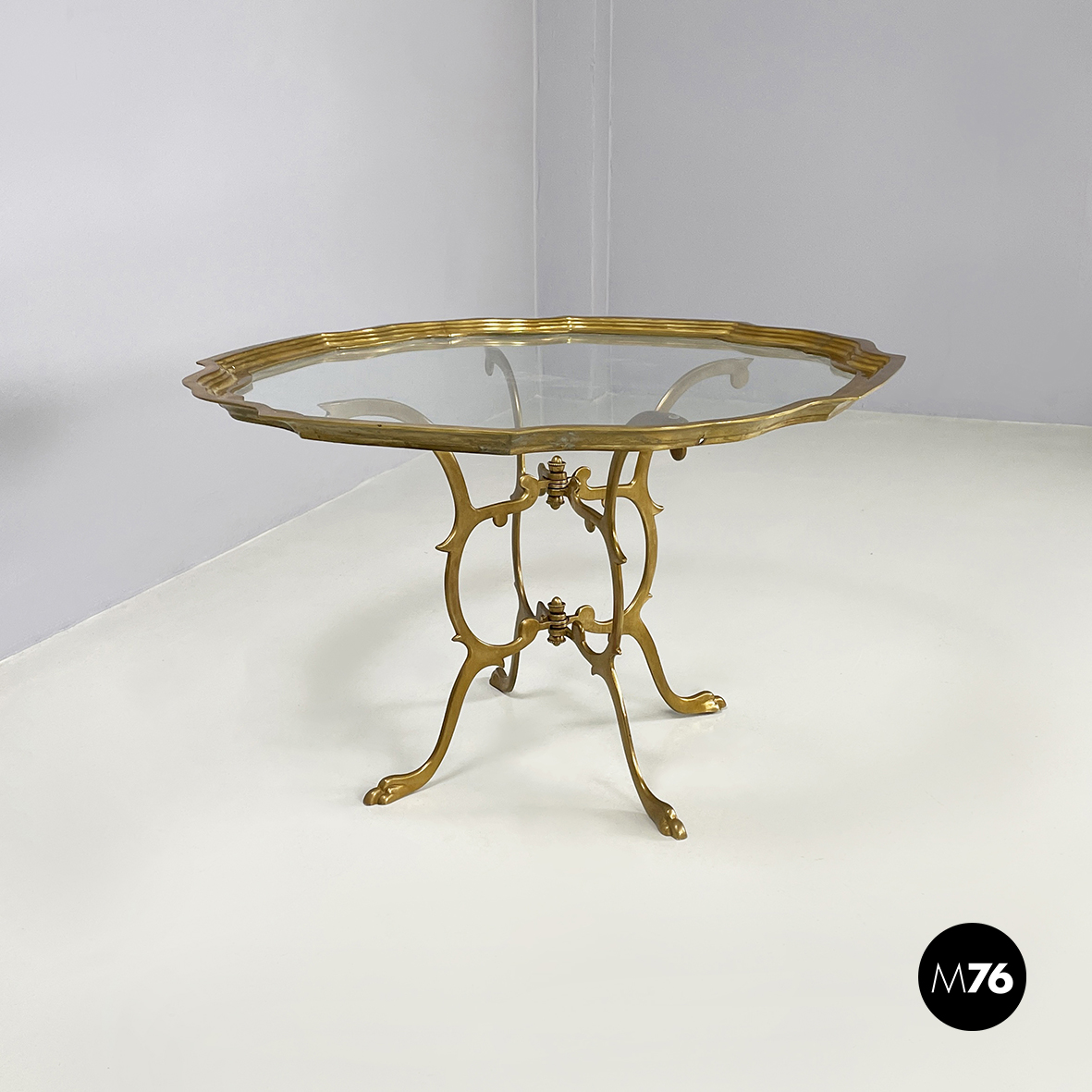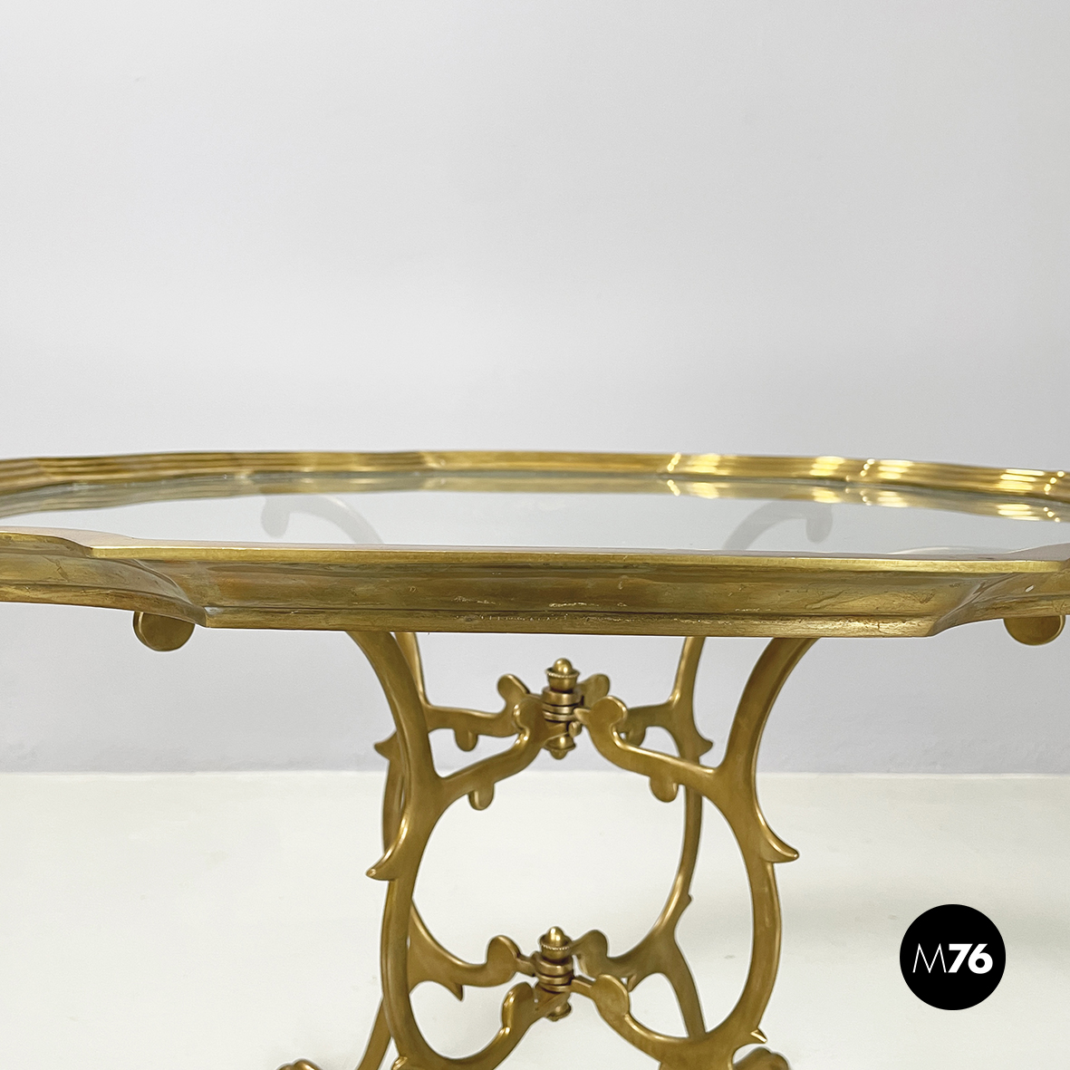Tavolo da caffè con piano sagomato geometrico in vetro con profilo a sbalzo in ottone. La base su cui poggia il piano è composta da quattro zampe sagomate in ottone. Piedini lavorati.