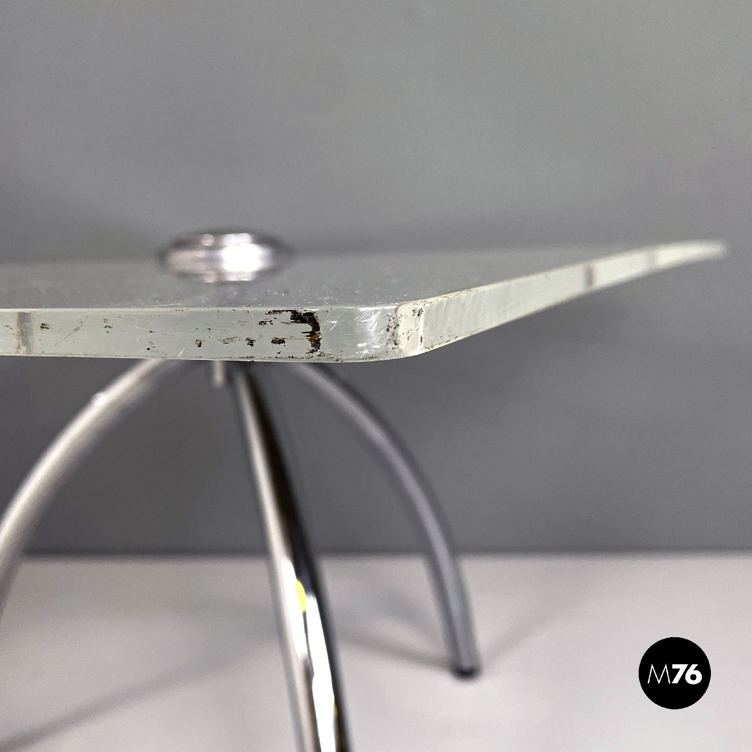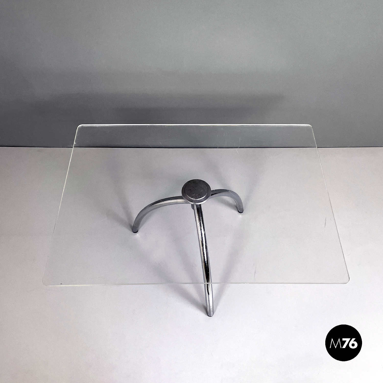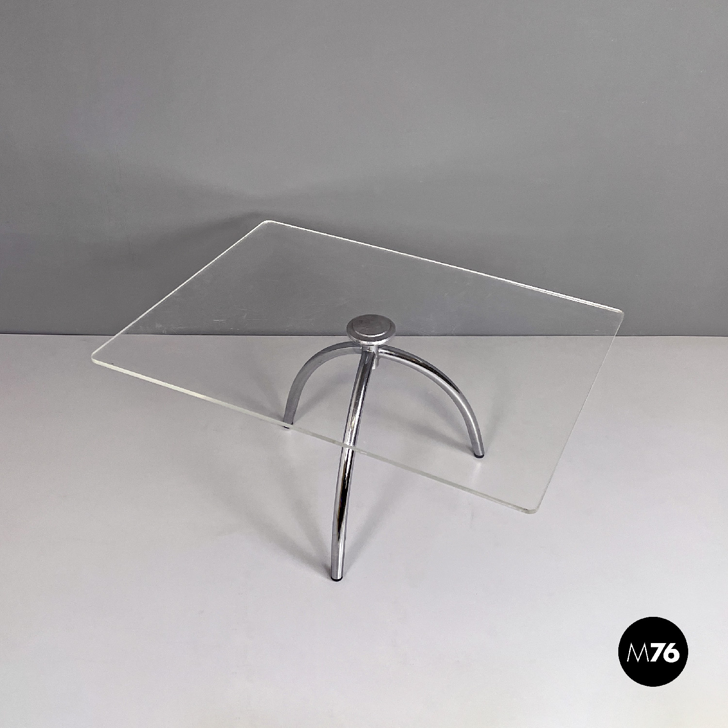 Tavolo da caffè con piano rettangolare in plexiglass trasparente. Sul piano è presenta un elemento tondo in alluminio che lo collega alla struttura, anch’essa in alluminio e composta da un cilindro centrale e da tre gambe curve a sezione tonda.