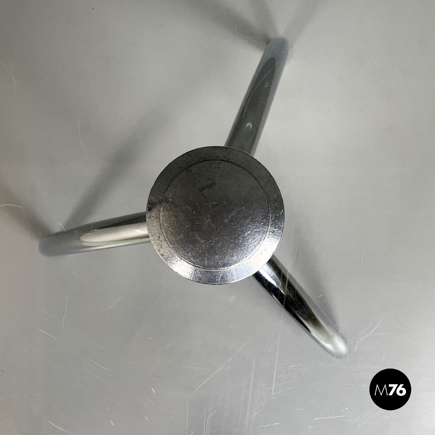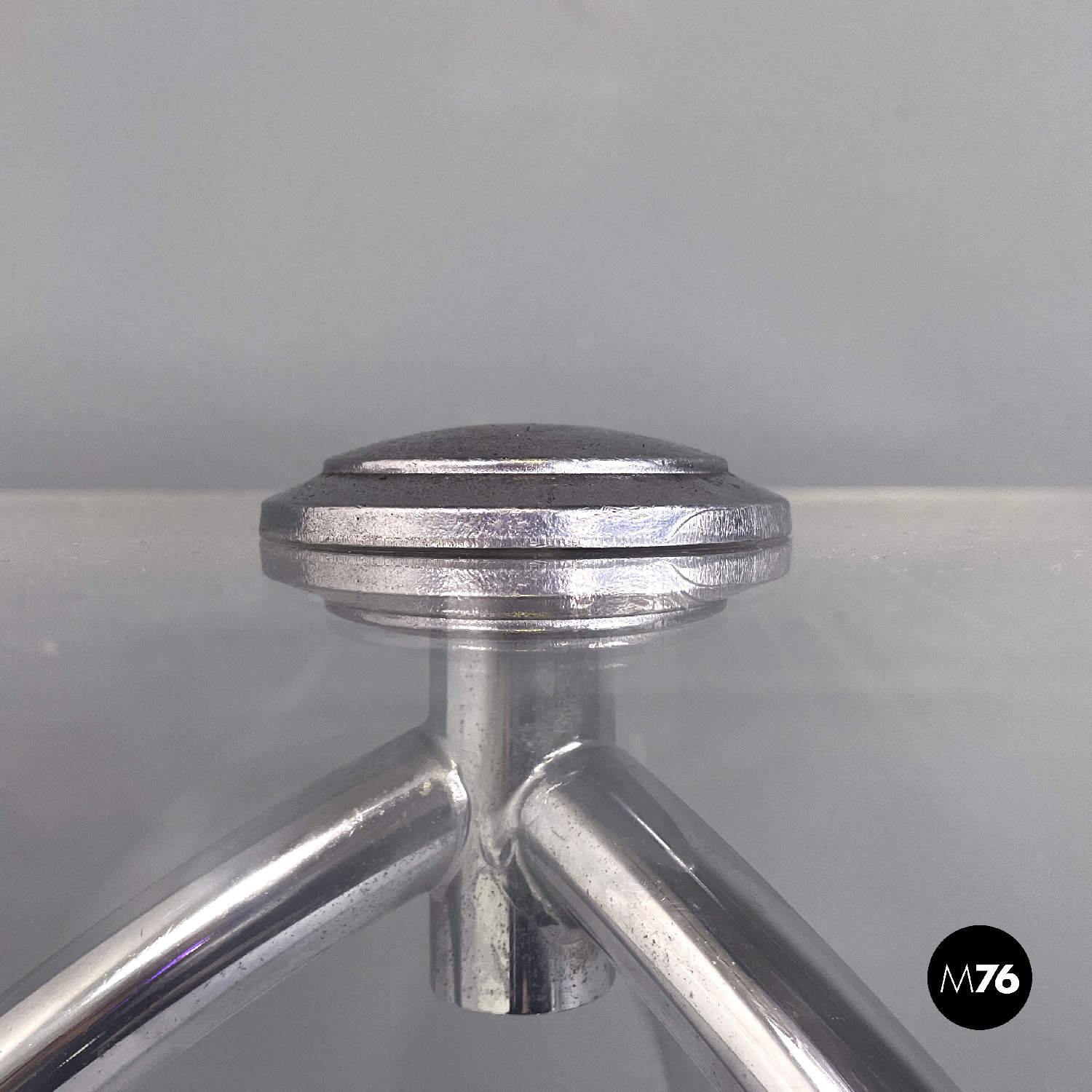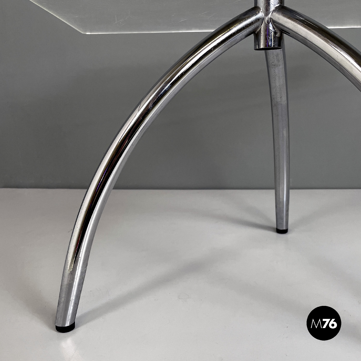 Tavolo da caffè con piano rettangolare in plexiglass trasparente. Sul piano è presenta un elemento tondo in alluminio che lo collega alla struttura, anch’essa in alluminio e composta da un cilindro centrale e da tre gambe curve a sezione tonda.