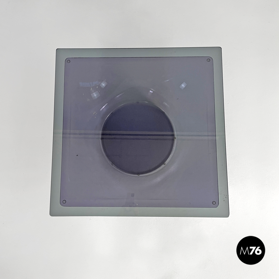 Tavolo da caffè a base tonda. Il piano è quadrato in vetro fumè grigio scuro, mentre la struttura portante è in plexiglass semitrasparente viola ed ha una forma svasata, che parte dalla base tonda per poi estendersi verso l’alto diventando quadrata. Con piccoli piedini sferici trasparenti.