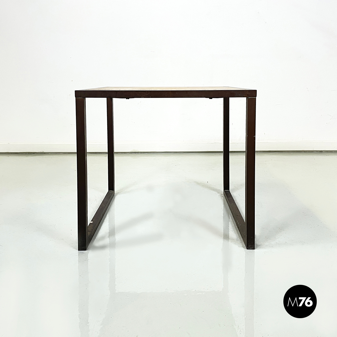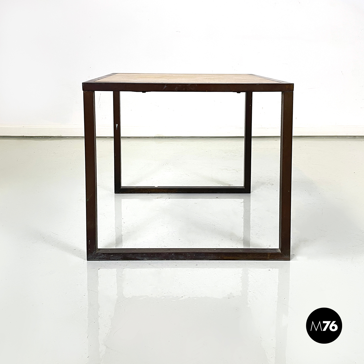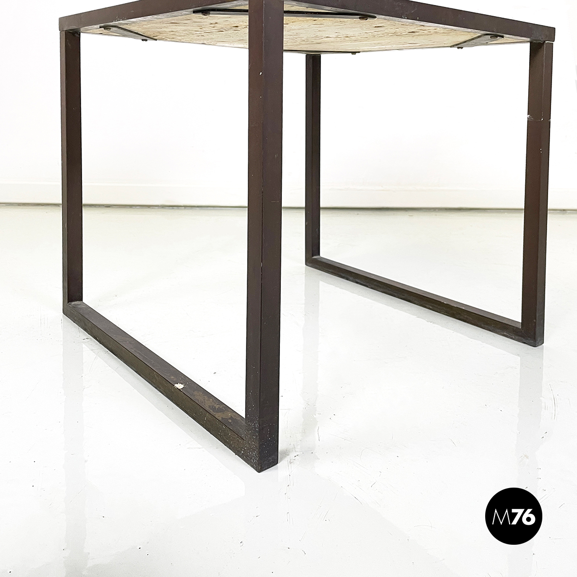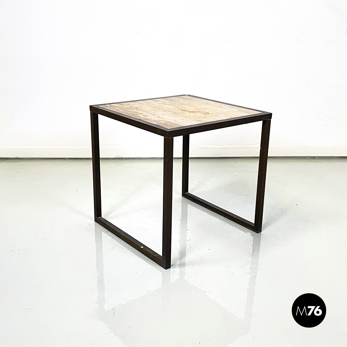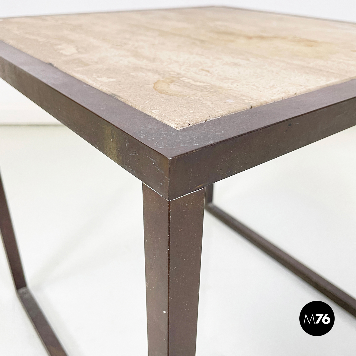 Tavolo da caffè con piano quadrato in travertino. La struttura, composta dal profilo della lastra in travertino e le zampe, è in metallo a sezione quadrata.