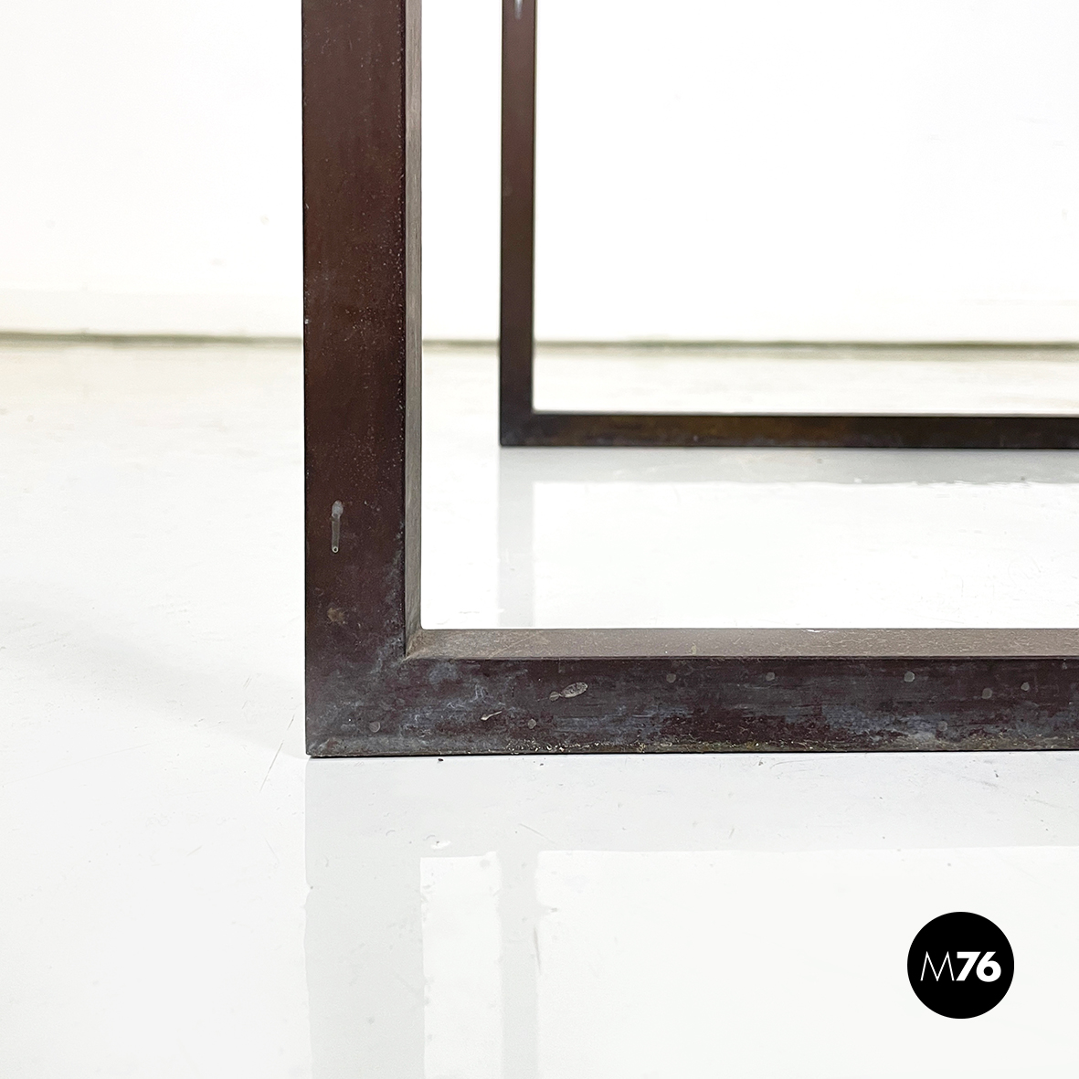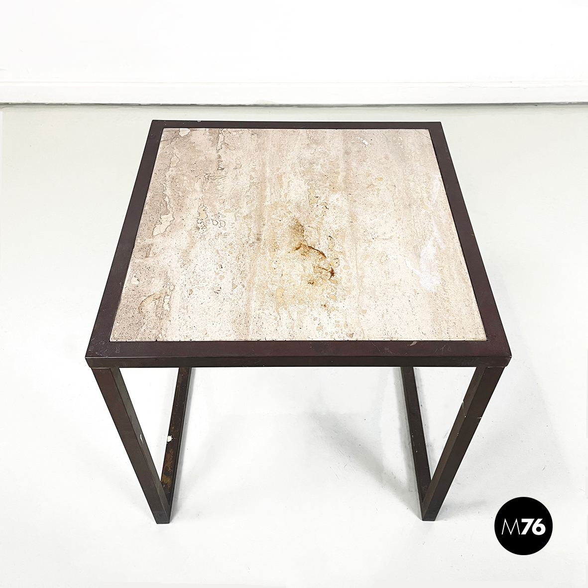 Condizioni vintage, il metallo presenta mancanze di colore e segni sparsi. Sul piano in travertino è presente una macchia bianca.