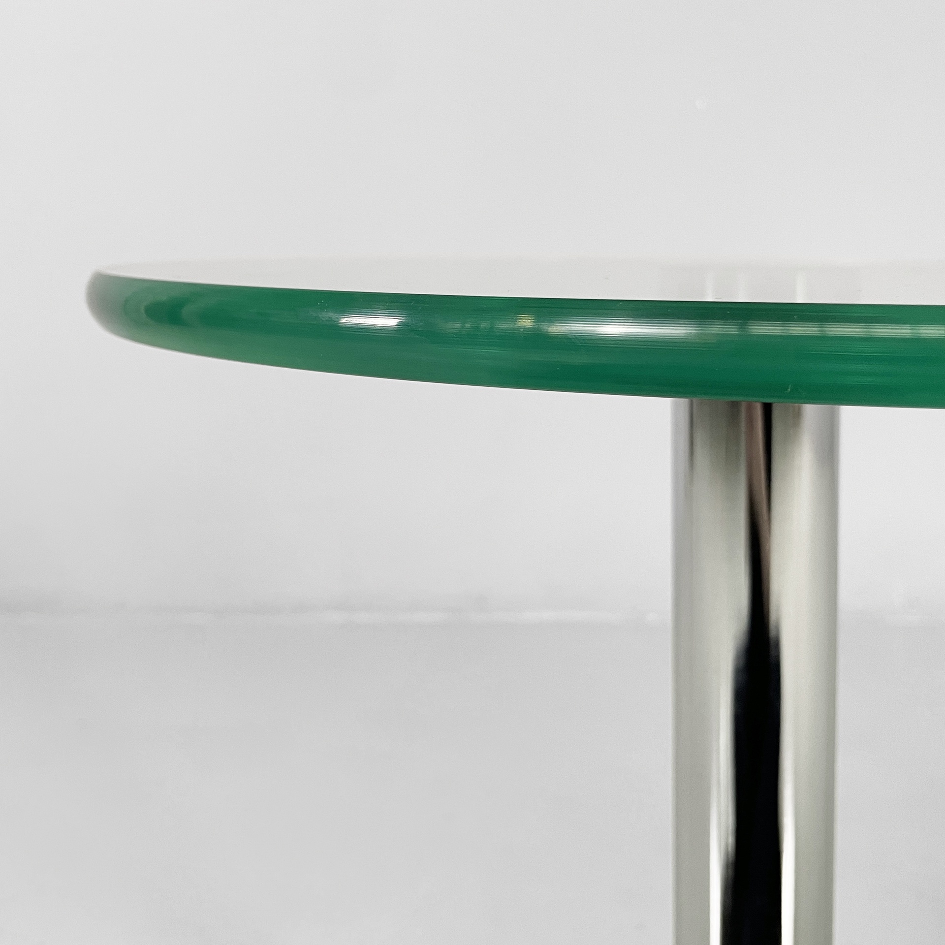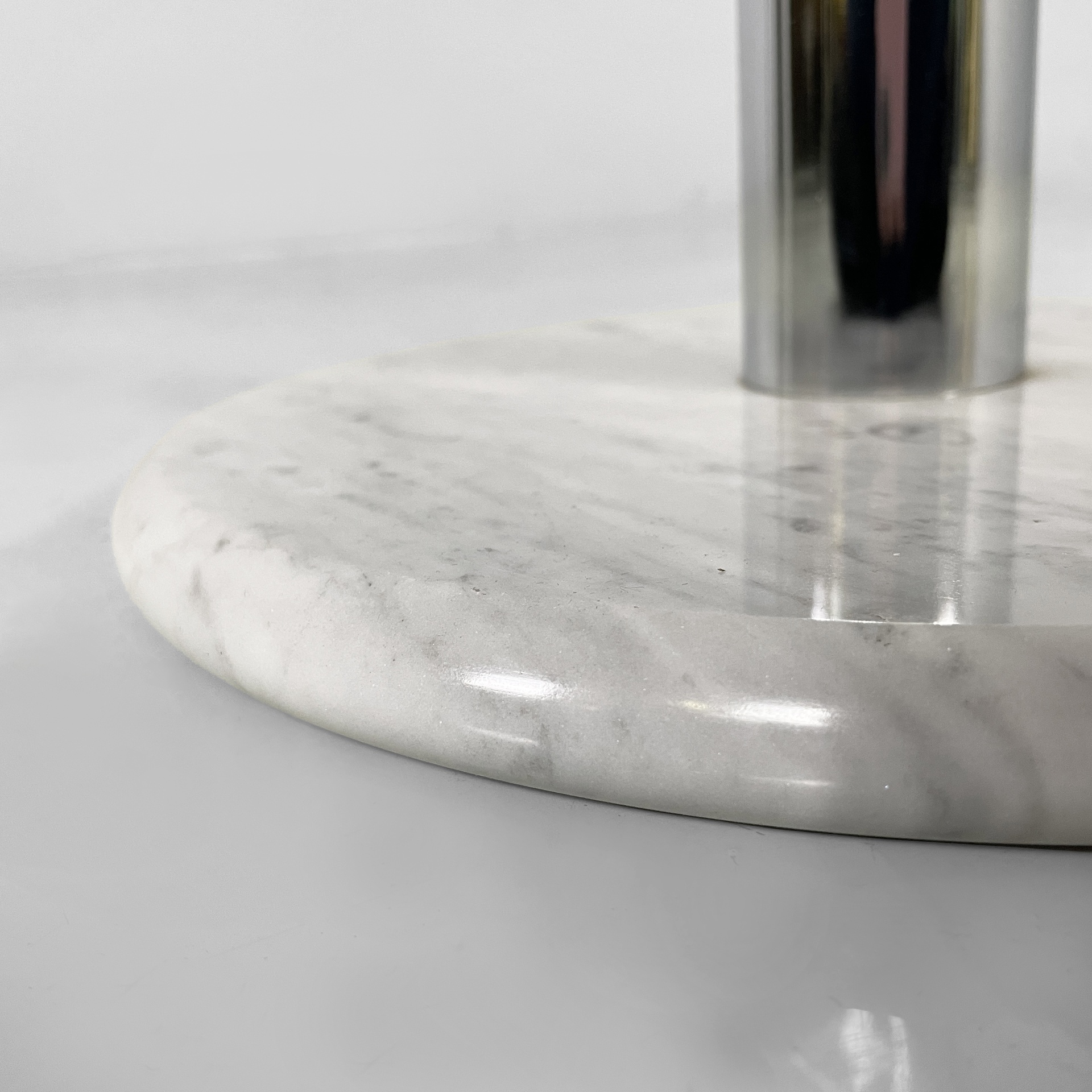 Tavolo da caffè con piano tondo in vetro di grosso spessore. La struttura è in tubolare di acciaio. La base tonda è in marmo.