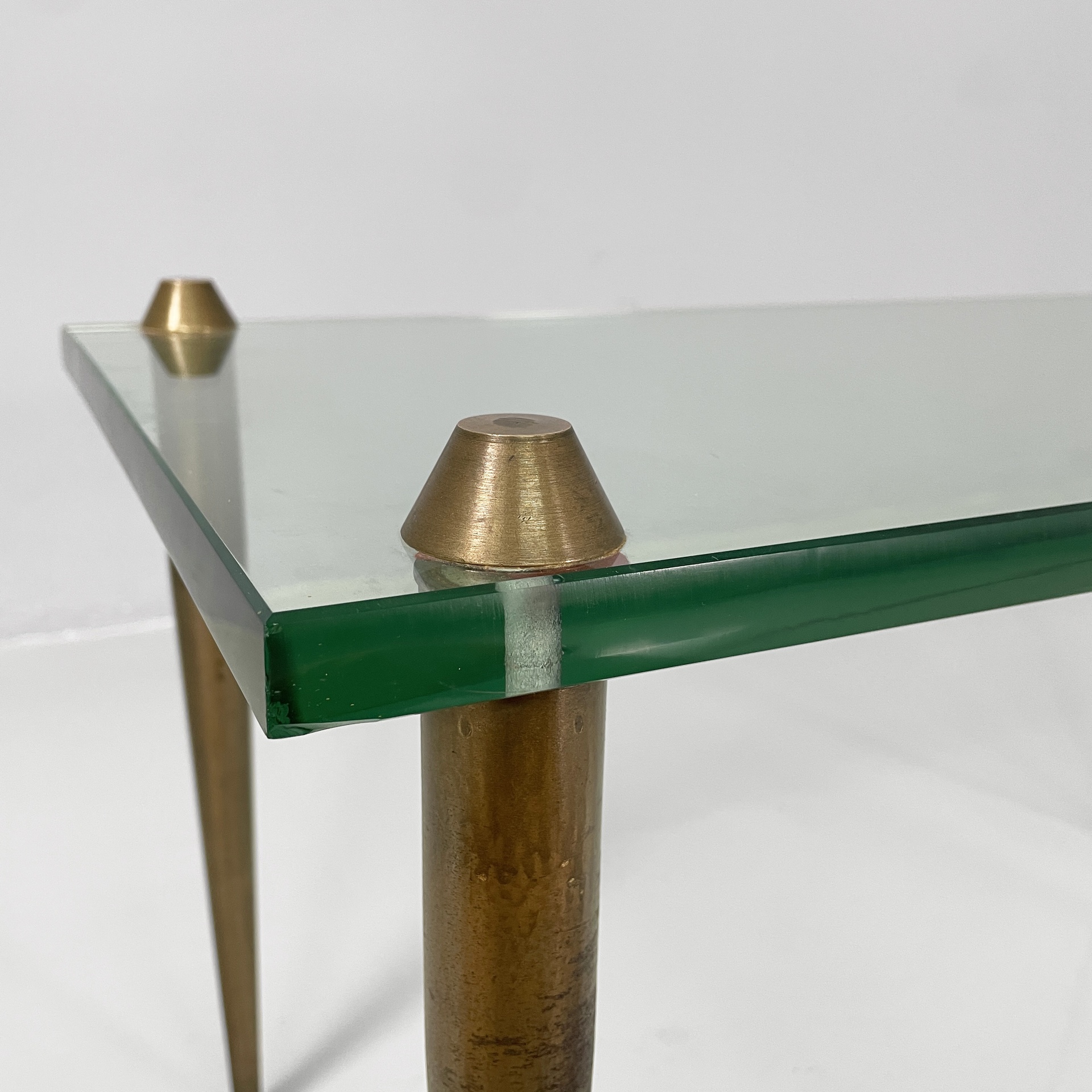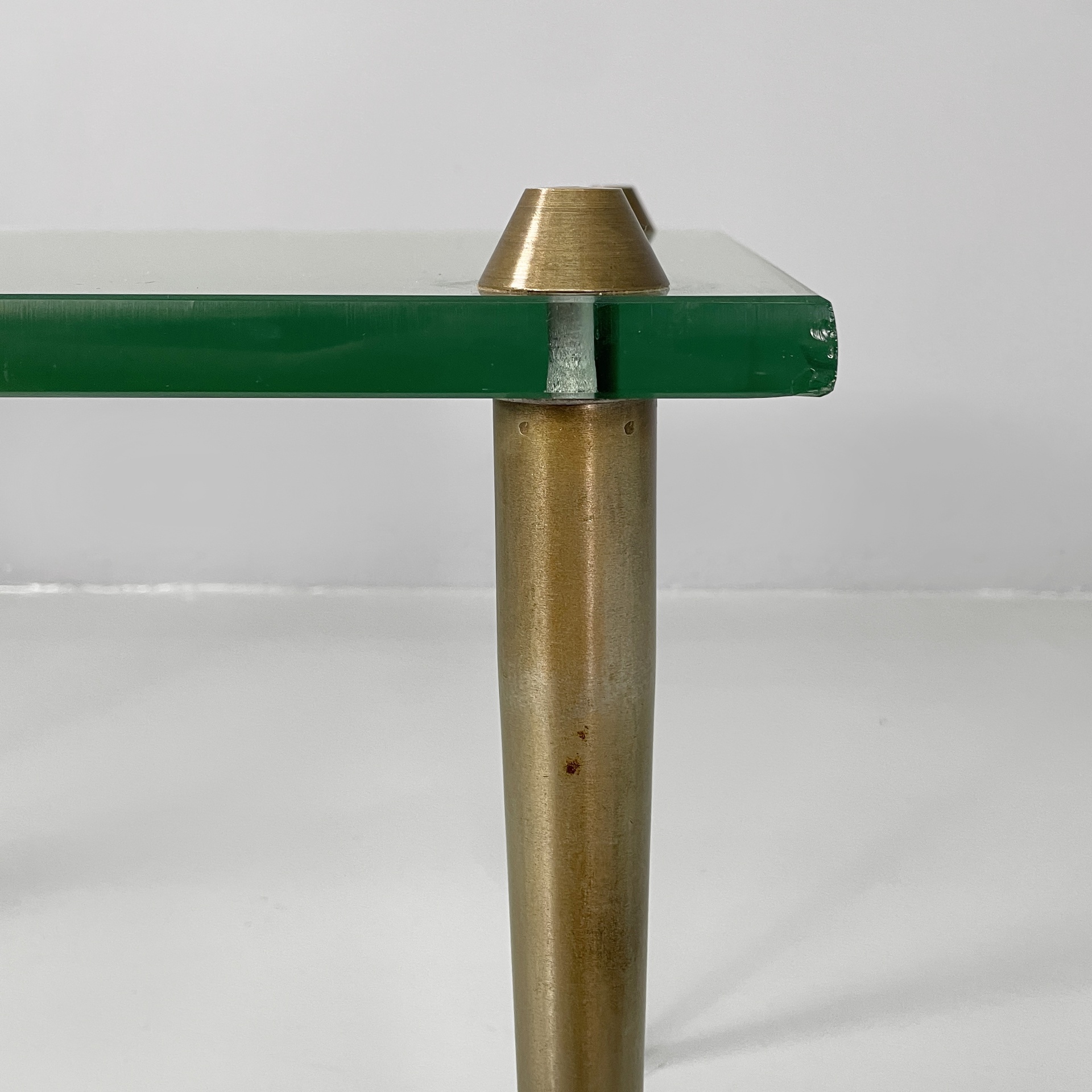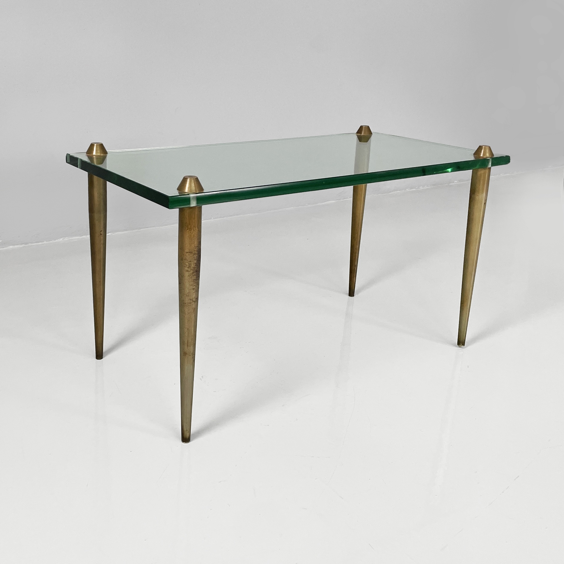Tavolo da caffè con piano rettangolare in vetro di grosso spessore. Le zampe, che sostengono il piano, a sezione tonda sono in ottone.