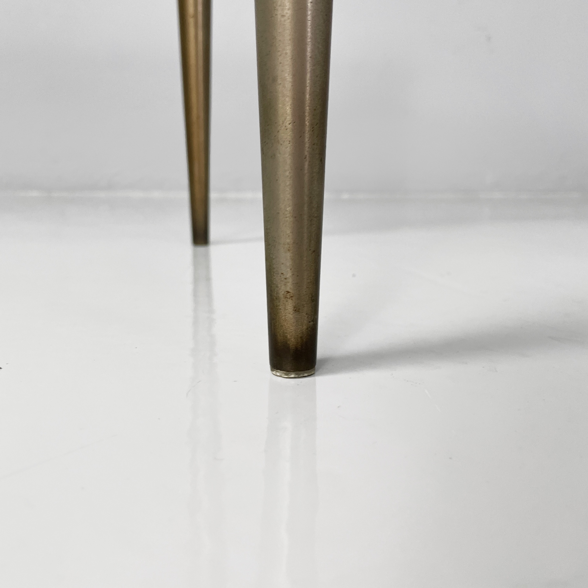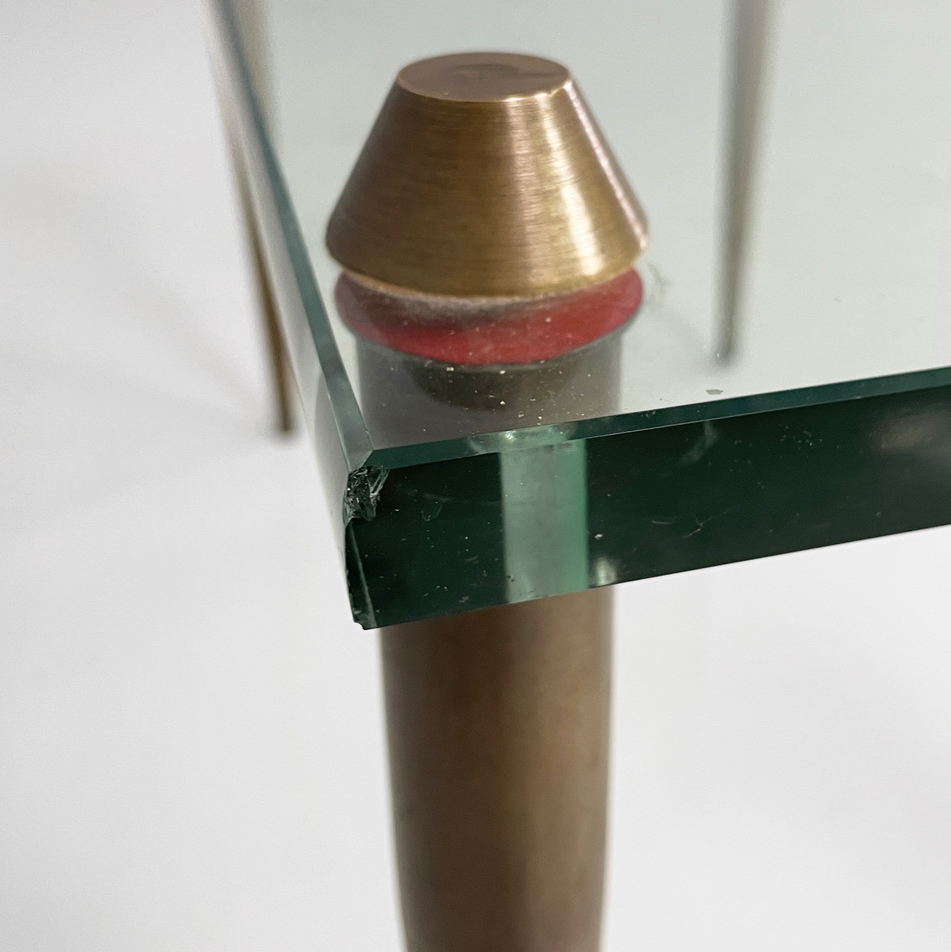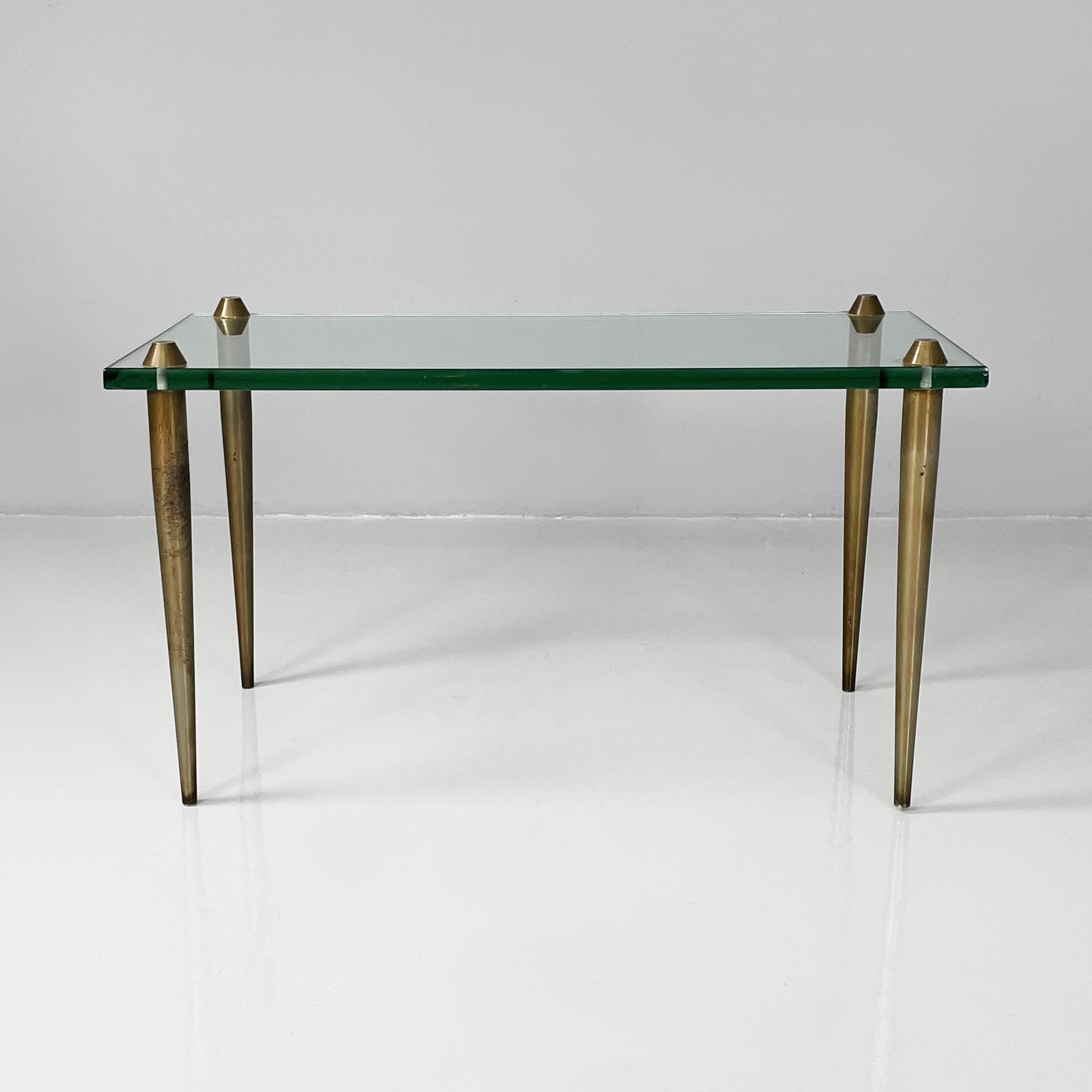 Tavolo da caffè con piano rettangolare in vetro di grosso spessore. Le zampe, che sostengono il piano, a sezione tonda sono in ottone.