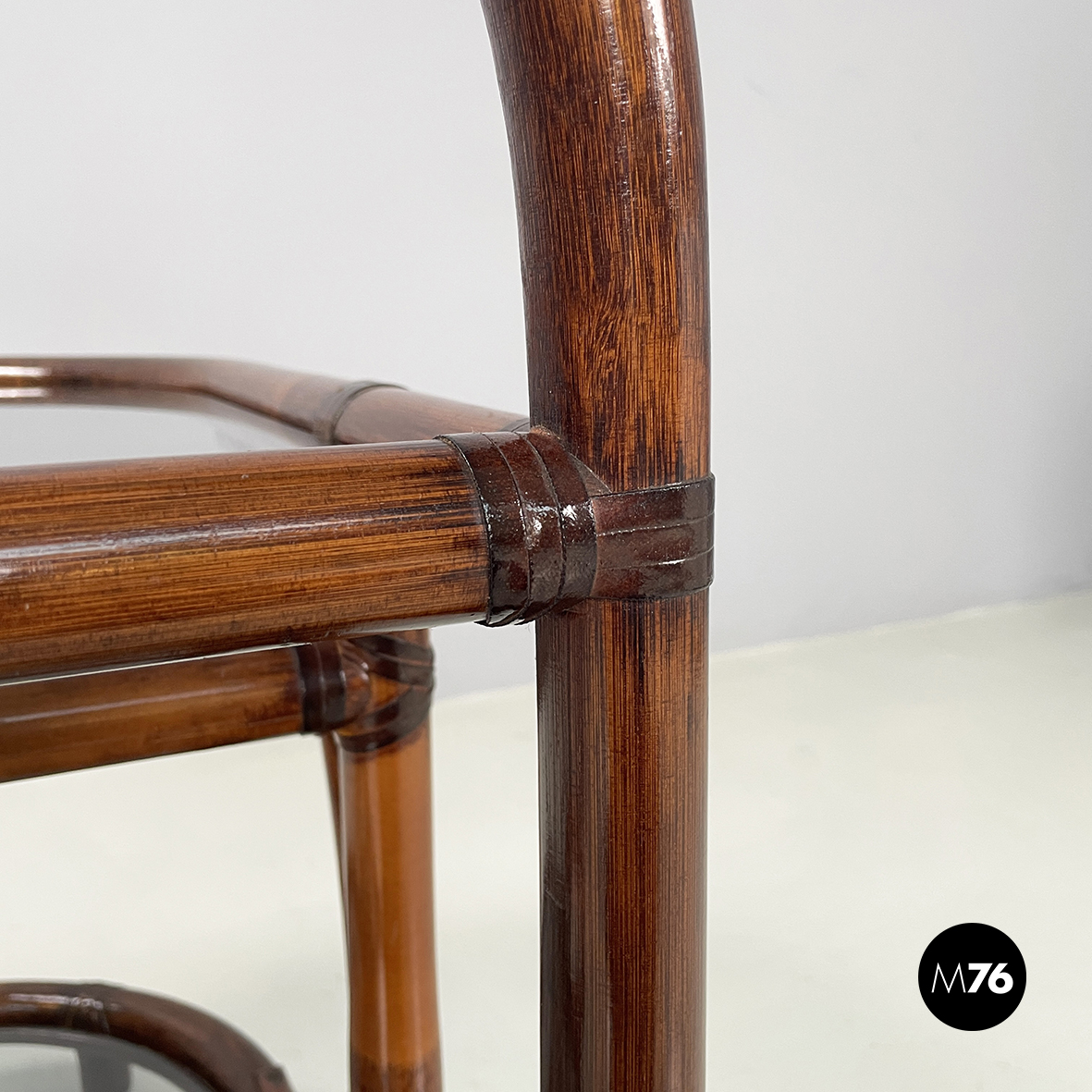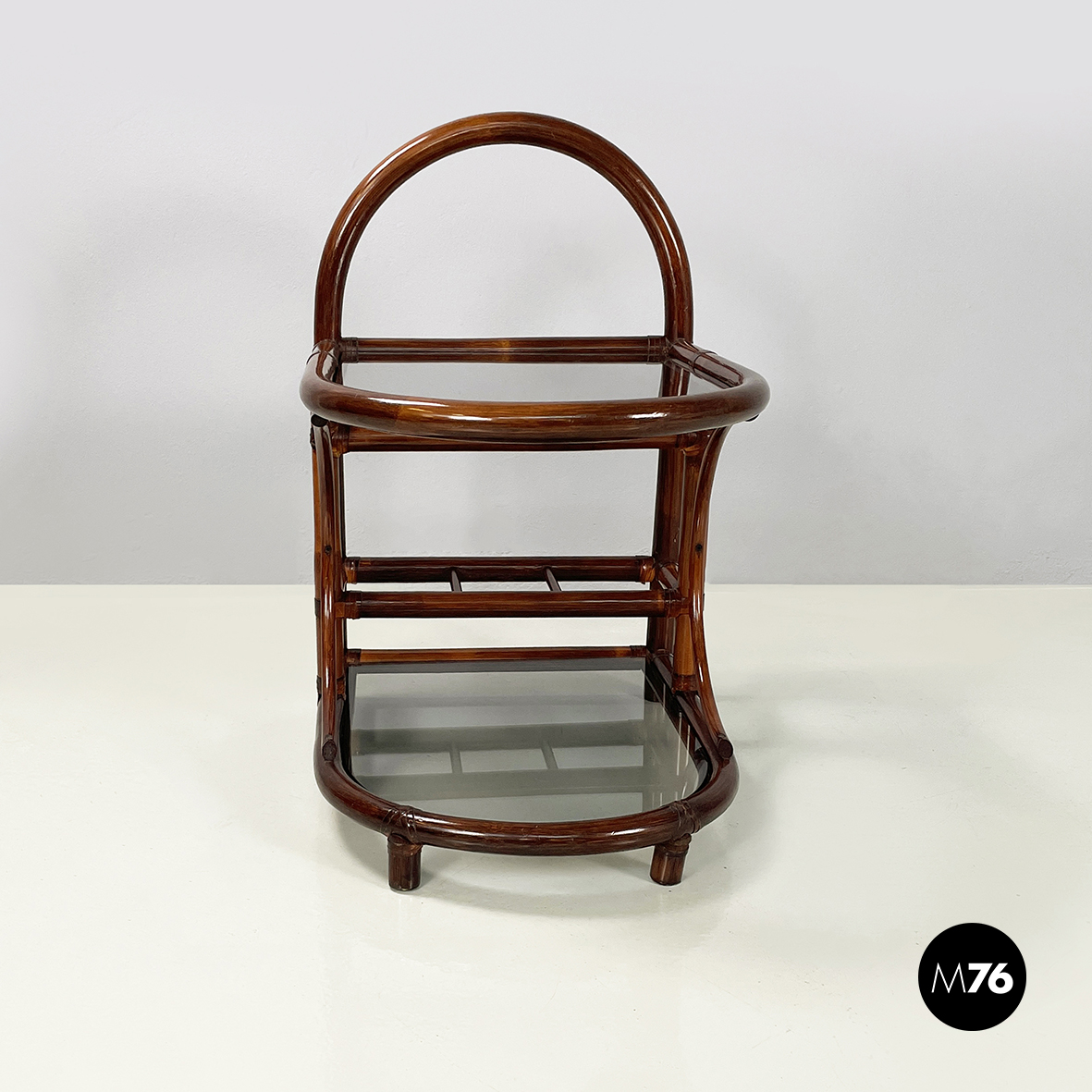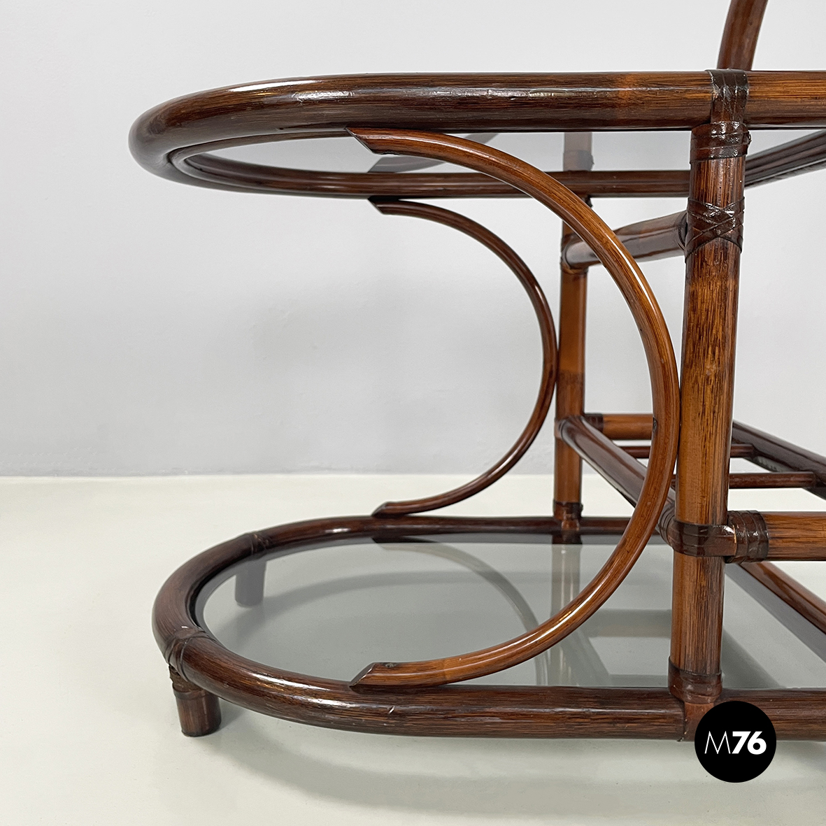 Tavolo da caffè a due piani in vetro fumè e bambù curvato scuro. I due ripiani presentano un lato tondeggiante con interni in vetro e profili in bambù. Nel piano inferiore sono presenti tre portabottiglie a sezione quadrata. La struttura e il manico sono in bambù curvato. Alla base presenta 4 piedini a sezione tonda