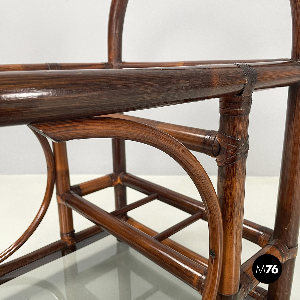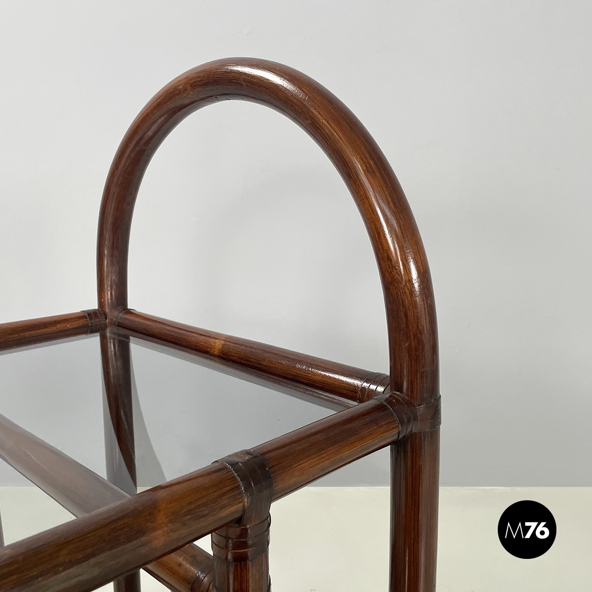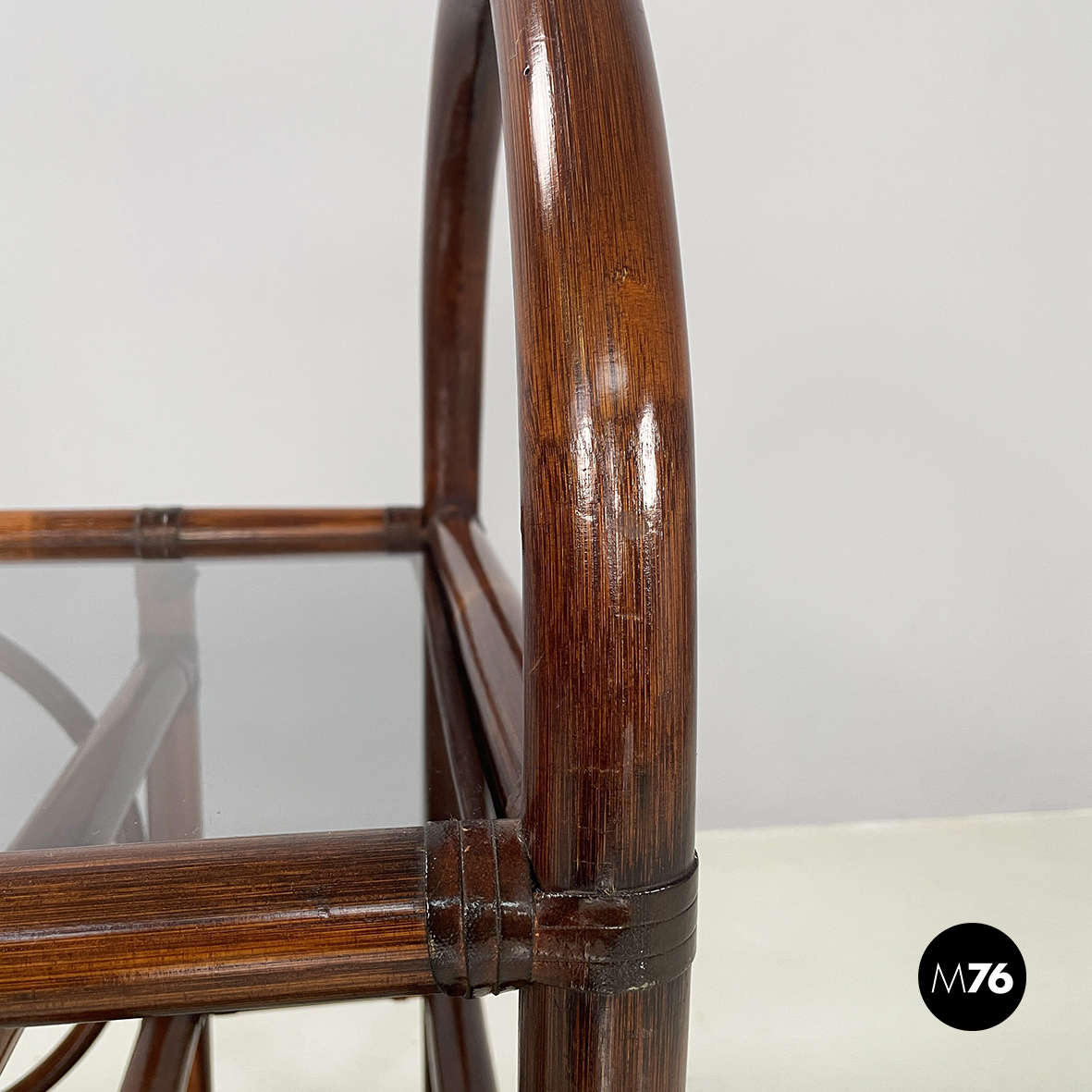 Tavolo da caffè a due piani in vetro fumè e bambù curvato scuro. I due ripiani presentano un lato tondeggiante con interni in vetro e profili in bambù. Nel piano inferiore sono presenti tre portabottiglie a sezione quadrata. La struttura e il manico sono in bambù curvato. Alla base presenta 4 piedini a sezione tonda