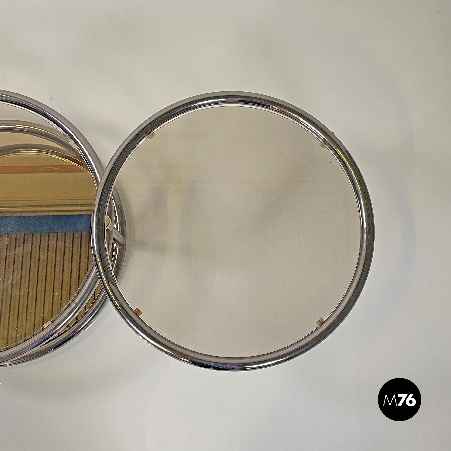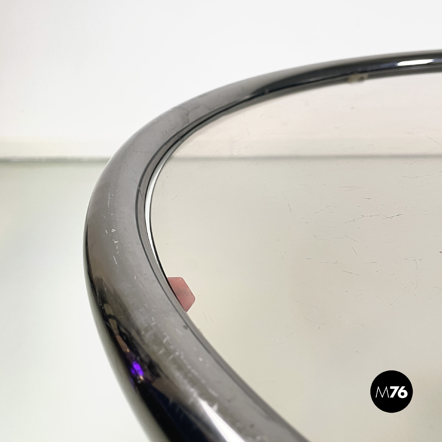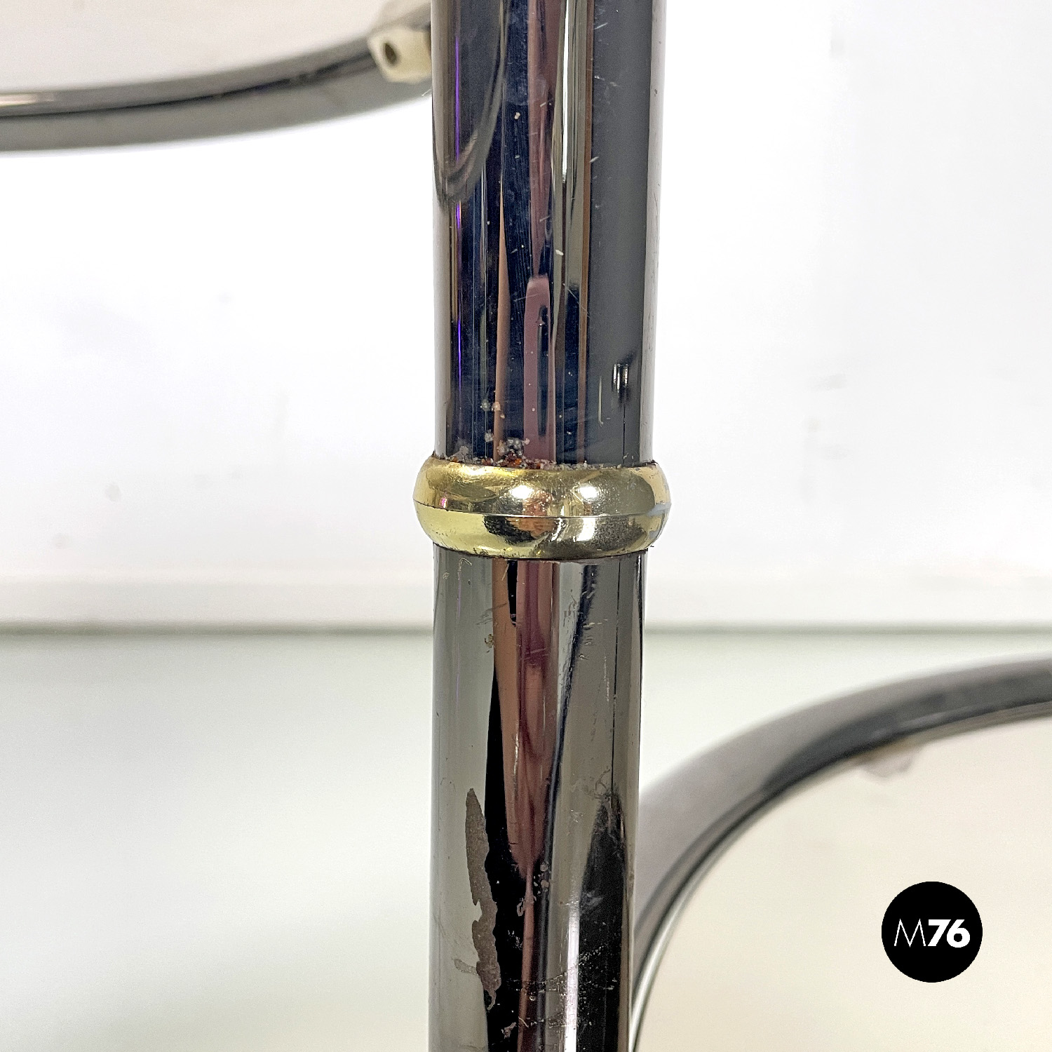 Tavolo da caffè a base tonda con struttura in tubolare di metallo cromato scuro. Il tavolo è composto da quattro piani in vetro fumé di cui i due superiori estraibili quello più in basso è specchiato. I due piani superiori sono girevoli.