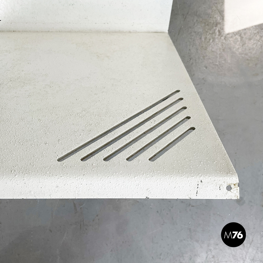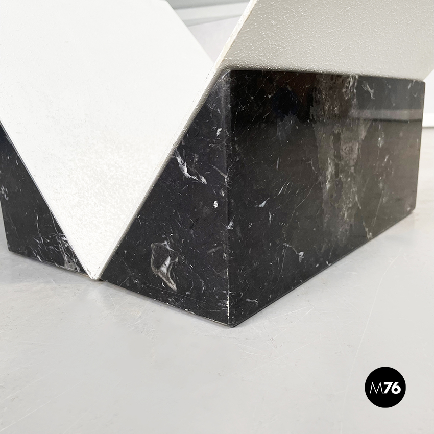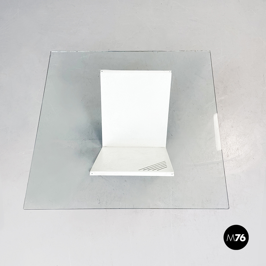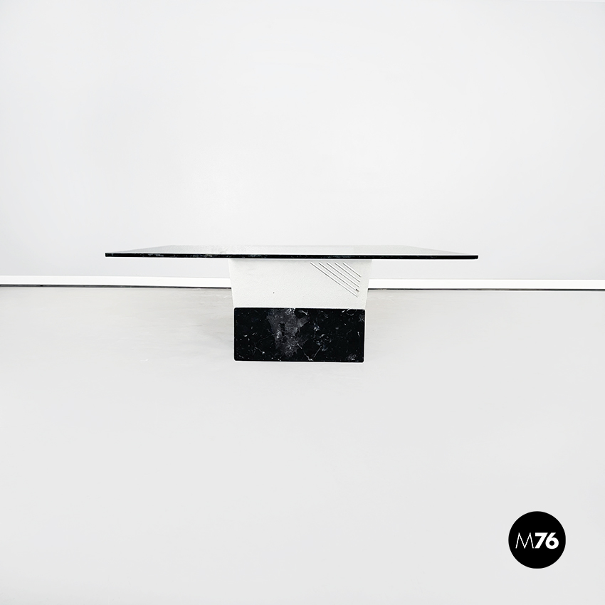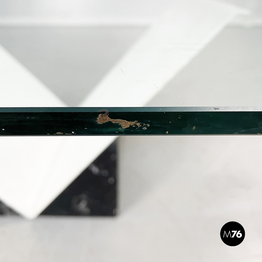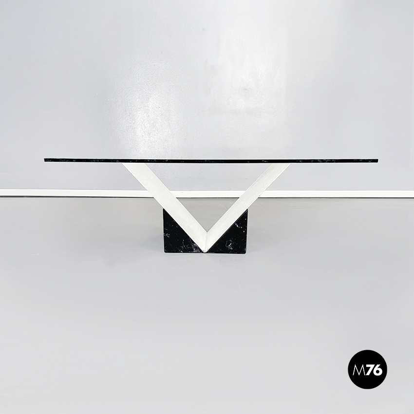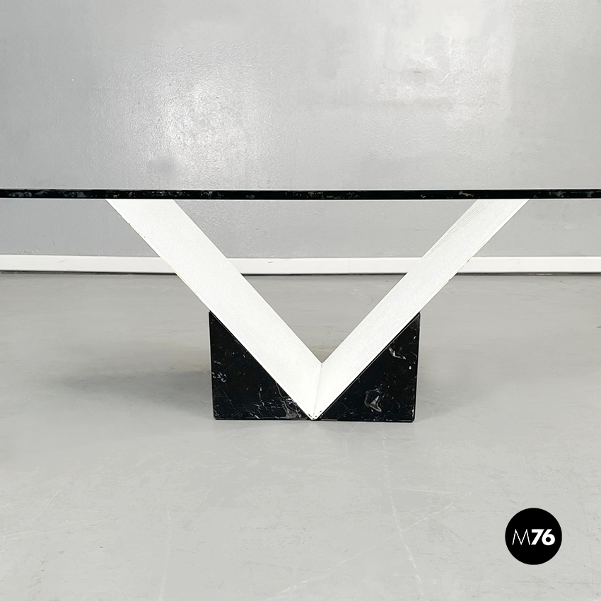 Tavolo da caffè con piano quadrato in vetro spesso. La base è formata da una struttura a V in metallo verniciato bianco, incastrato in blocco di marmo nero marquinia.