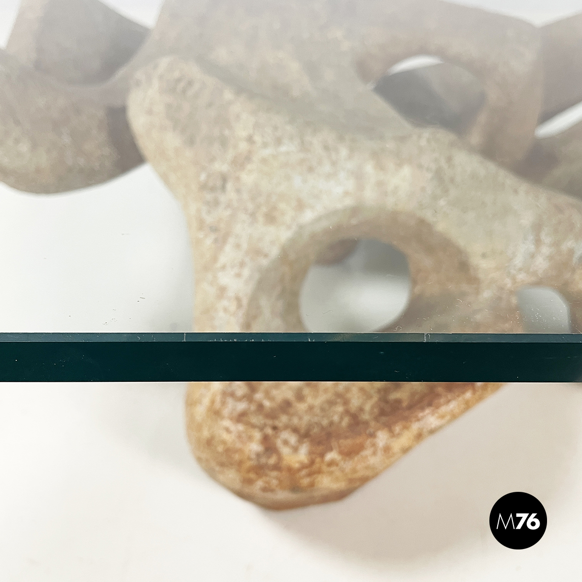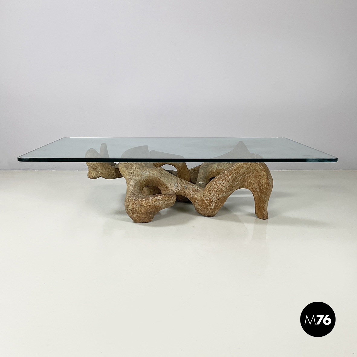 Tavolo da caffè modello Kamasutra con piano rettangolare ad angoli arrotondati in vetro. La base di forma organico scultorea è in cemento con struttura interna in metallo.