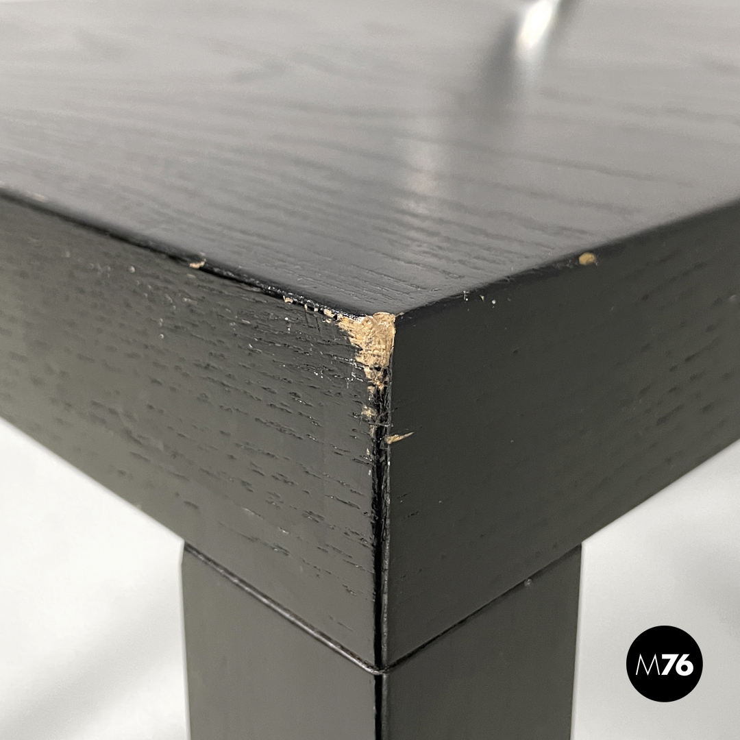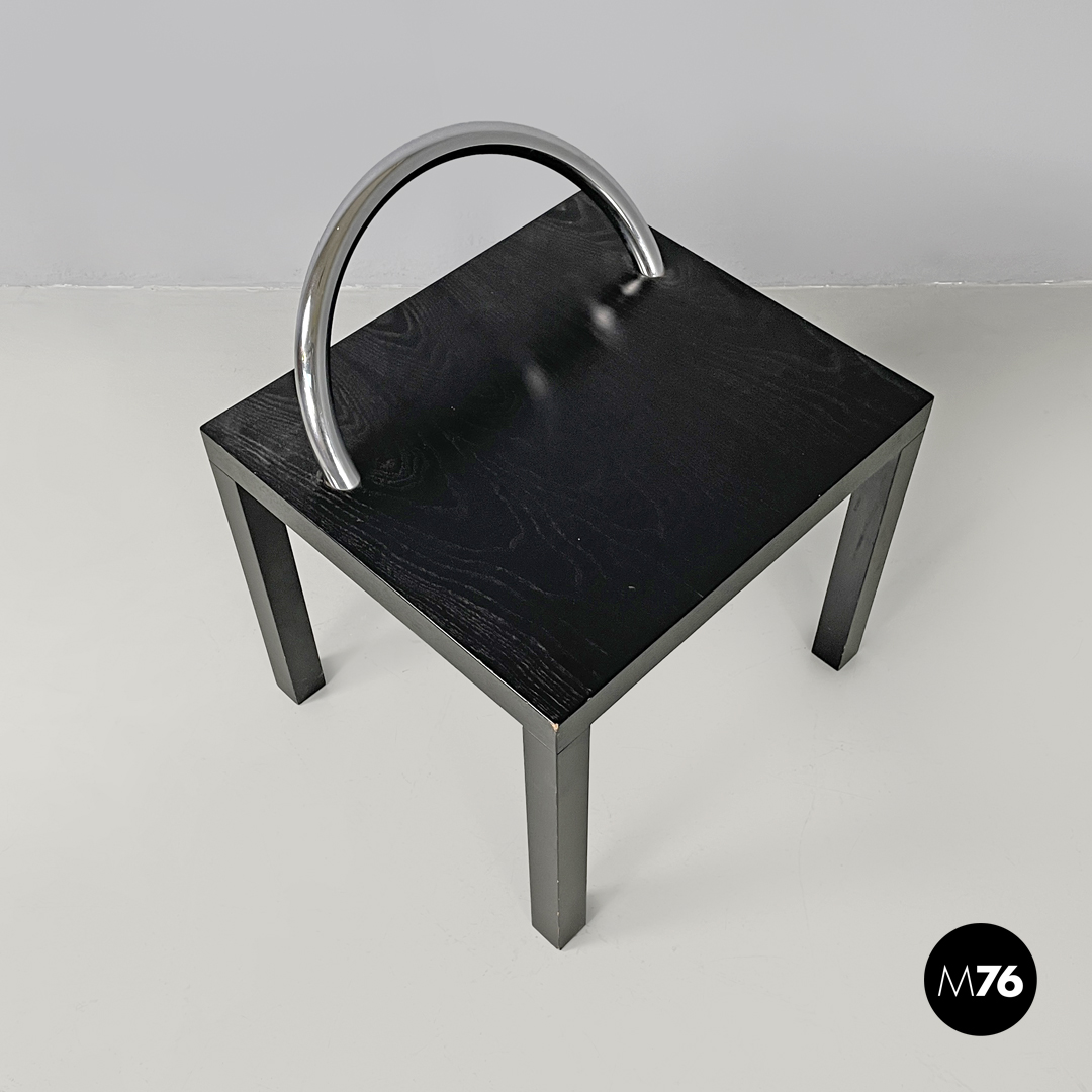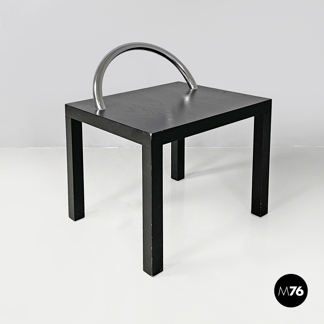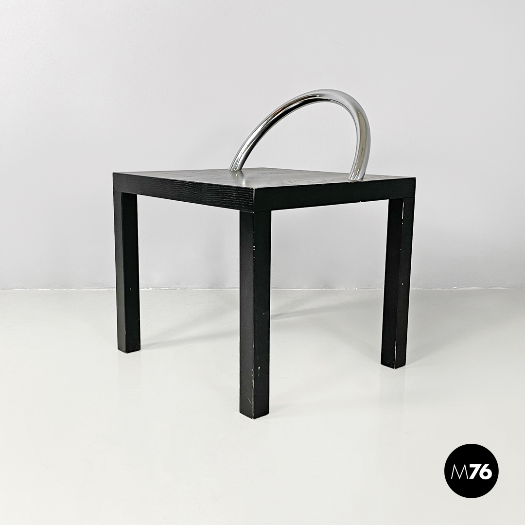 Tavolo da caffè modello Ko-Ko in legno nero a base quadrata. Su un lato del piano è presente una maniglia in tubolare di metallo utilizzabile anche come schienale, così da trasformare il tavolo anche in sgabello o sedia. Le quattro gambe sono a sezione quadrata.