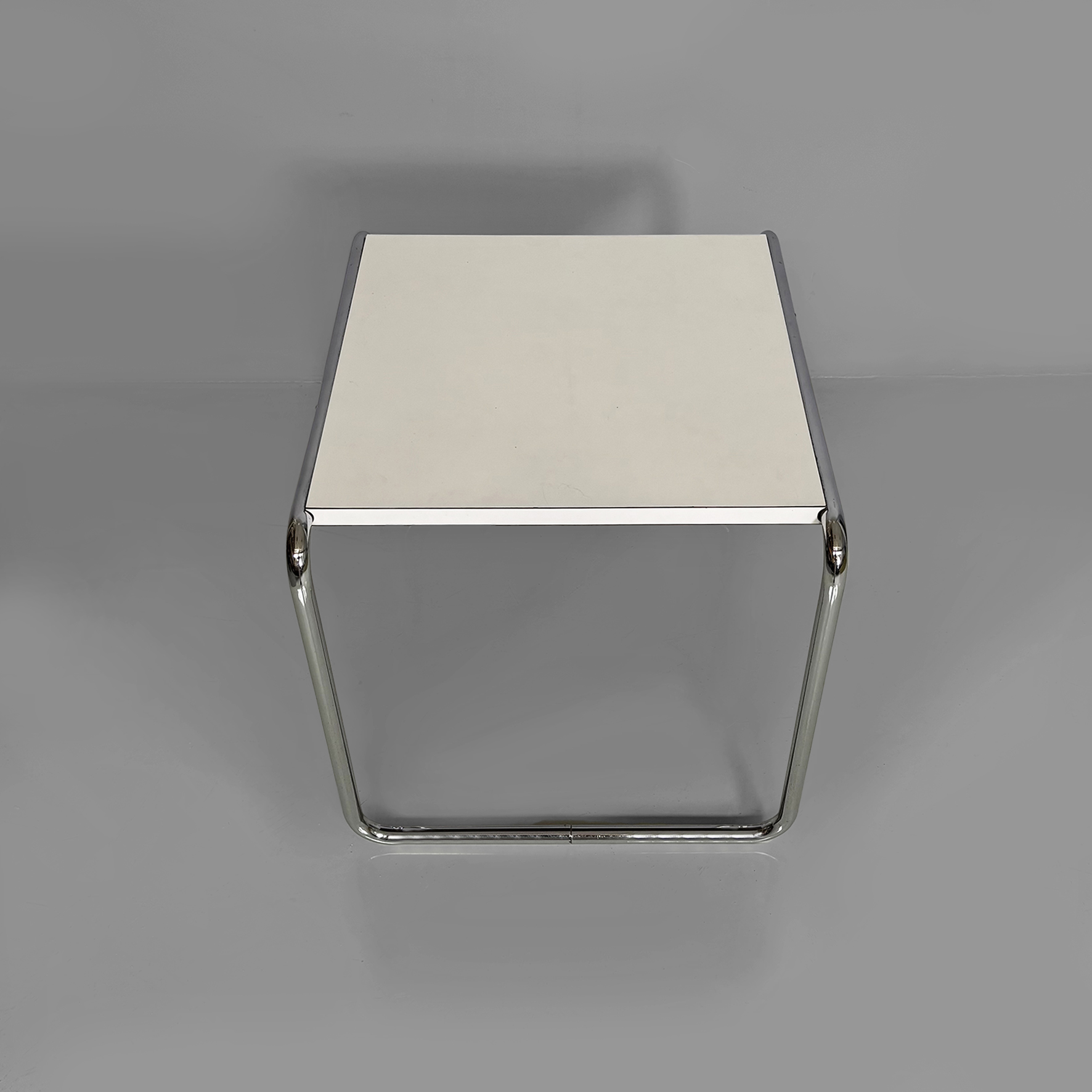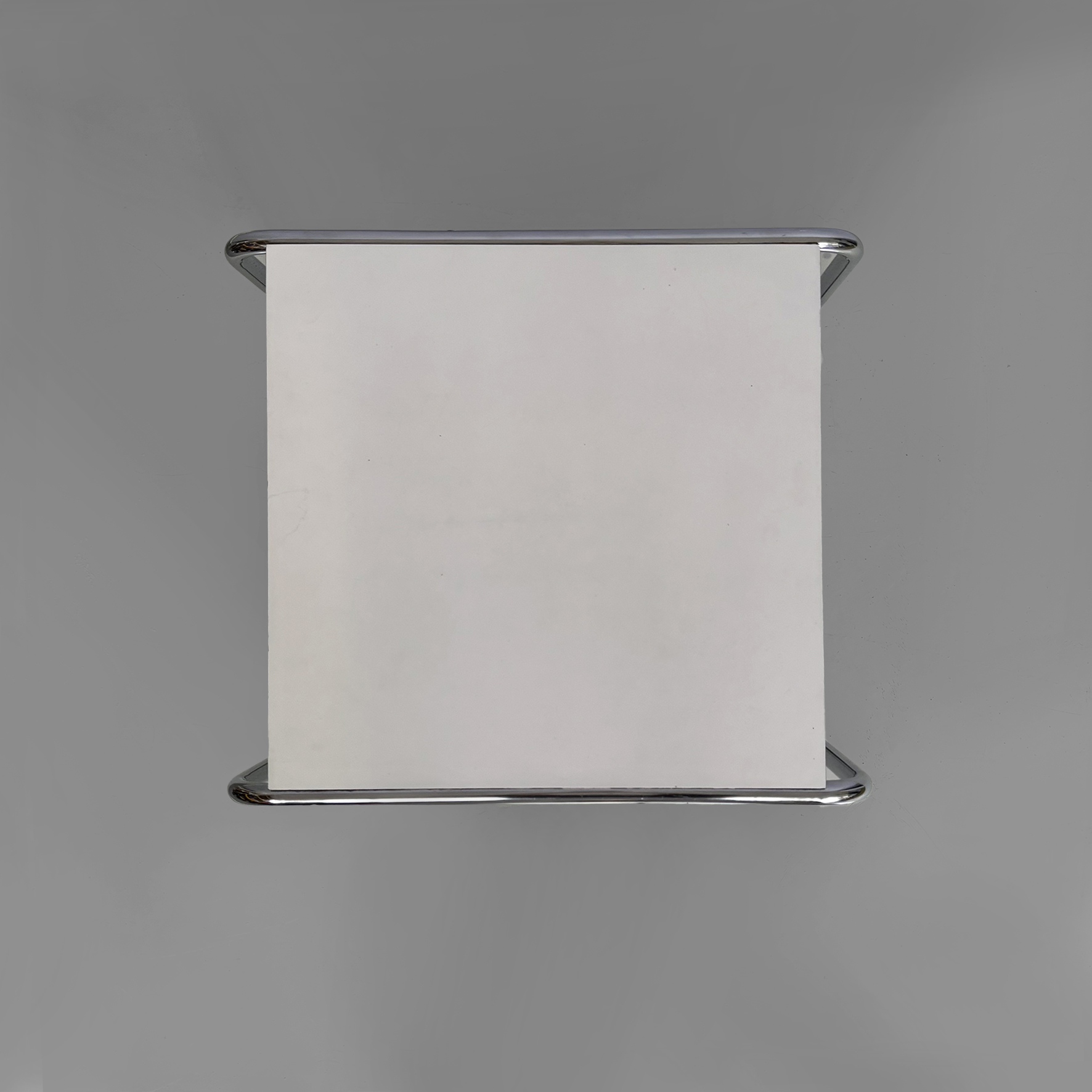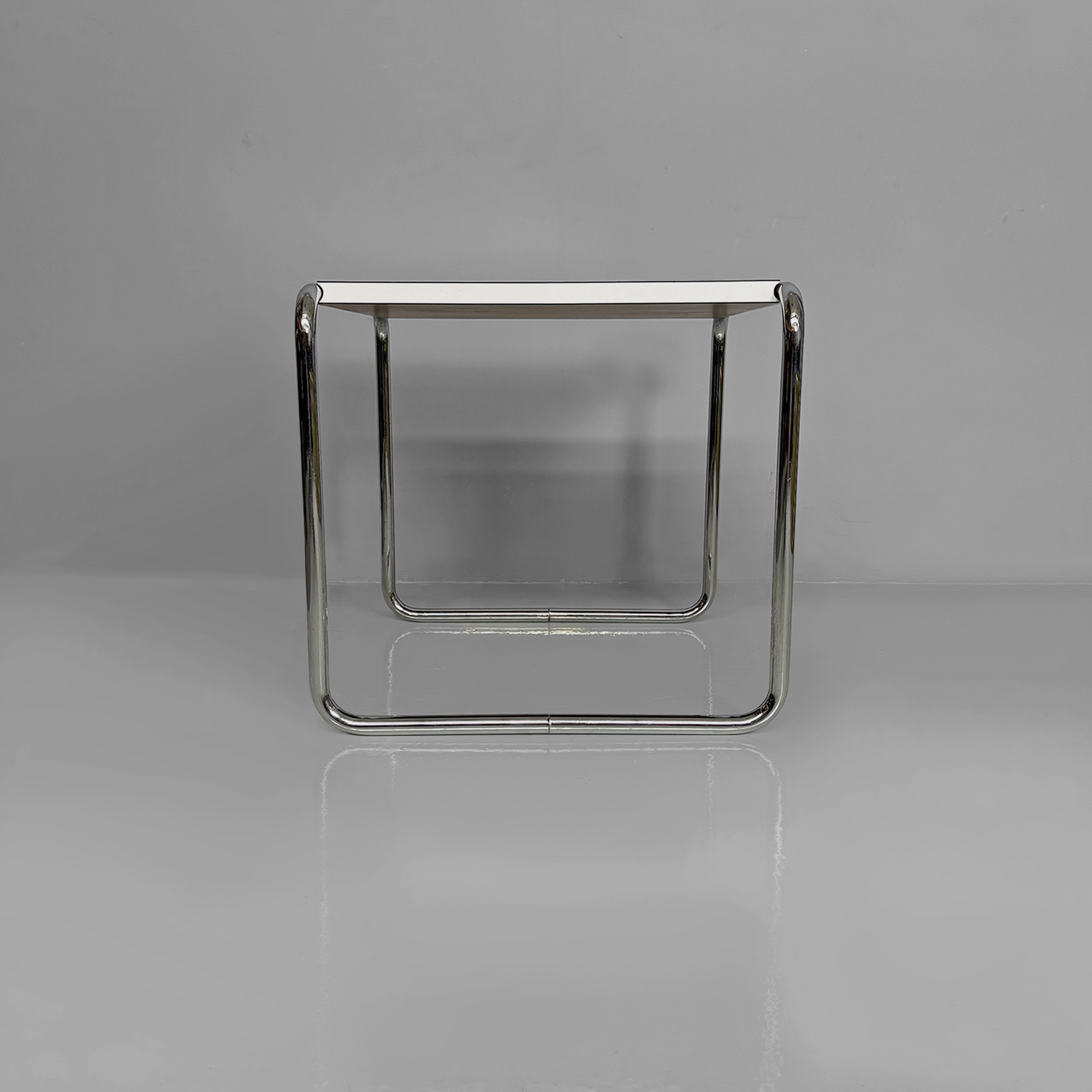 Tavolo da caffè modello Laccio con piano squadrato in legno verniciato bianco. La struttura è in tubolare di acciaio cromato.