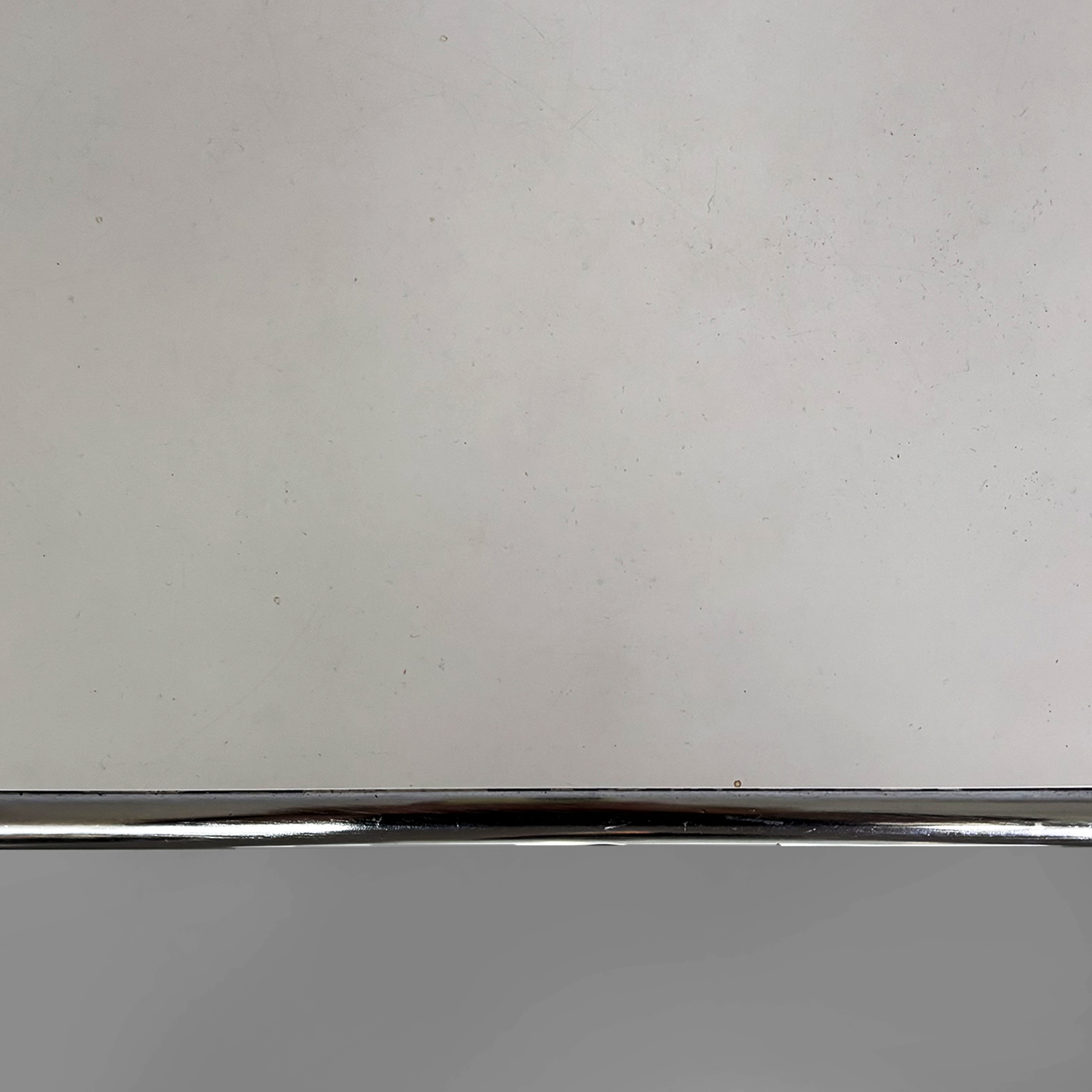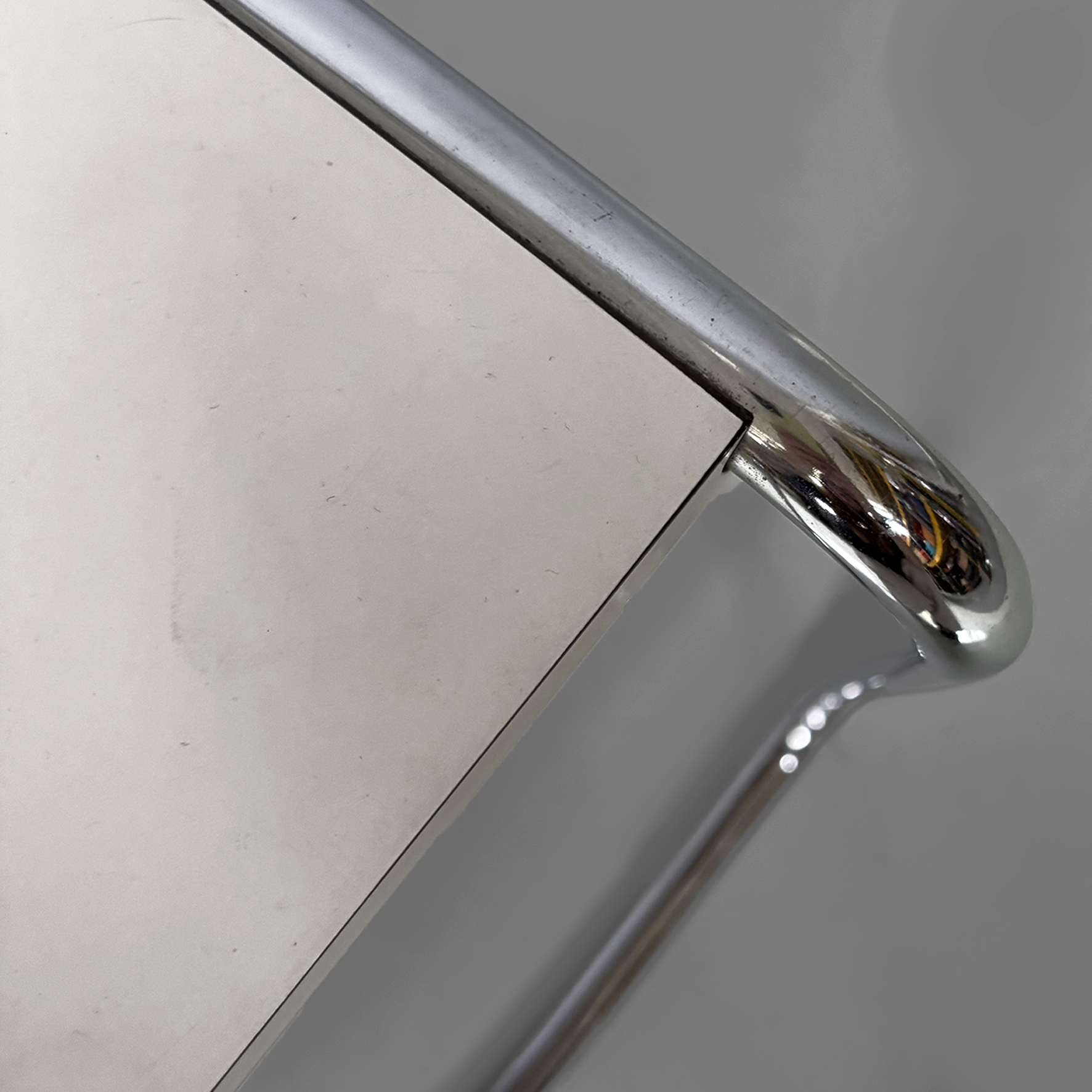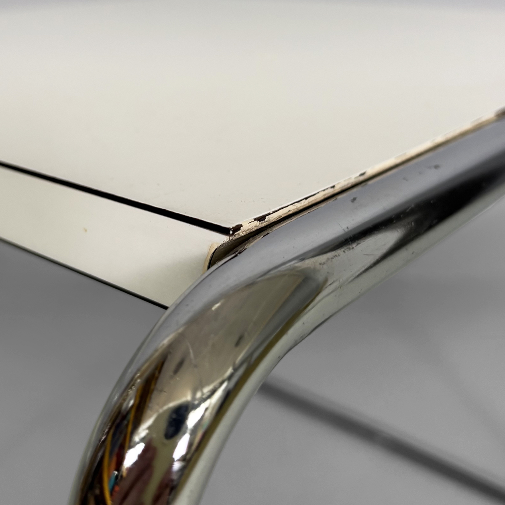 Tavolo da caffè modello Laccio con piano squadrato in legno verniciato bianco. La struttura è in tubolare di acciaio cromato.
