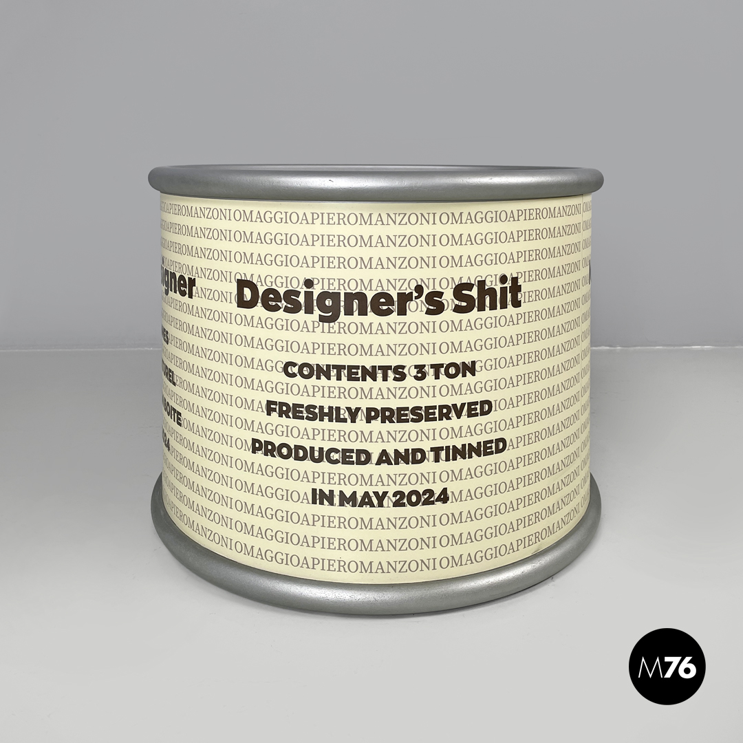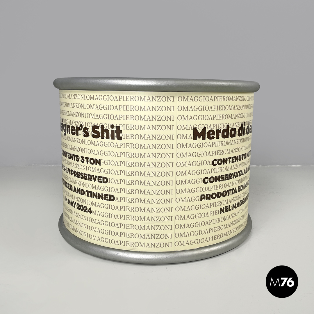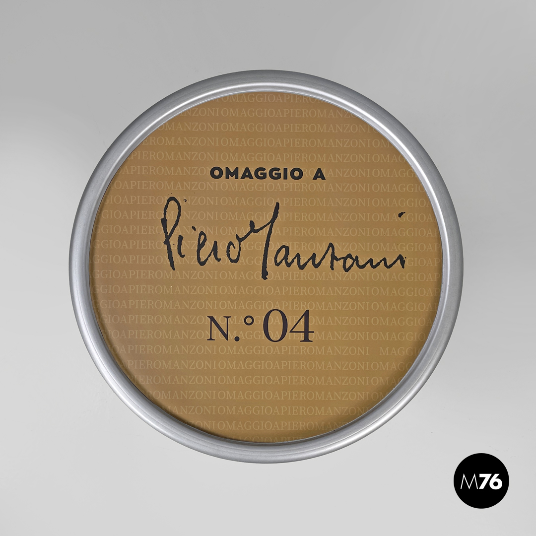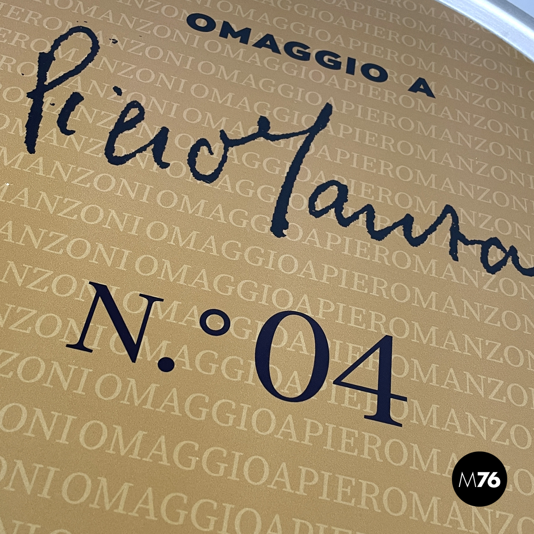 Tavolo da caffè modello Merda di Designer tondo in legno. Il bordo del piano e della base sono tondeggianti e verniciati color argento. La struttura è rivestita di plastica stampata, sul piano si trova la scritta “omaggio a Piero Manzoni n° 04” in nero su sfondo giallo senape scuro con scritta in filigrana “omaggio a Piero Manzoni” in un giallo leggermente più chiaro. Sui fianchi del tavolo si trova “Merda di designer contenuto netto 3T conservata al naturale prodotta ed inscatolata nel maggio 2024”, anch’essa in nero su sfondo giallo chiaro con scritta grigia in filigrana. Questo testo è riportato in lingua italiana, inglese, francese e tedesca.