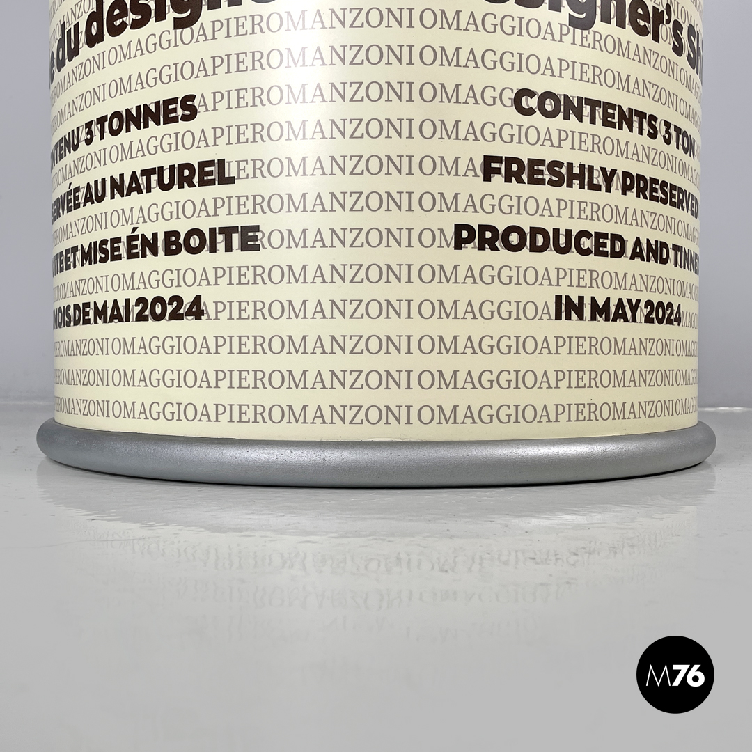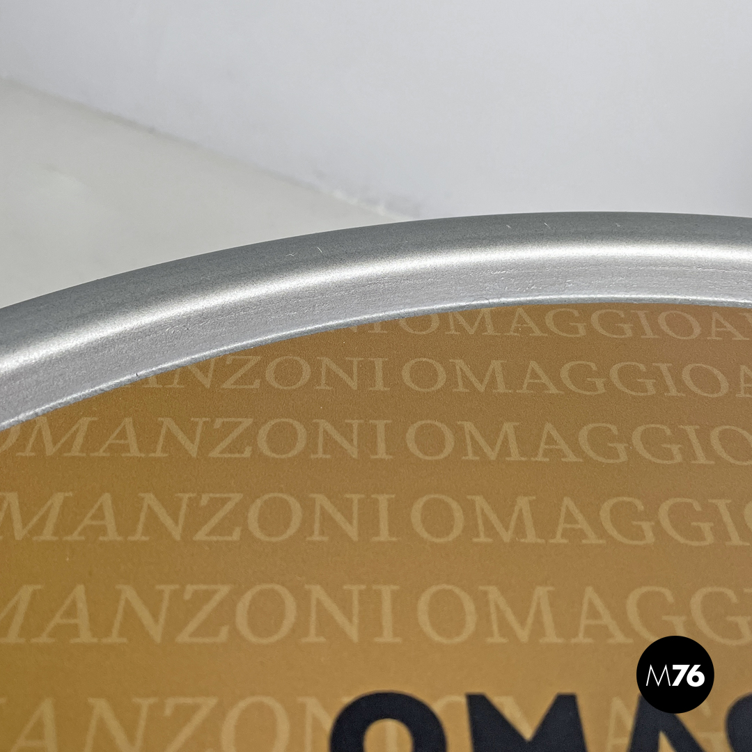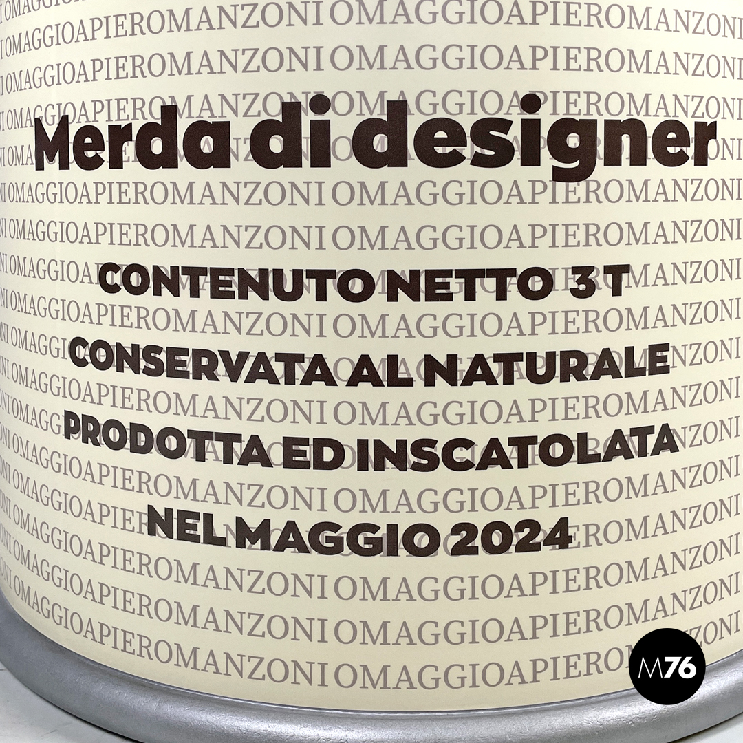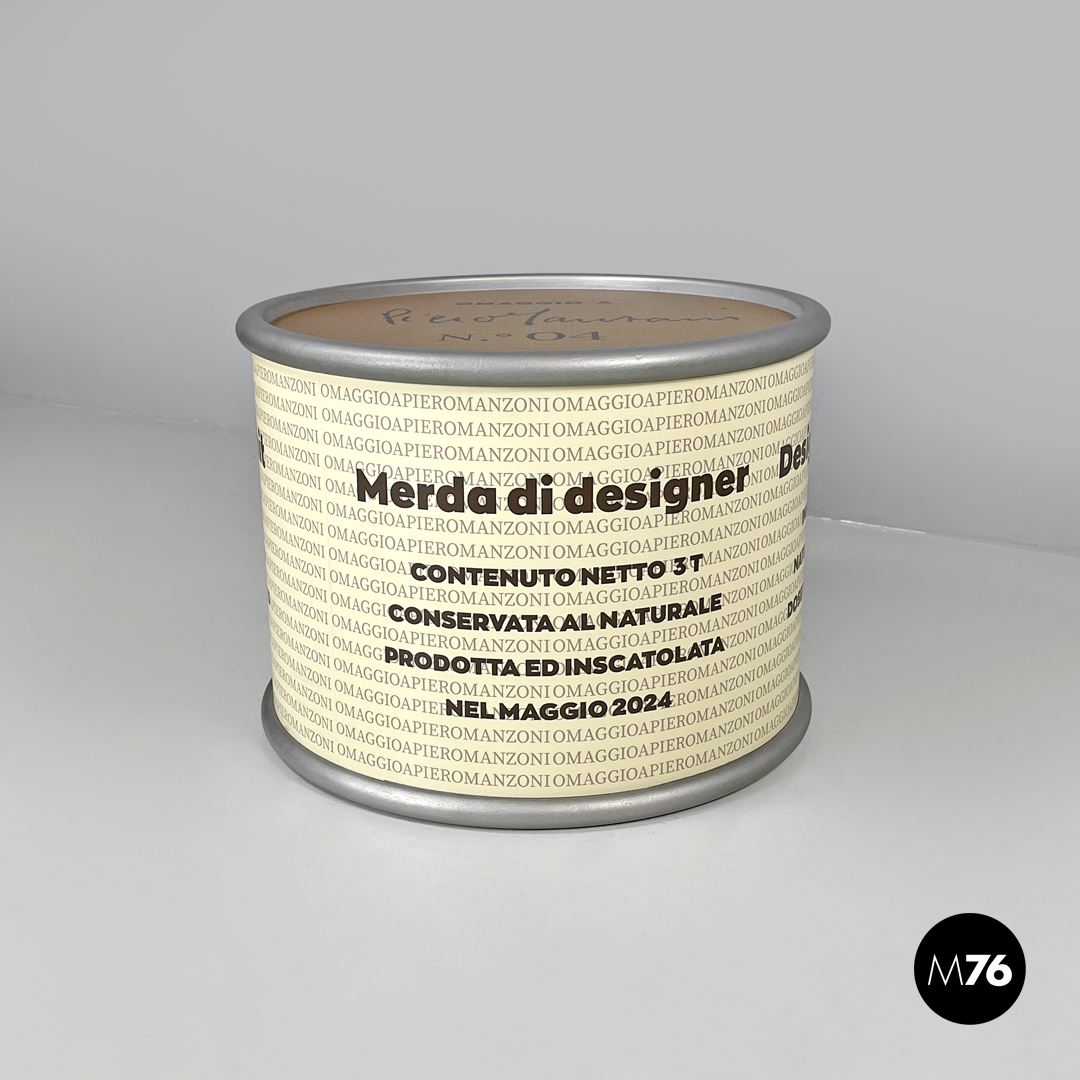 Tavolo da caffè modello Merda di Designer tondo in legno. Il bordo del piano e della base sono tondeggianti e verniciati color argento. La struttura è rivestita di plastica stampata, sul piano si trova la scritta “omaggio a Piero Manzoni n° 04” in nero su sfondo giallo senape scuro con scritta in filigrana “omaggio a Piero Manzoni” in un giallo leggermente più chiaro. Sui fianchi del tavolo si trova “Merda di designer contenuto netto 3T conservata al naturale prodotta ed inscatolata nel maggio 2024”, anch’essa in nero su sfondo giallo chiaro con scritta grigia in filigrana. Questo testo è riportato in lingua italiana, inglese, francese e tedesca.