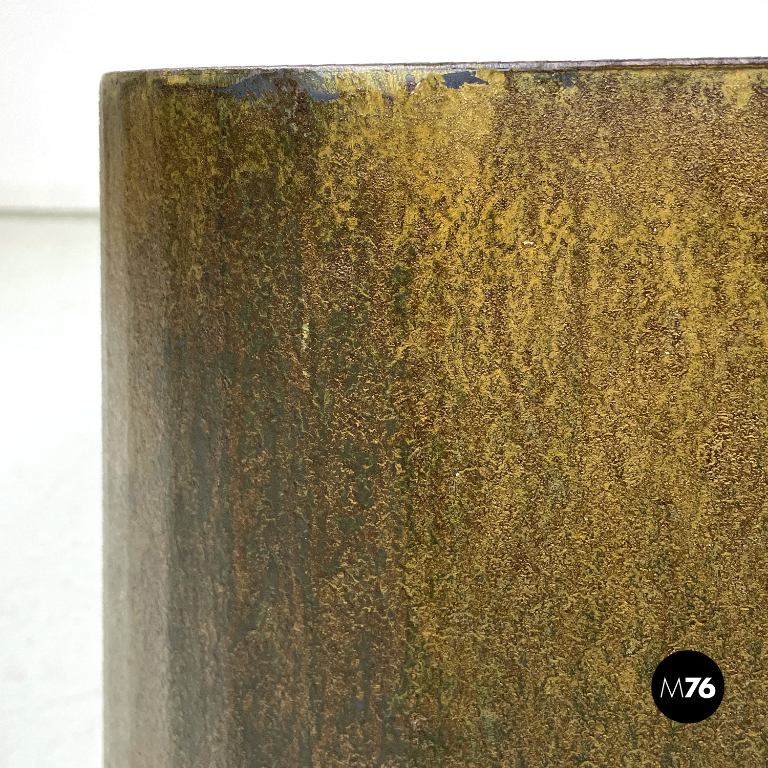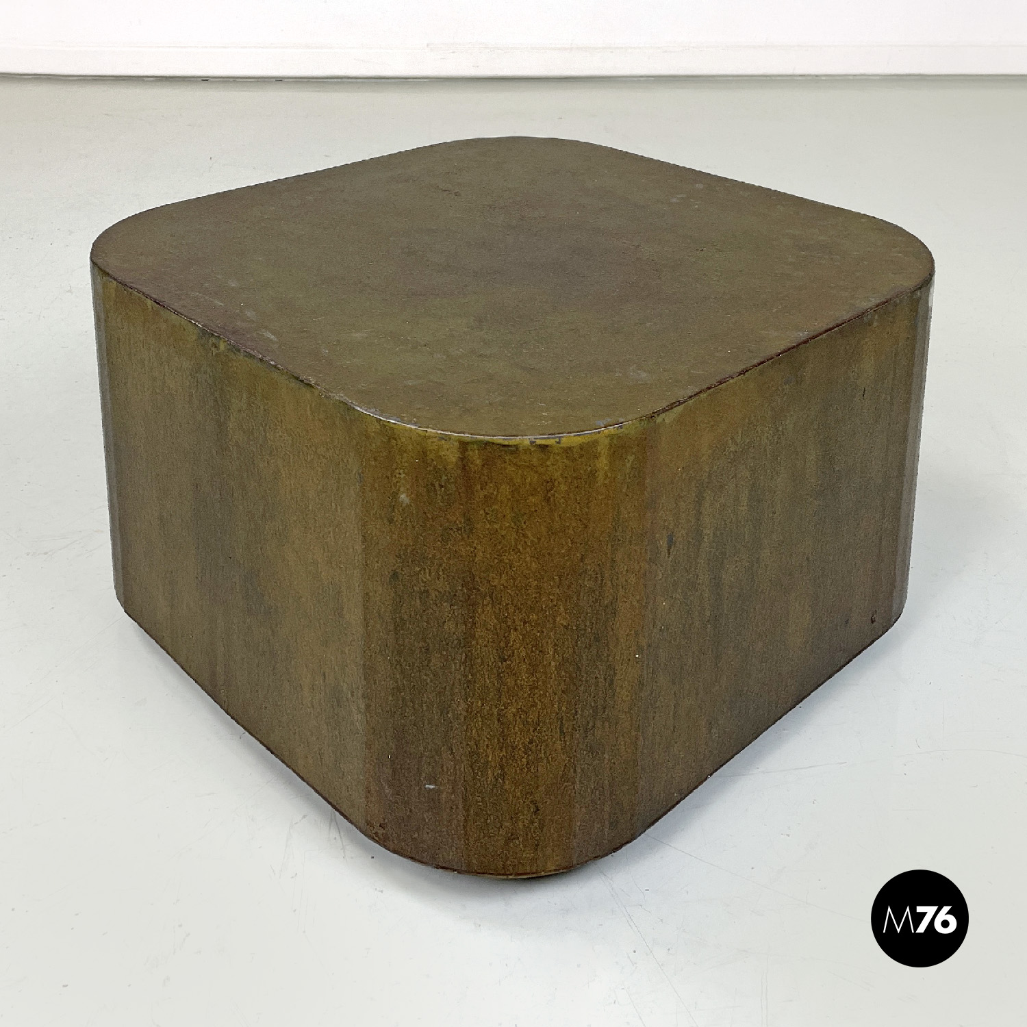 Tavolo da caffè o piedistallo in acciaio Corten con base quadrata. Gli angoli sono stondati, presenta una base leggermente più piccola rispetto alla struttura principale. Utilizzabile anche in un ambiente esterno come un giardino o un terrazzo.